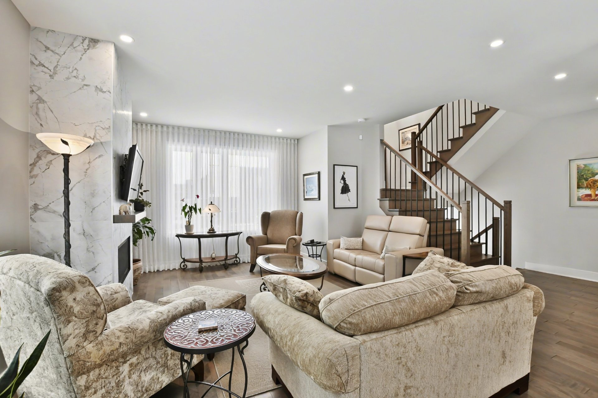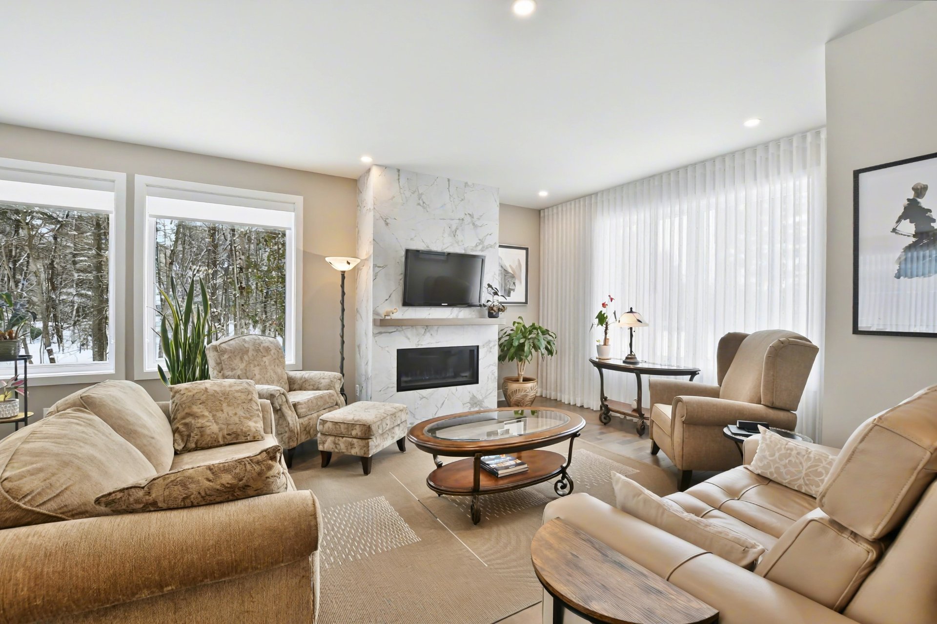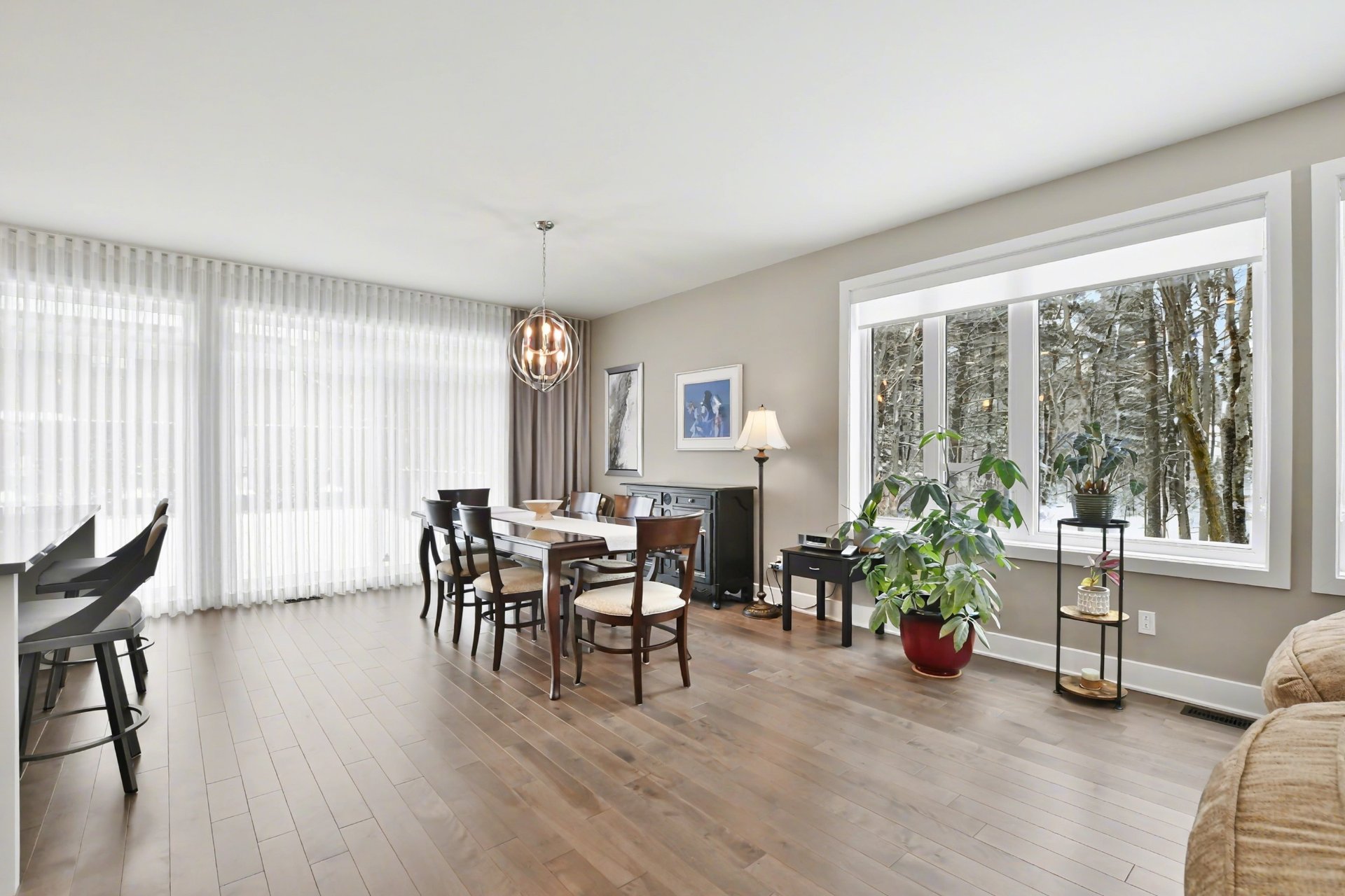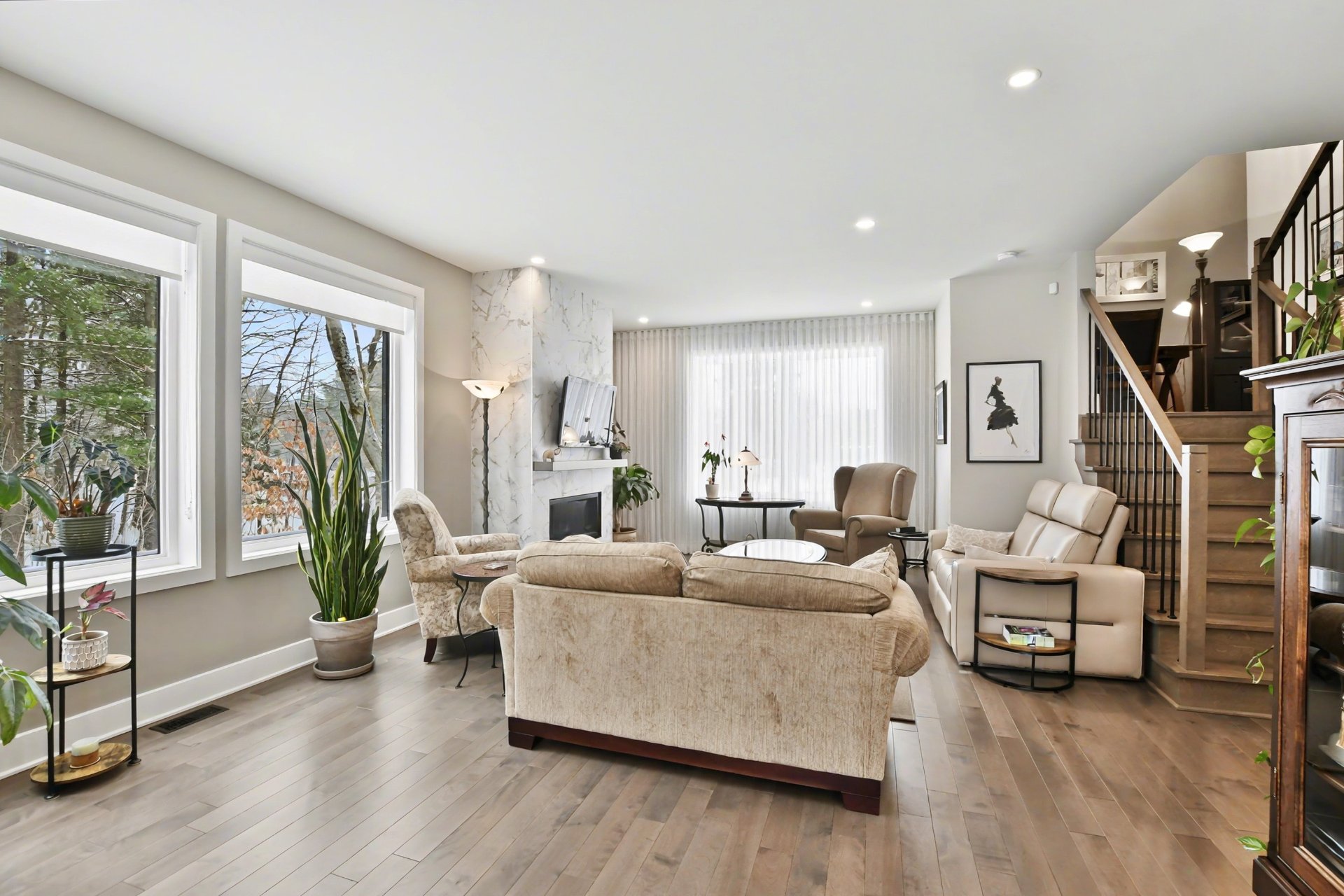 Le rez-de-chaussée propose un espace de vie lumineux et élégant, mis en valeur par de grandes fenêtres offrant une vue directe sur le boisé et des plafonds de 9 pieds. La cuisine se distingue par ses comptoirs de quartz, son design contemporain et sa fonctionnalité optimale. Le salon, chaleureux et convivial, est agrémenté d'un foyer au gaz, créant une ambiance raffinée et confortable en toute saison.