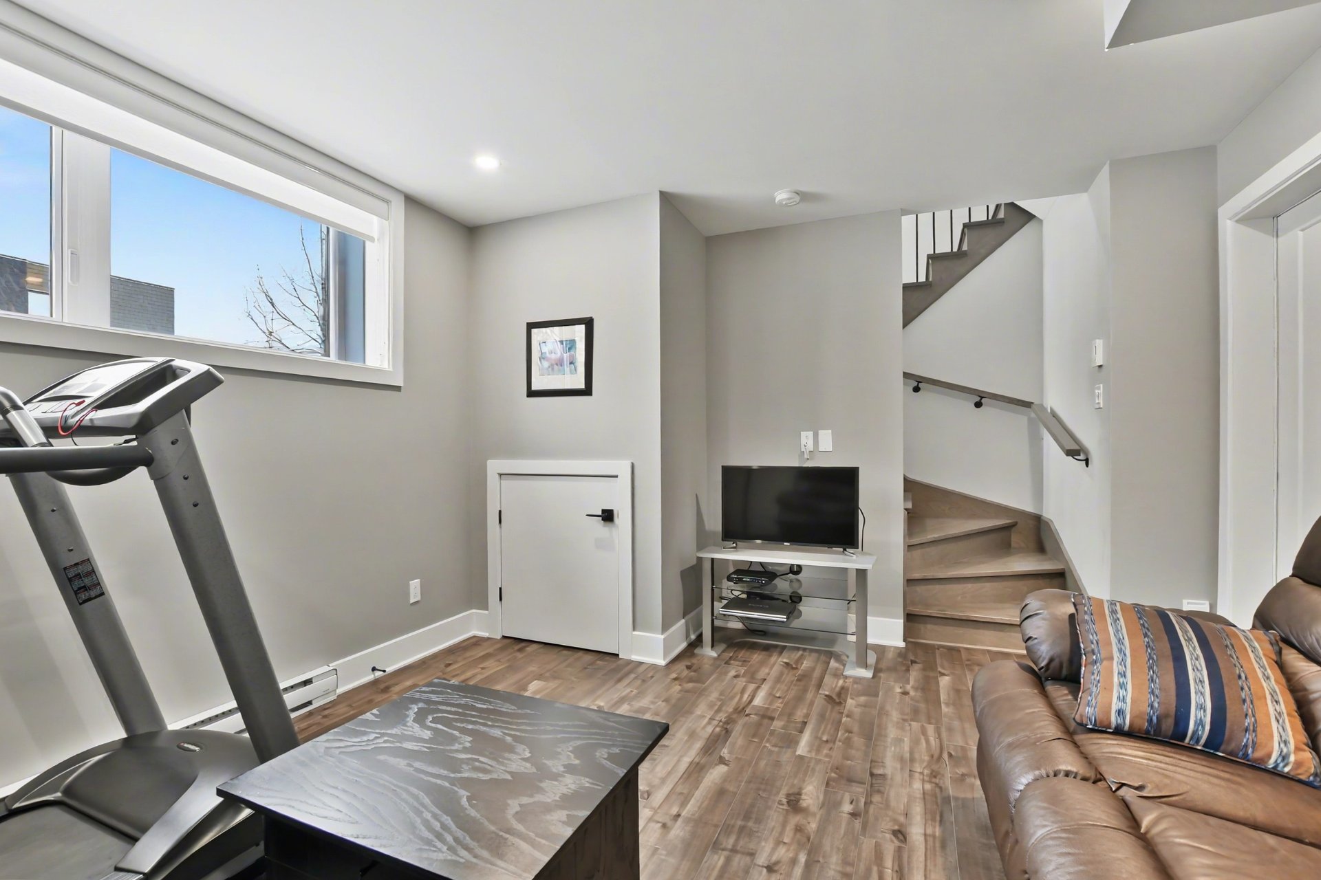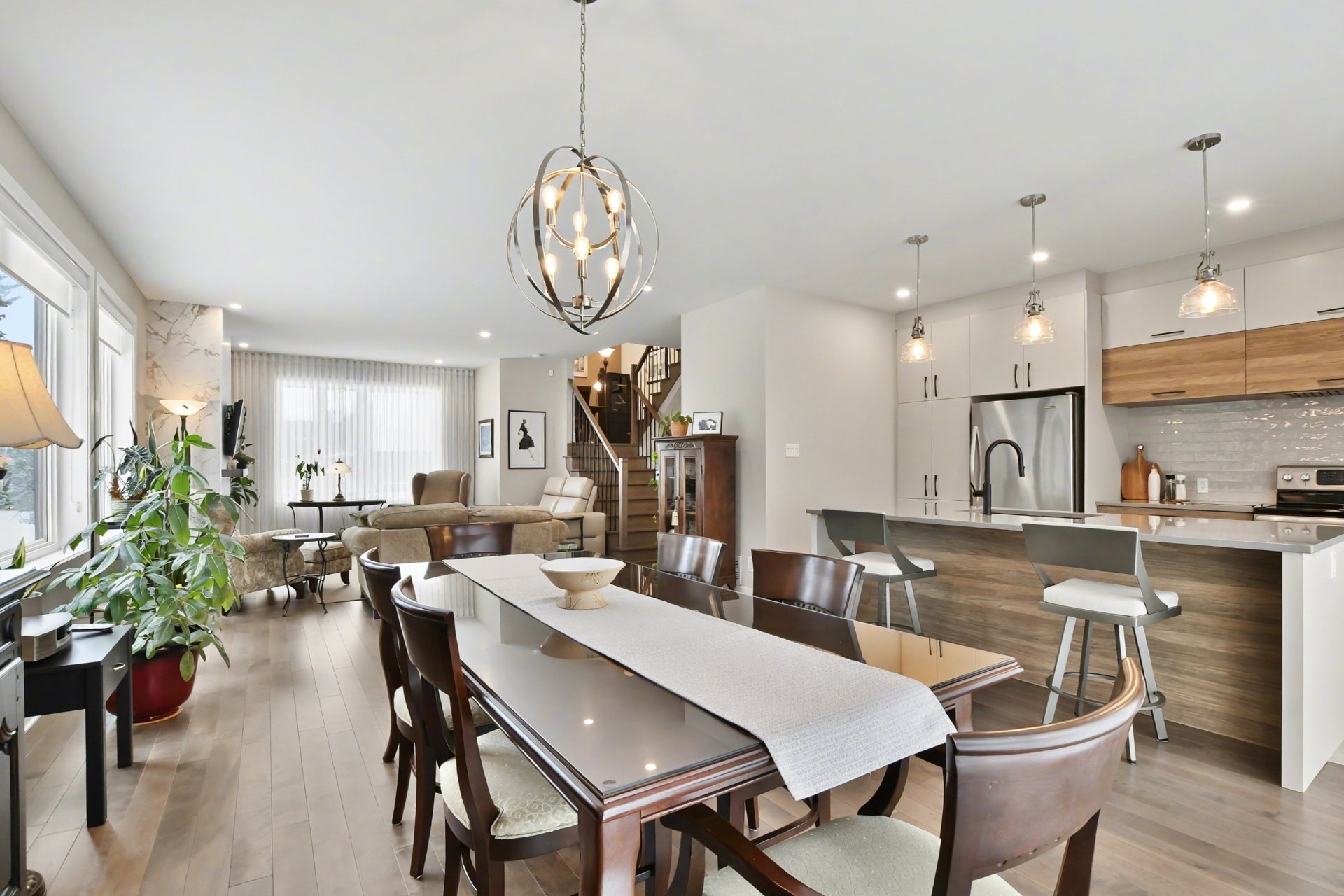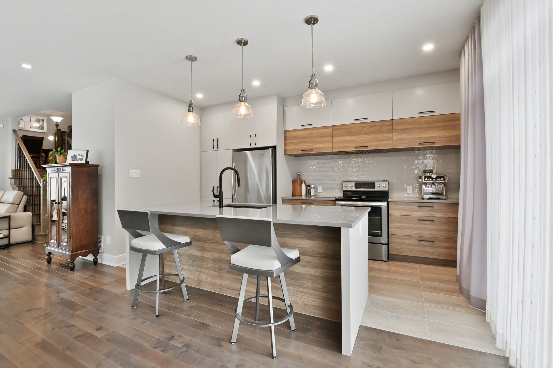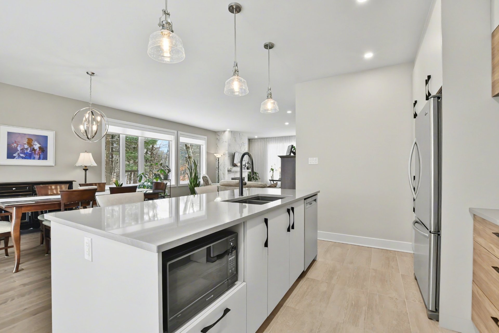 Le rez-de-chaussée propose un espace de vie lumineux et élégant, mis en valeur par de grandes fenêtres offrant une vue directe sur le boisé et des plafonds de 9 pieds. La cuisine se distingue par ses comptoirs de quartz, son design contemporain et sa fonctionnalité optimale. Le salon, chaleureux et convivial, est agrémenté d'un foyer au gaz, créant une ambiance raffinée et confortable en toute saison.