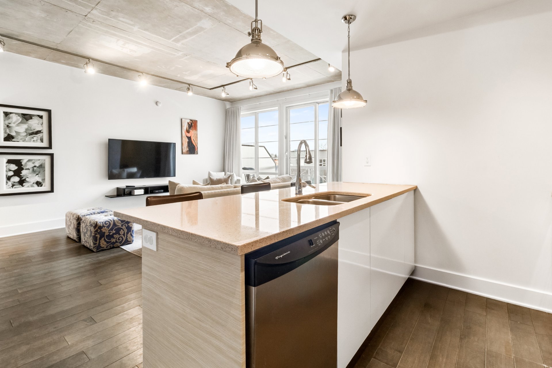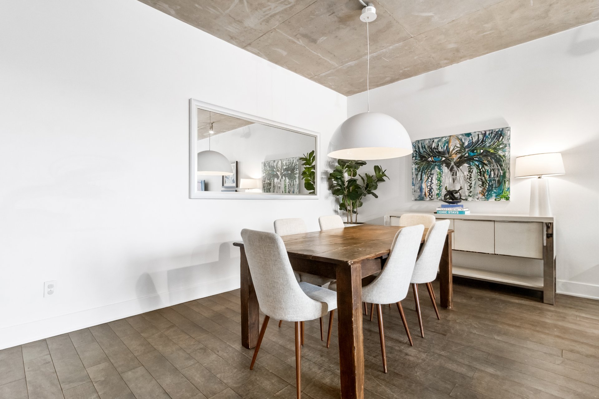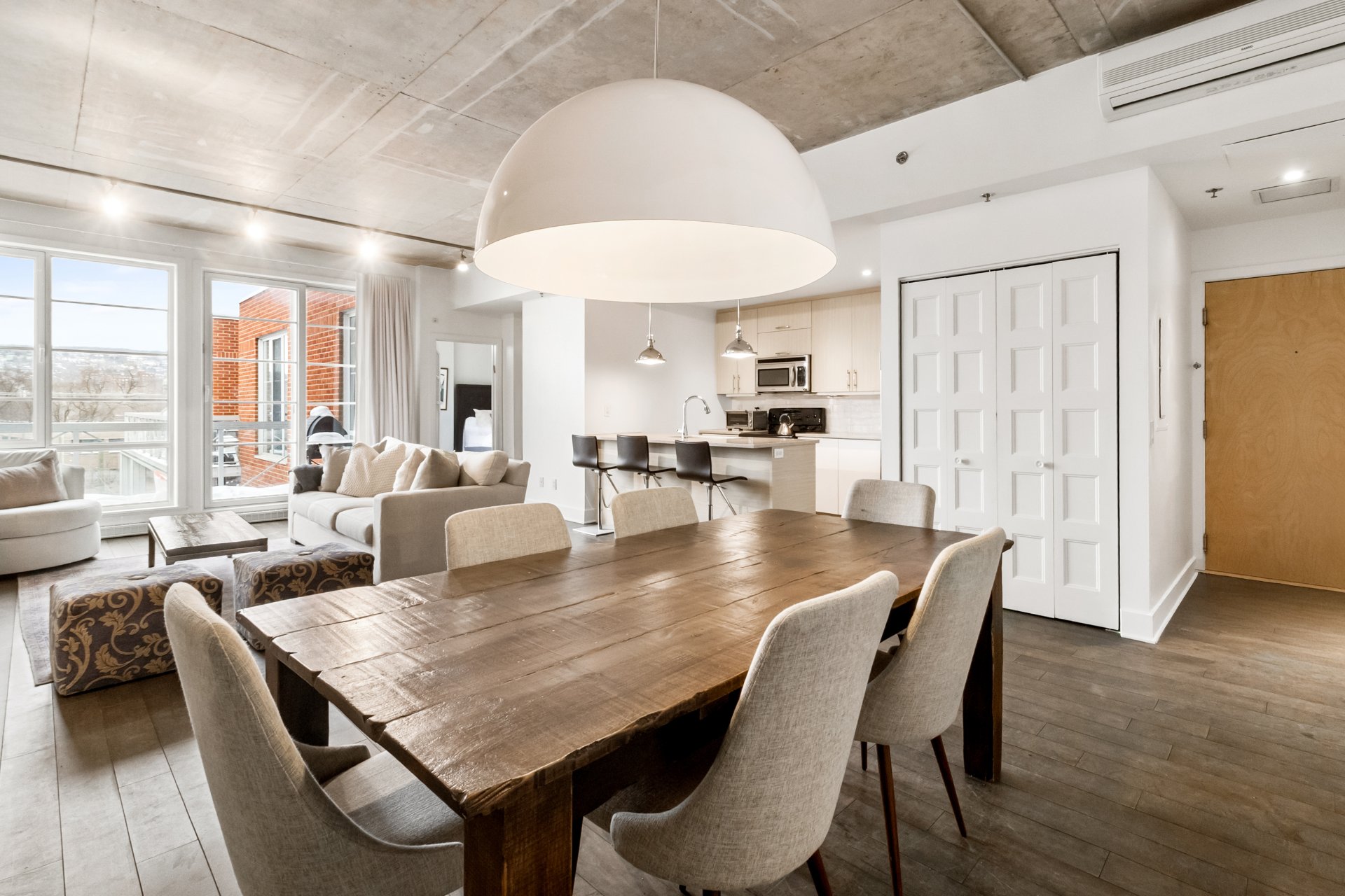 QUAI DES ÉCLUSIERS PHASE 4, Unité rénovée au design actuel, offrant une aire de vie ouverte baignée de lumière, des lattes de bois et des plafonds en béton de 10 pi. Cuisine avec îlot central et comptoirs en quartz. Une chambre avec walk-in. Salle de bains complète avec douche et bain séparés. Climatisation murale. Grande terrasse privée, garage inclus. Adresse recherchée au coeur de Saint-Henri, à distance de marche du Marché Atwater, du canal de Lachine, des parcs, des terrains de tennis, des restaurants, cafés et commerces. Accès facile aux métros Place-Saint-Henri et Lionel-Groulx. Rue Notre-Dame à votre porte.