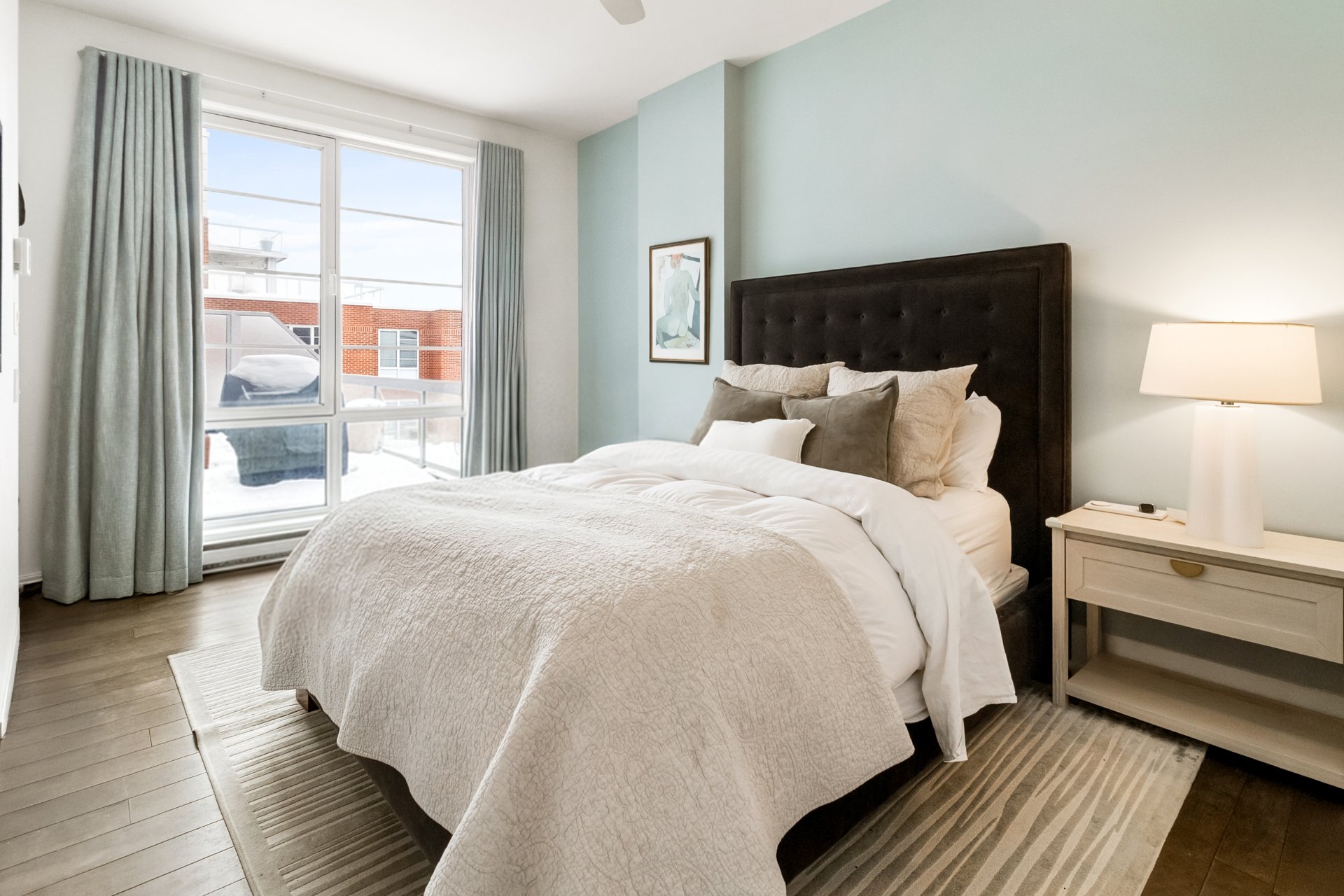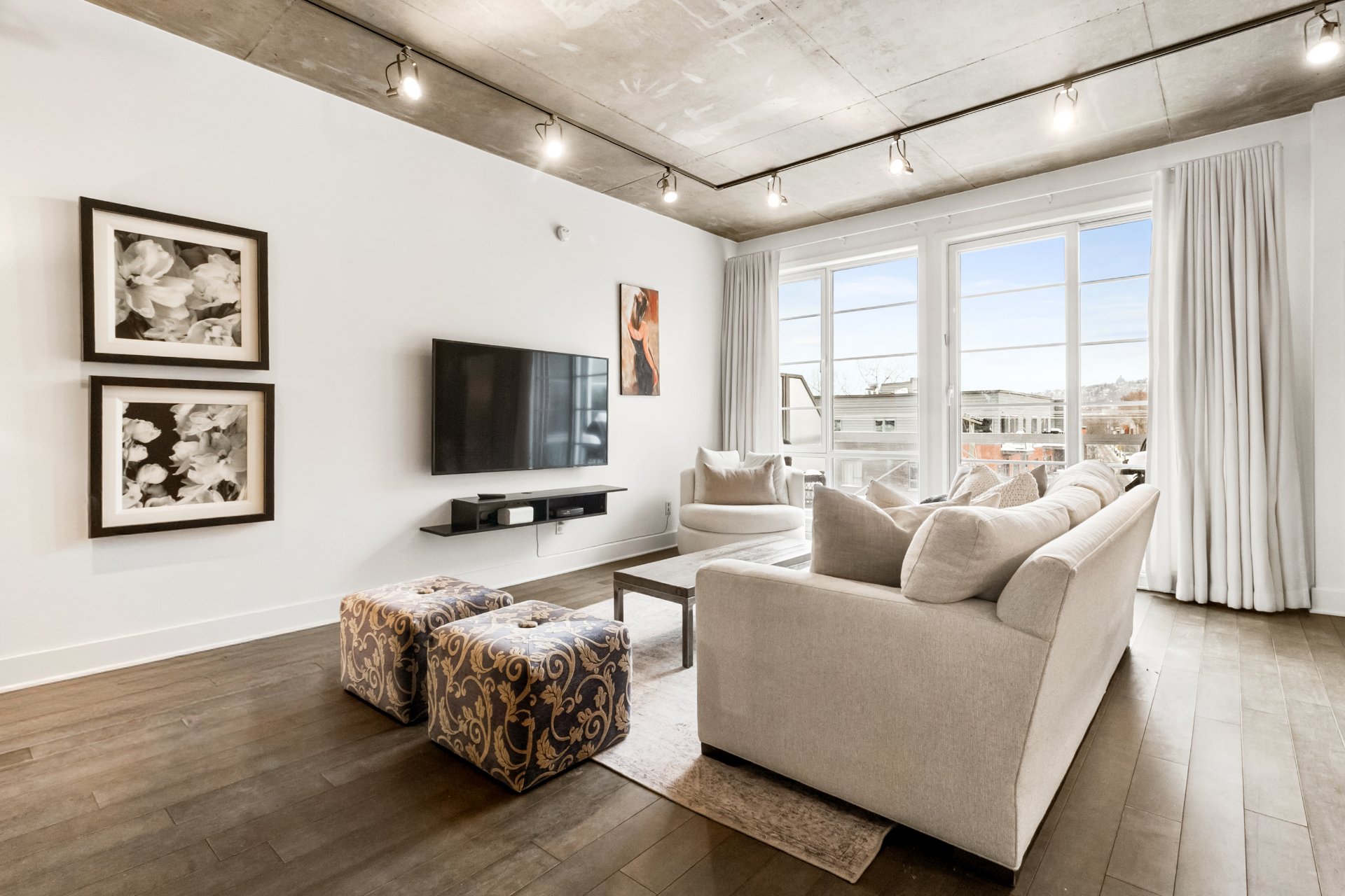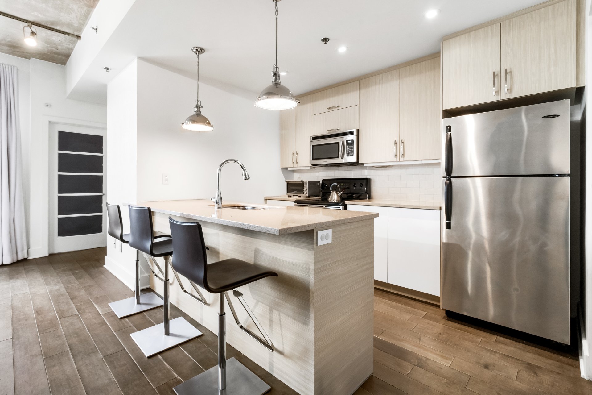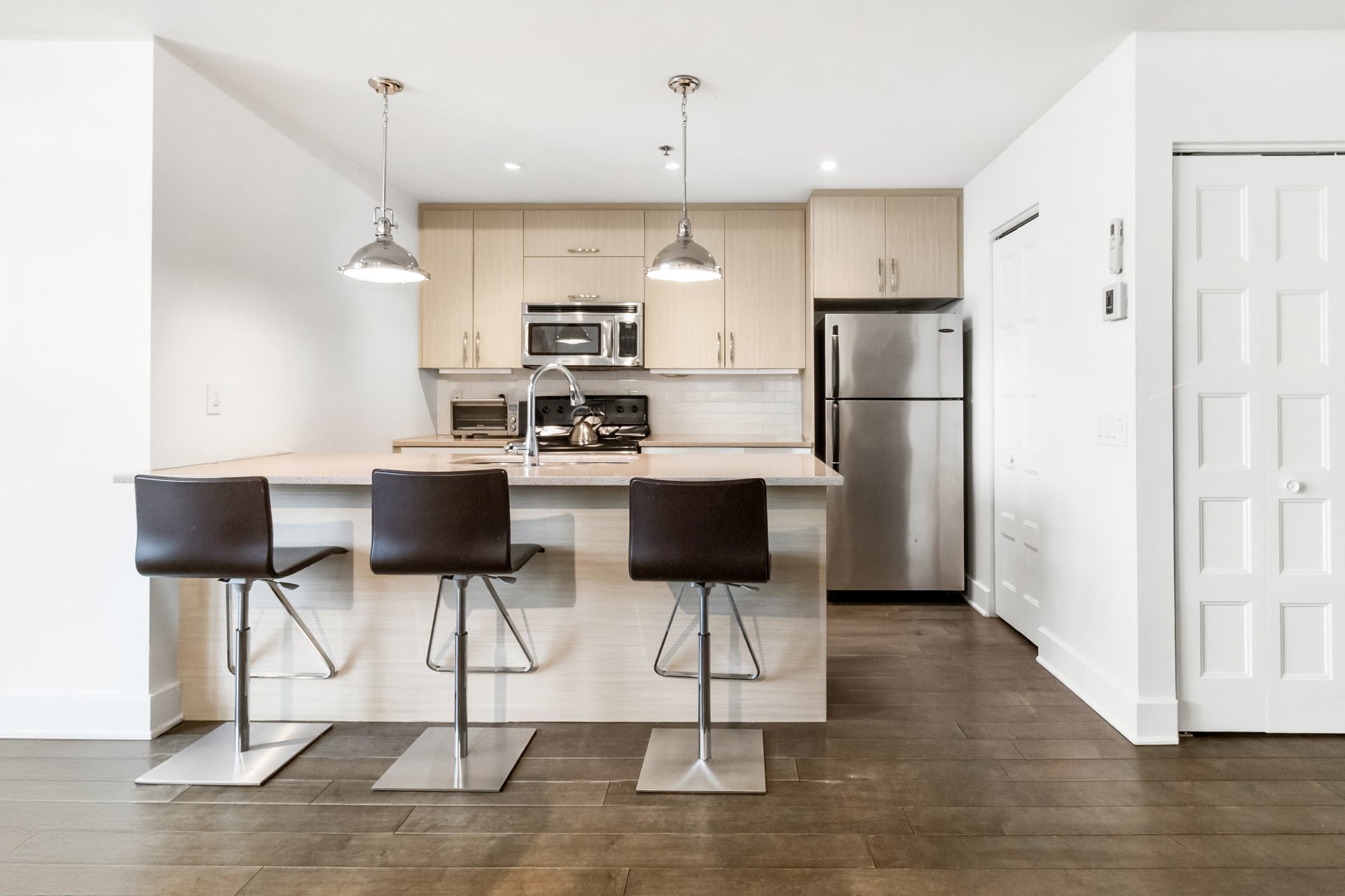 QUAI DES ÉCLUSIERS PHASE 4, Unité rénovée au design actuel, offrant une aire de vie ouverte baignée de lumière, des lattes de bois et des plafonds en béton de 10 pi. Cuisine avec îlot central et comptoirs en quartz. Une chambre avec walk-in. Salle de bains complète avec douche et bain séparés. Climatisation murale. Grande terrasse privée, garage inclus. Adresse recherchée au coeur de Saint-Henri, à distance de marche du Marché Atwater, du canal de Lachine, des parcs, des terrains de tennis, des restaurants, cafés et commerces. Accès facile aux métros Place-Saint-Henri et Lionel-Groulx. Rue Notre-Dame à votre porte.