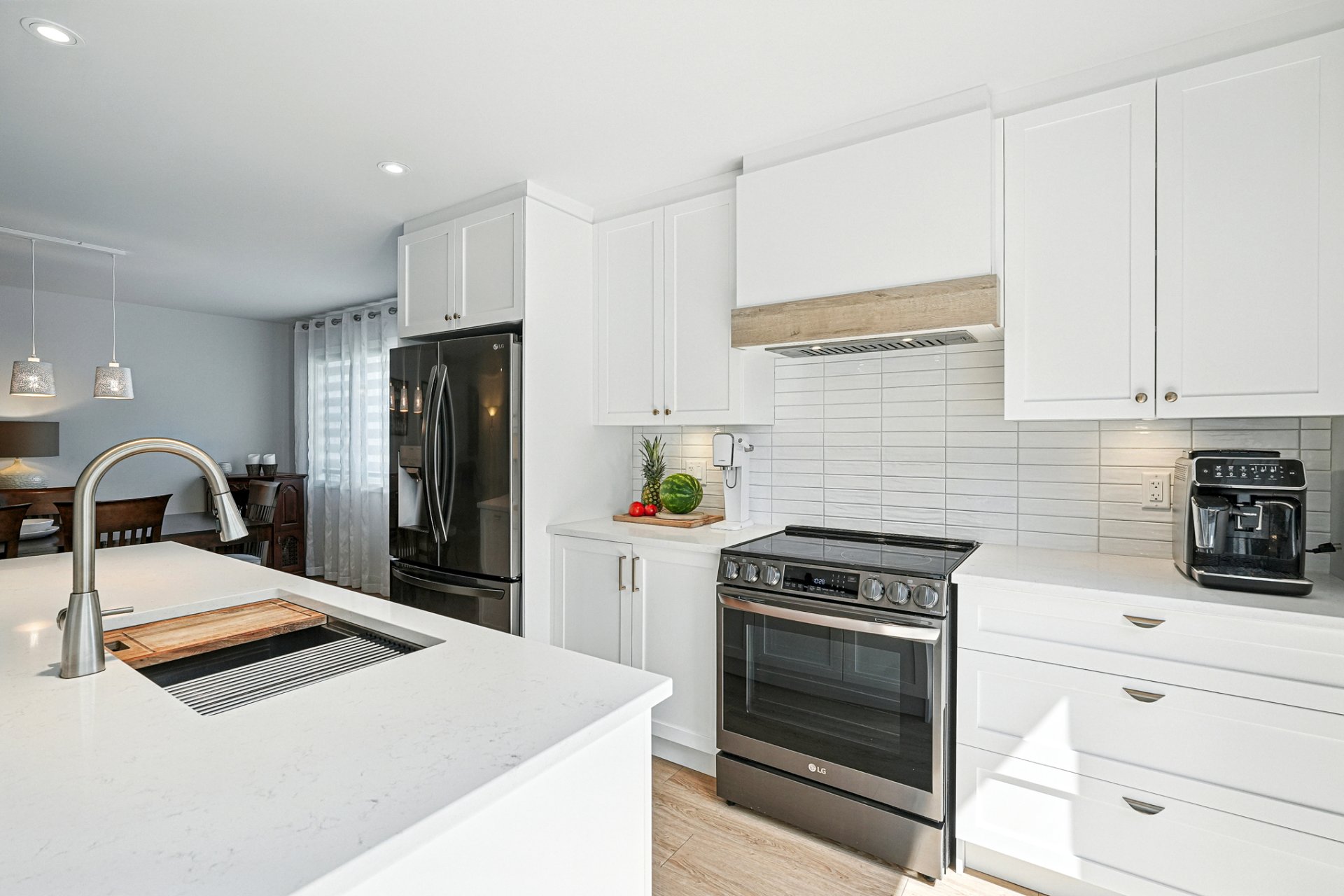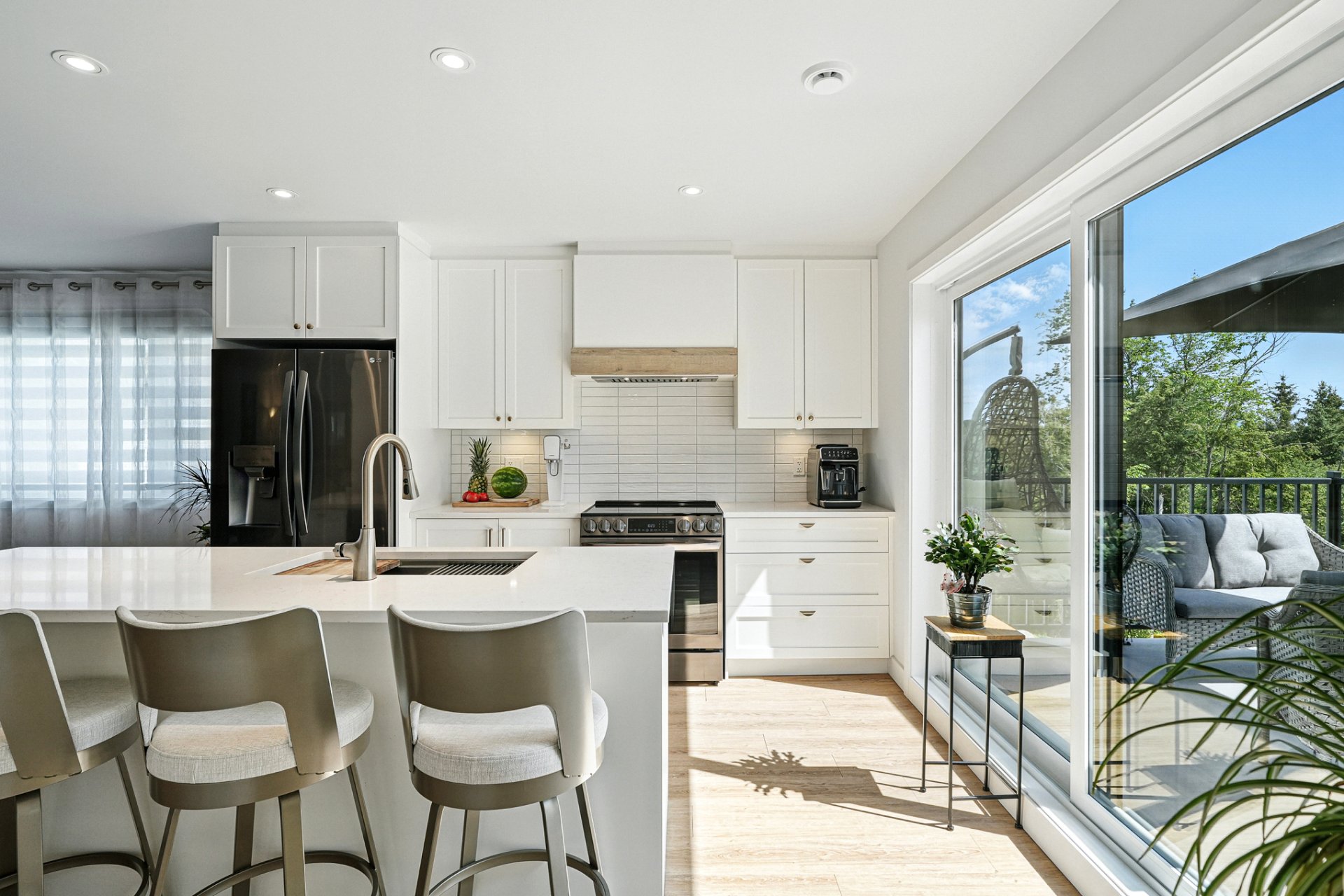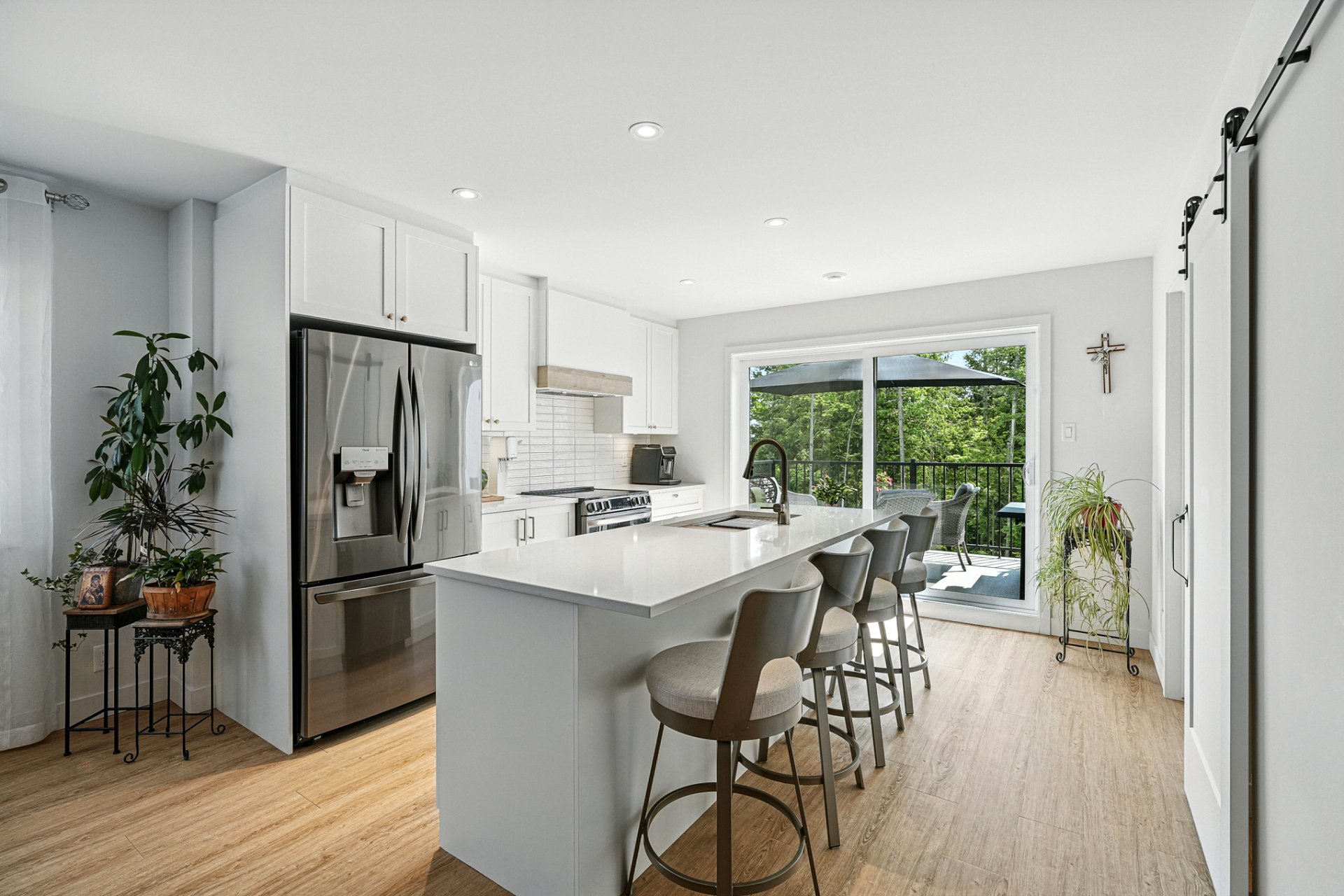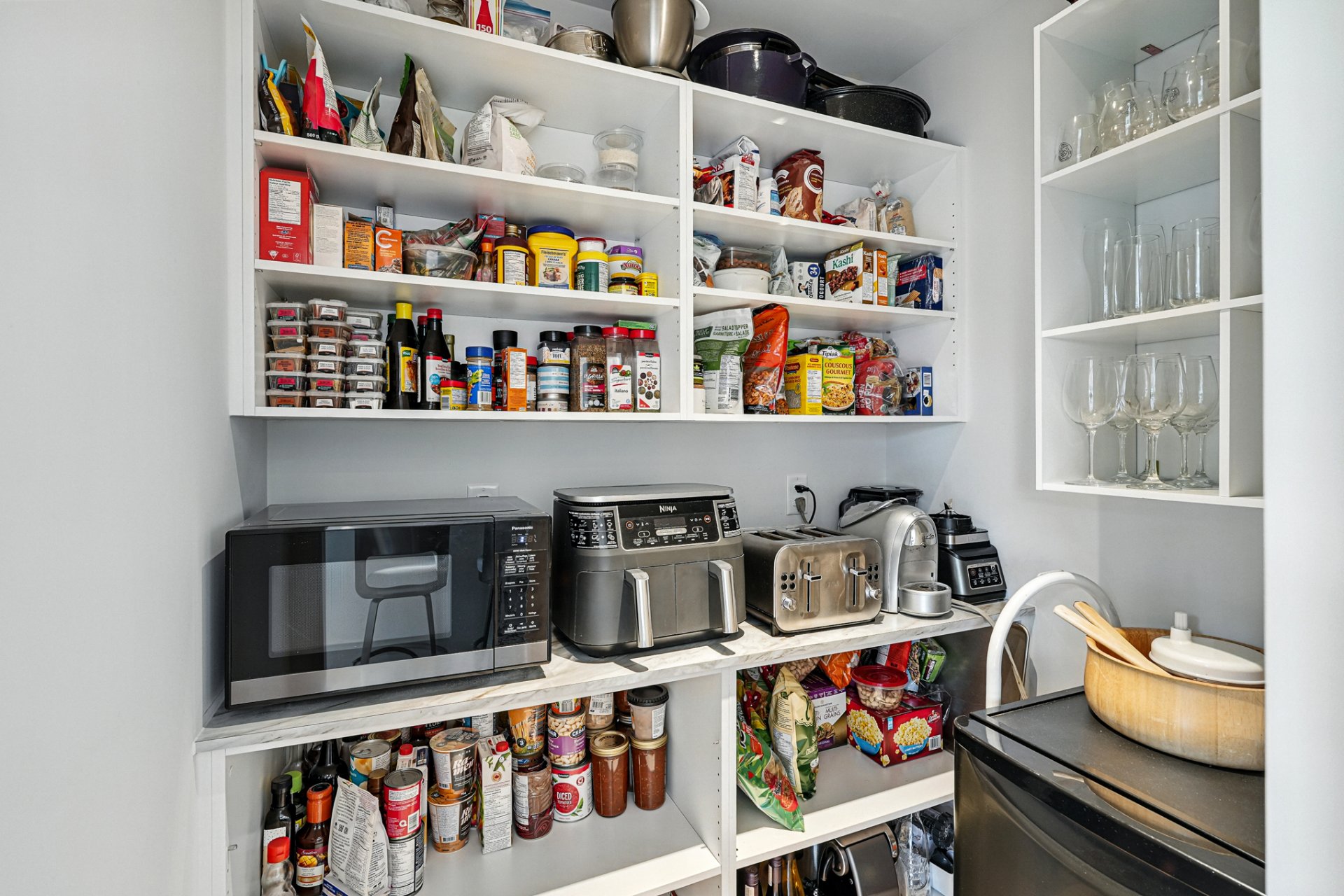 La cuisine moderne ravira les amateurs de gastronomie. Dotée d'un grand comptoir de travail, elle est à la fois fonctionnelle et élégante. Un des atouts majeurs de cette pièce est son garde-manger walk-in, vous offrant un vaste espace de rangement pour tous vos ingrédients, électroménagers et provisions. Ce détail pratique est souvent recherché et vous simplifiera le quotidien.