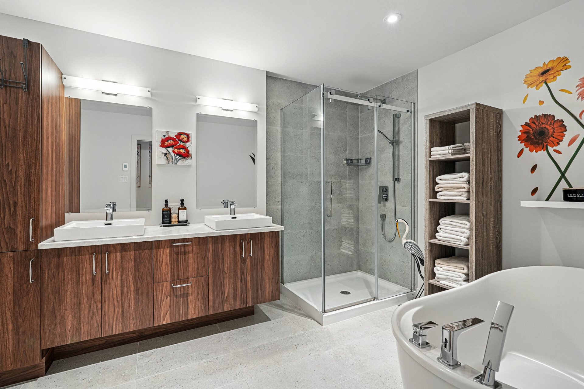 La salle de bains principale est moderne, épurée, et comprend une grande douche vitrée ainsi qu'un bain autoportant. Une salle d'eau indépendante comprenant l'espace laveuse/sécheuse complète les commodités de l'unité.