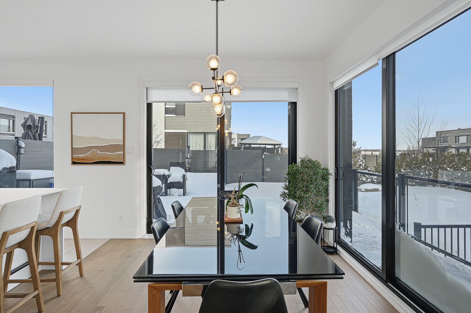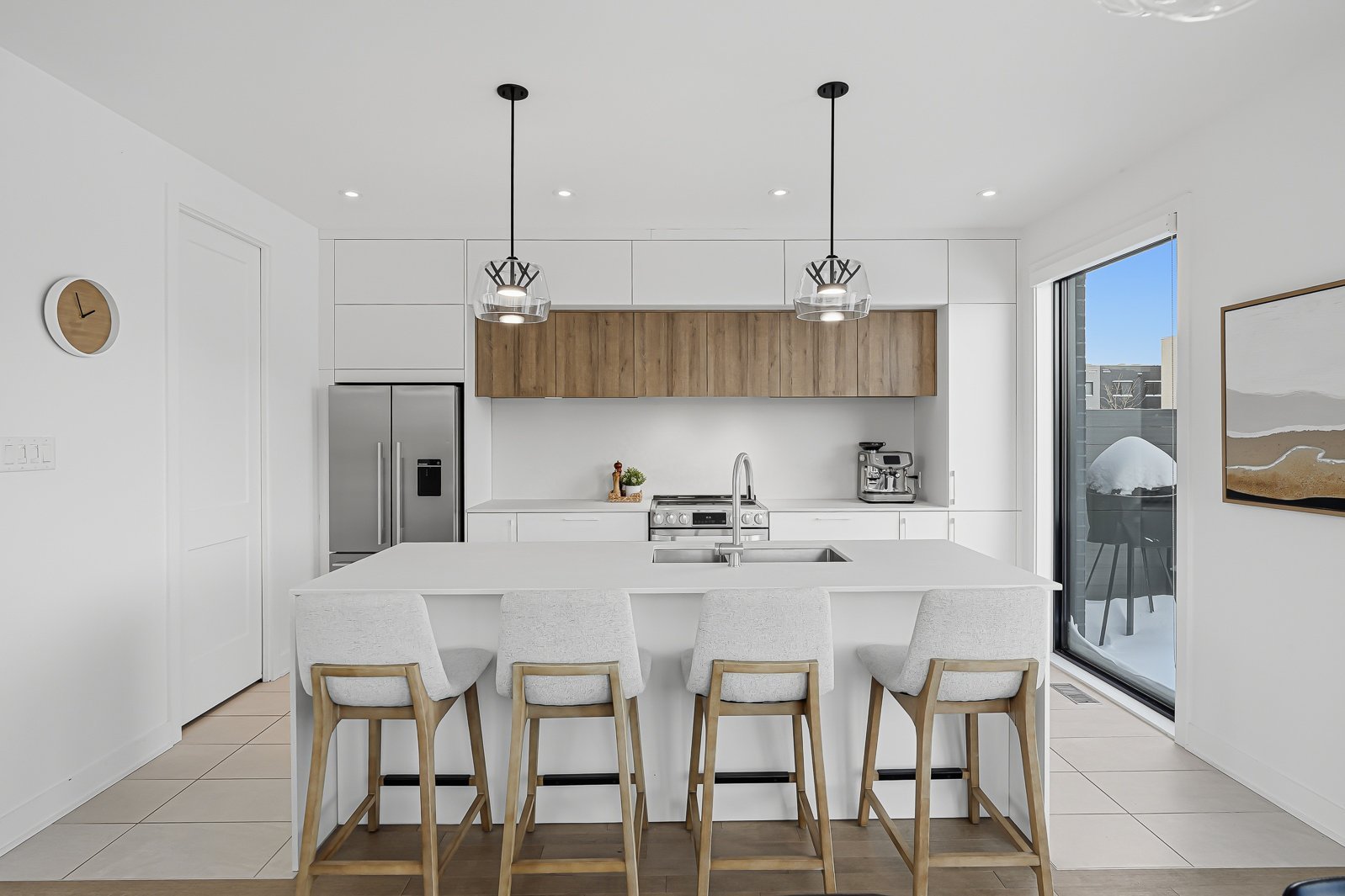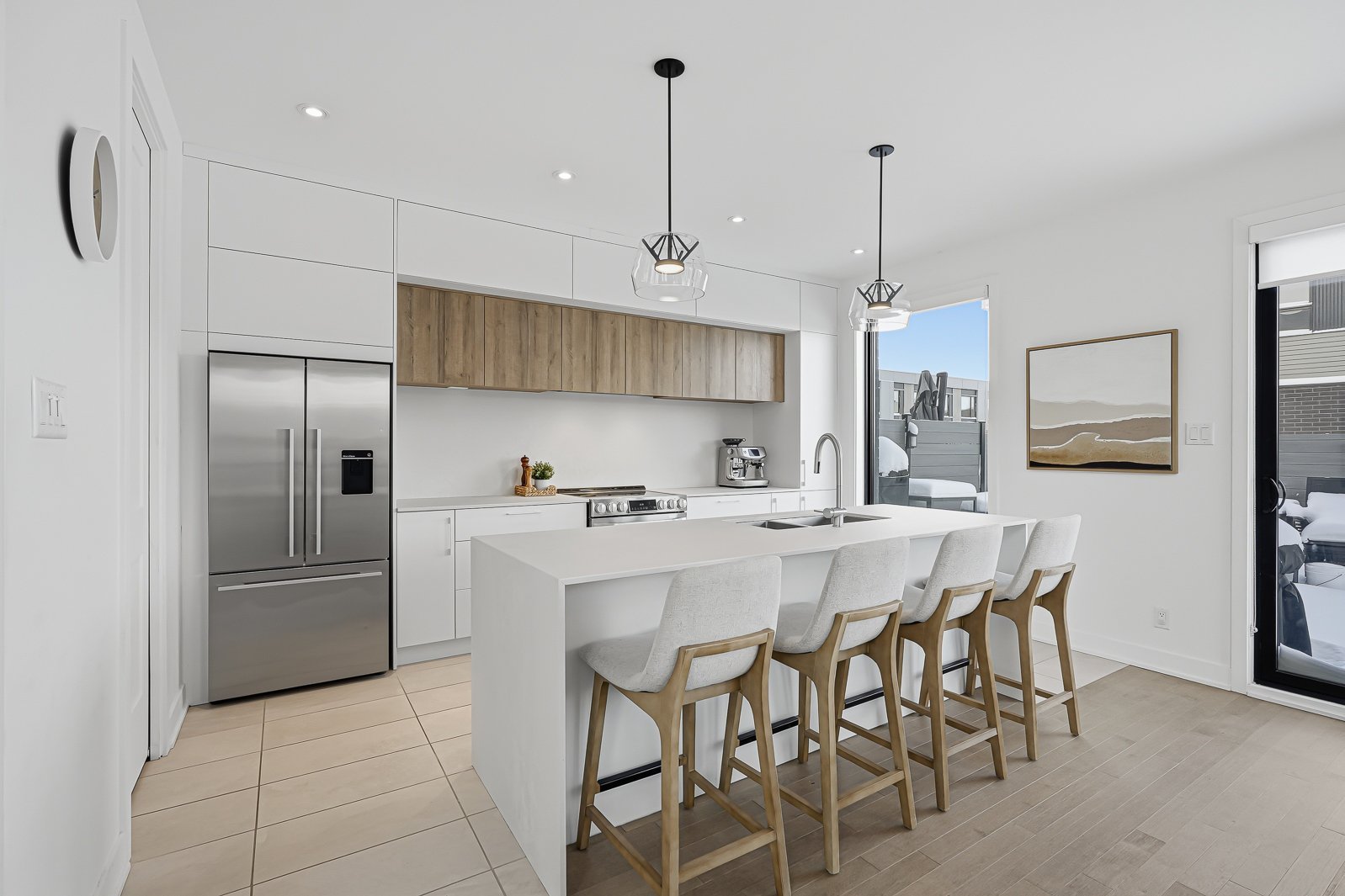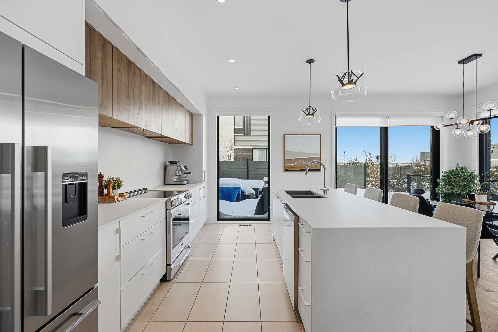 Située dans un secteur prisé de Sainte-Julie, cette maison de ville en coin se distingue par son design contemporain, sa luminosité exceptionnelle et ses volumes impressionnants. L'aire de vie à aire ouverte propose des plafonds de grande hauteur, une fenestration abondante et un escalier architectural avec garde-corps en verre. Le rez-de-chaussée comprend un bureau, idéal pour le télétravail ou un espace polyvalent selon les besoins. La cuisine moderne séduit par son vaste îlot, ses lignes épurées et ses matériaux de qualité. Les chambres offrent confort et polyvalence. Le garage double ajoute un atout pratique.