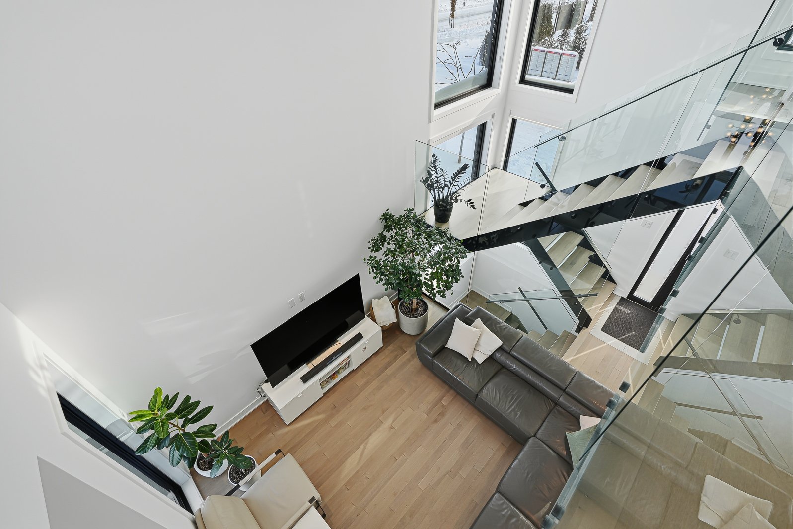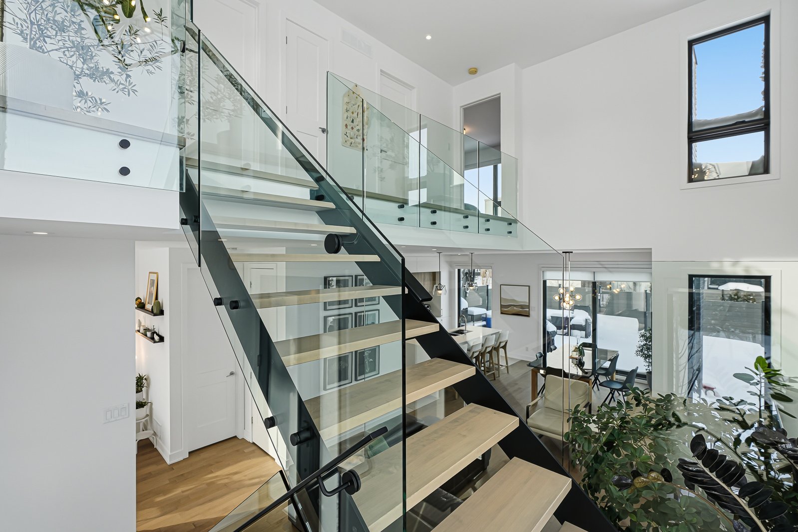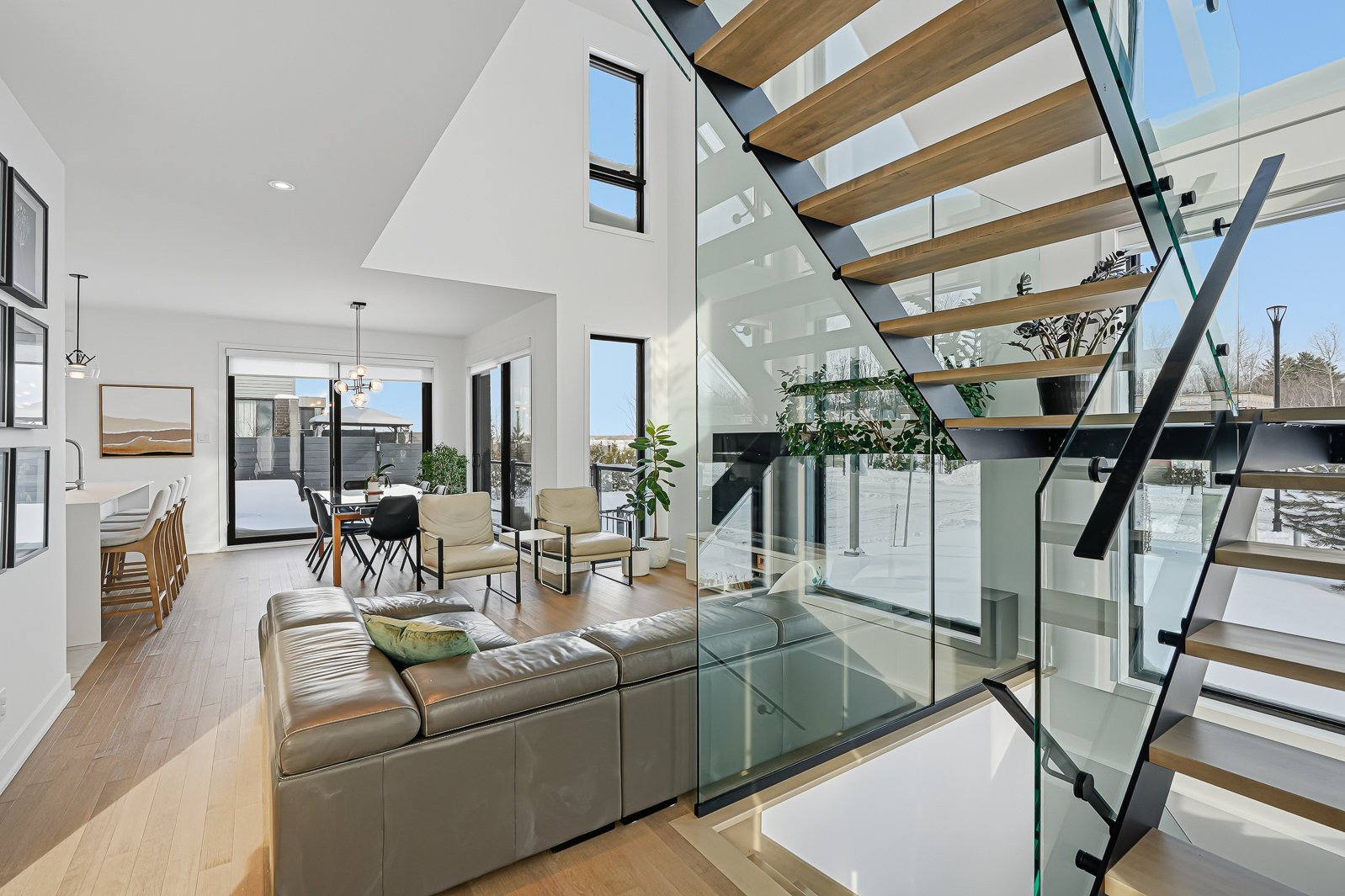 Dès l'entrée, on découvre une aire de vie à concept ouvert mettant en valeur de plafonds de grande hauteur et un spectaculaire escalier architectural avec garde-corps en verre, véritable pièce maîtresse qui confère un cachet moderne et raffiné à l'ensemble. Les matériaux de qualité et les lignes épurées créent une ambiance à la fois chaleureuse et actuelle, idéale pour recevoir ou profiter du quotidien.