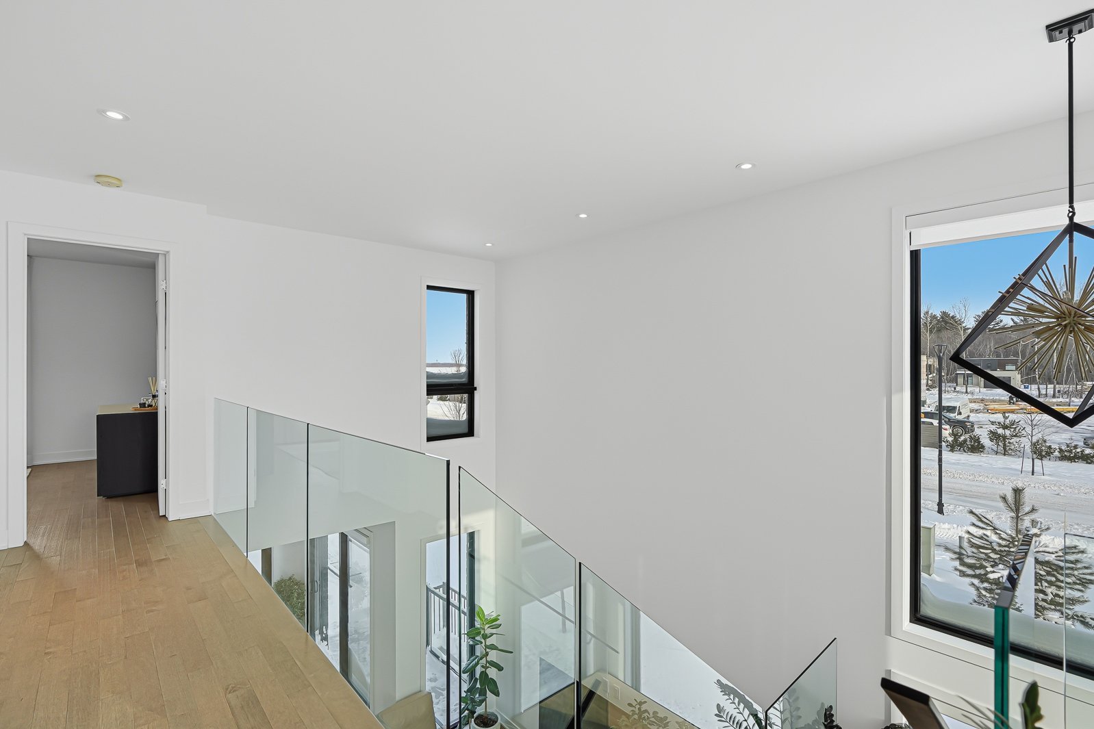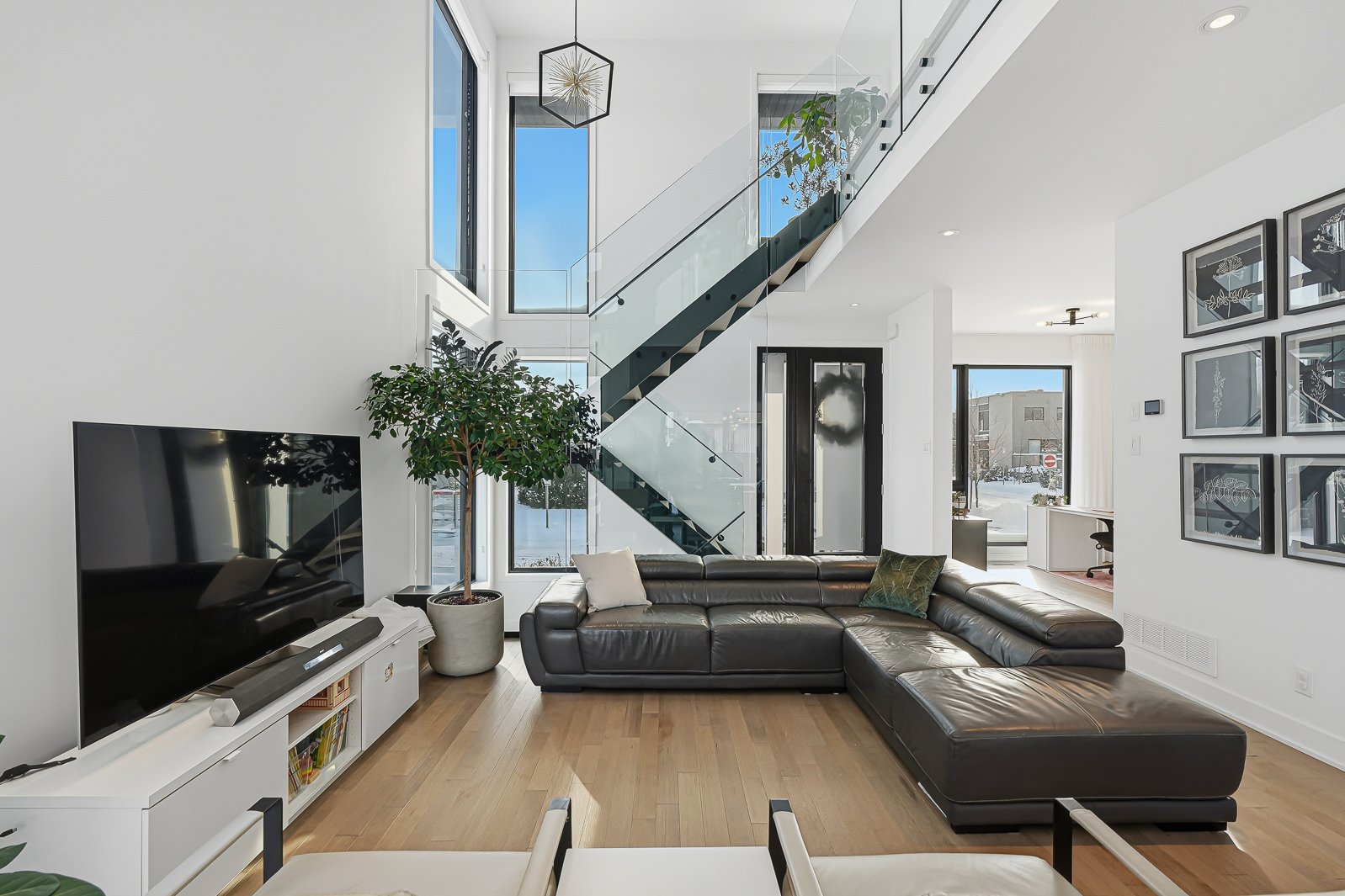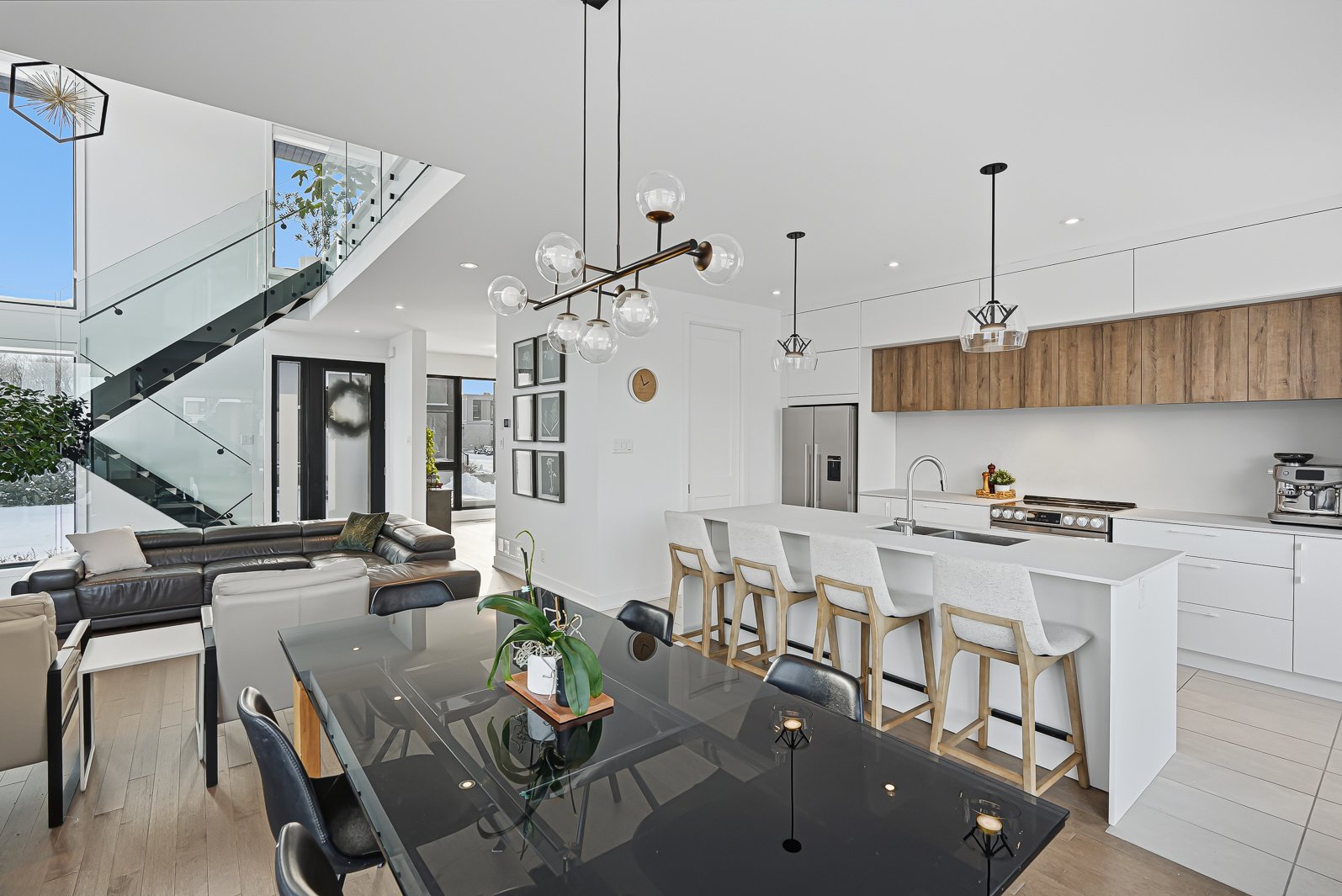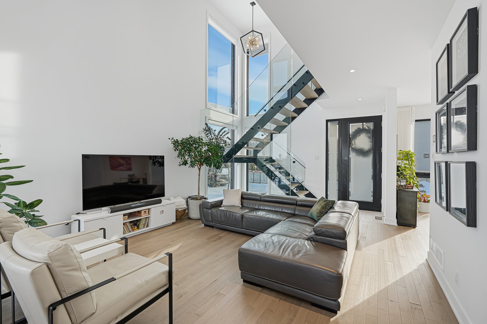 Dès l'entrée, on découvre une aire de vie à concept ouvert mettant en valeur de plafonds de grande hauteur et un spectaculaire escalier architectural avec garde-corps en verre, véritable pièce maîtresse qui confère un cachet moderne et raffiné à l'ensemble. Les matériaux de qualité et les lignes épurées créent une ambiance à la fois chaleureuse et actuelle, idéale pour recevoir ou profiter du quotidien.