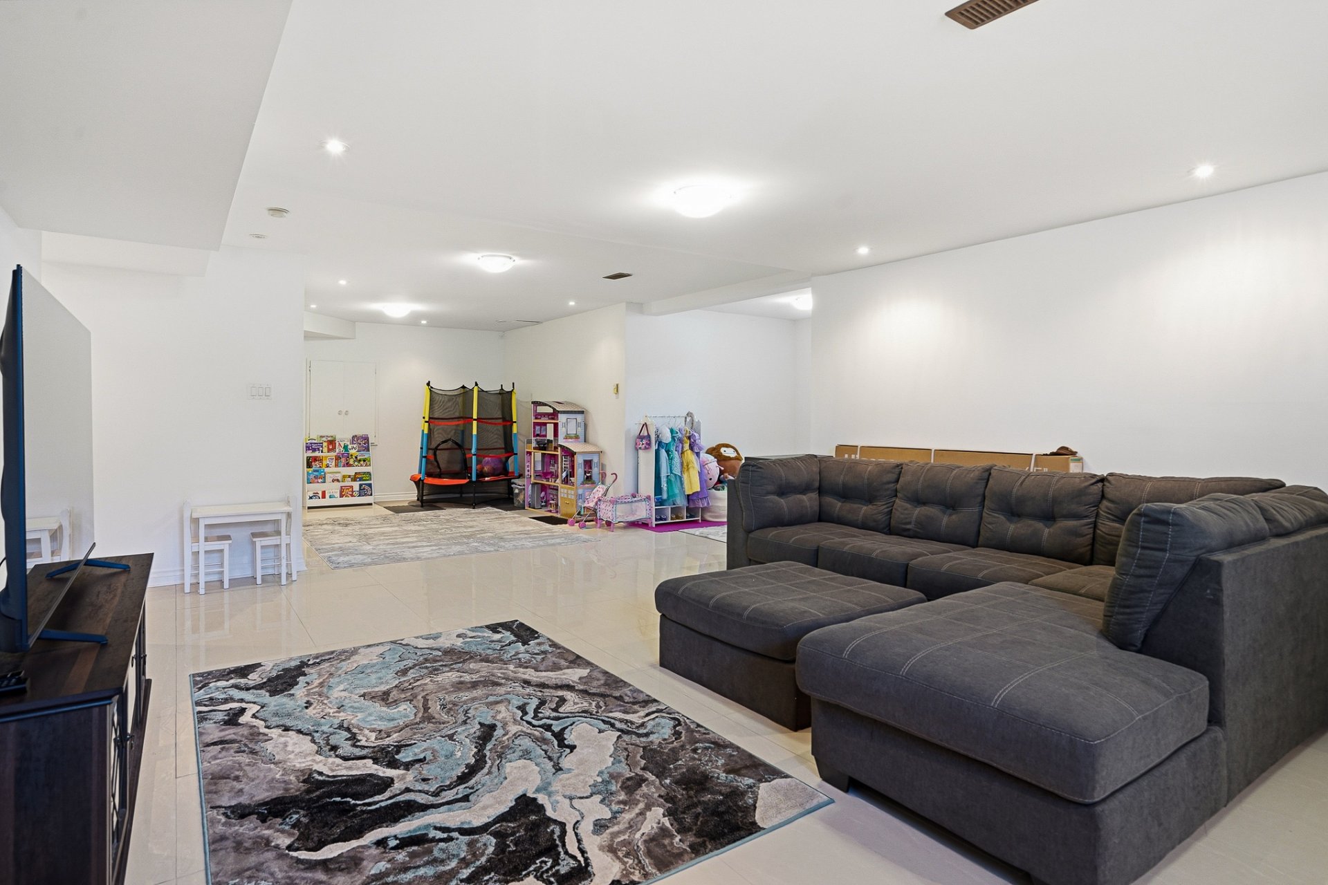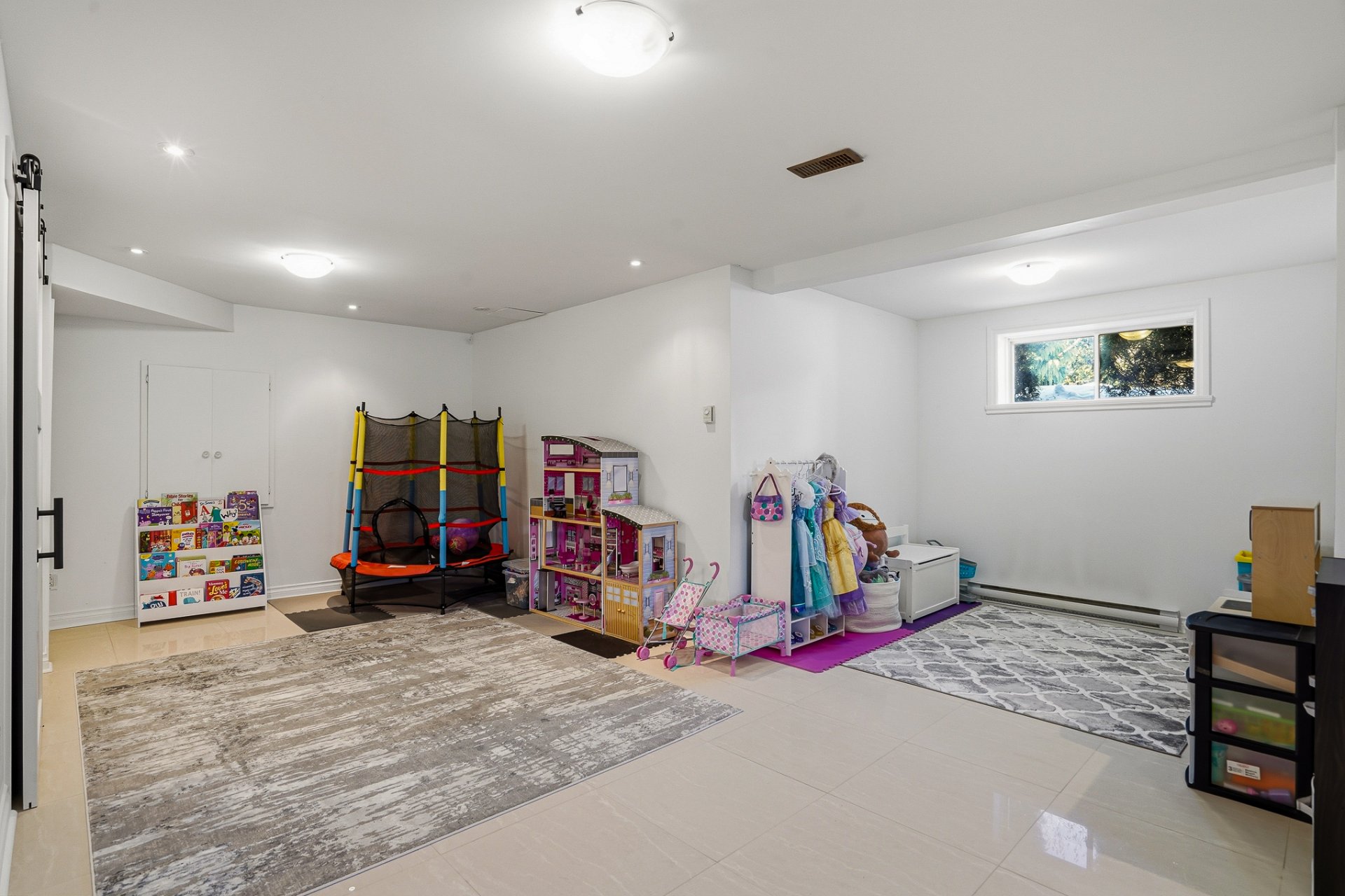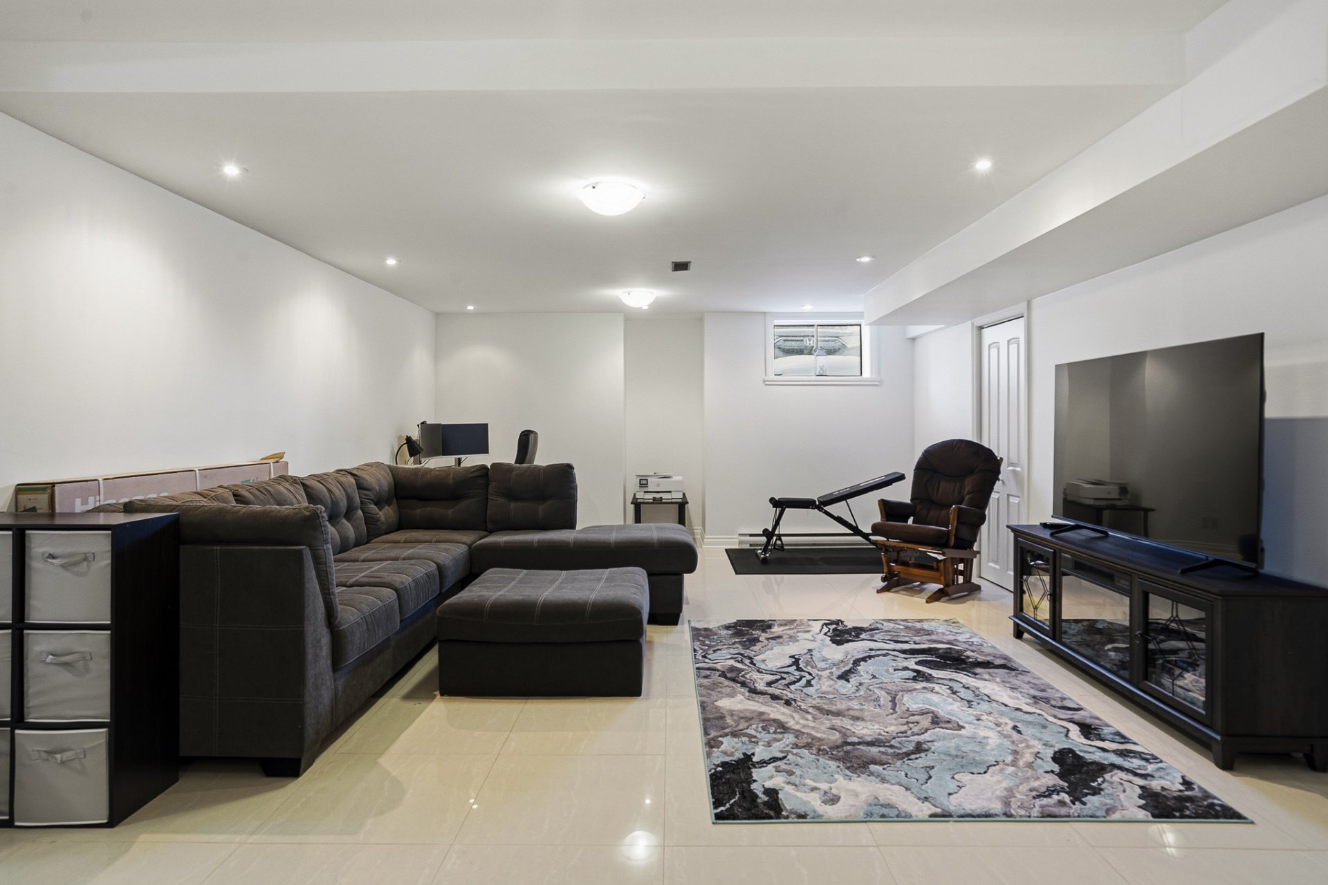 Le sous-sol aménagé comprend une grande salle familiale ou salle de jeux avec coin salon, une chambre à coucher, une salle de bains avec douche ainsi que des espaces de rangement supplémentaires.