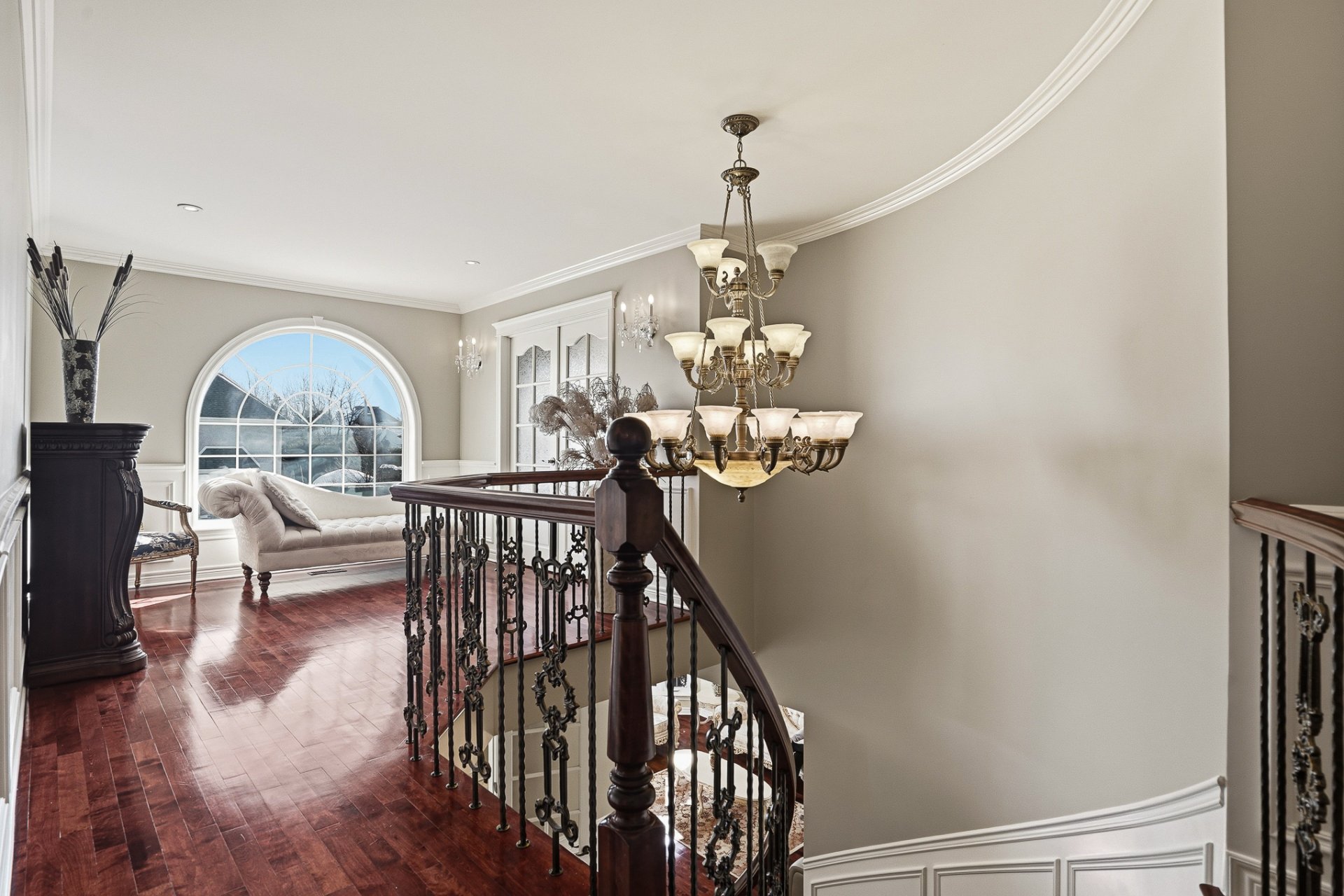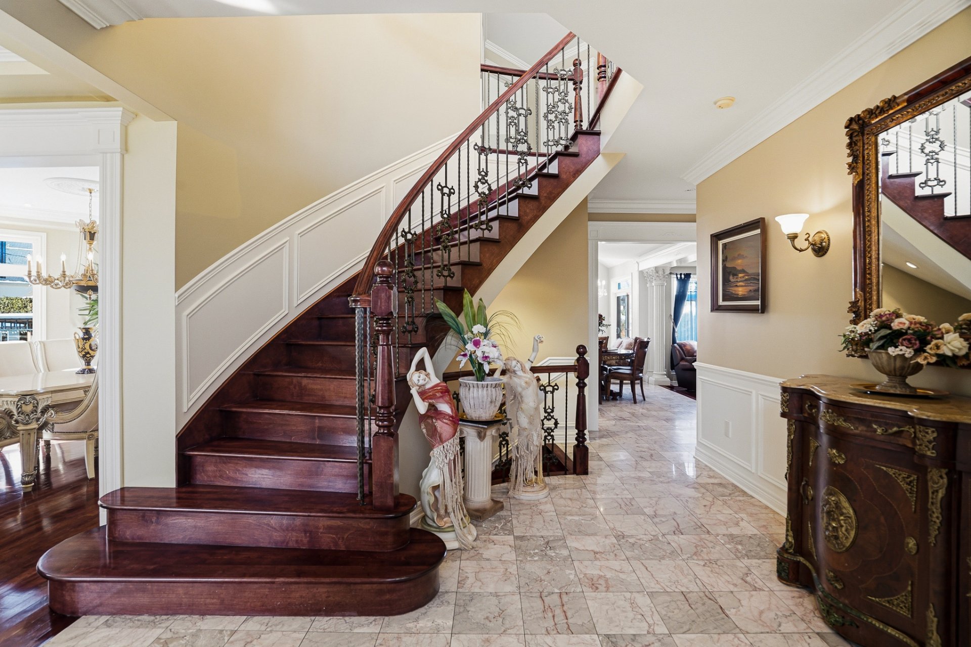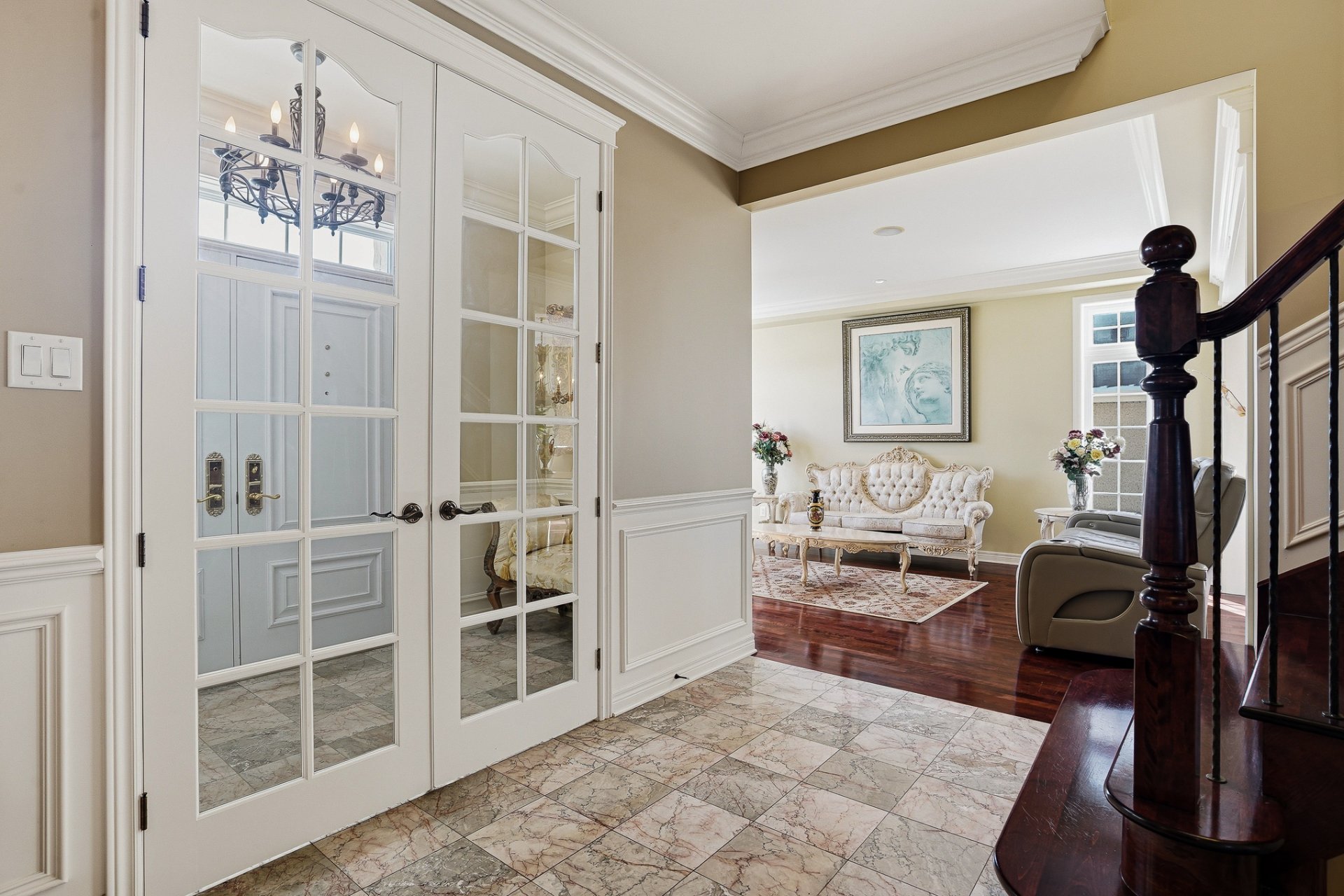 Un grand hall d'entrée fermé avec portes et rangement mène à l'aire principale, qui met en valeur un bel escalier central en bois et des plafonds hauts apportant une agréable impression d'espace. Les planchers en lattes et la généreuse fenestration contribuent à la luminosité et au confort des pièces.