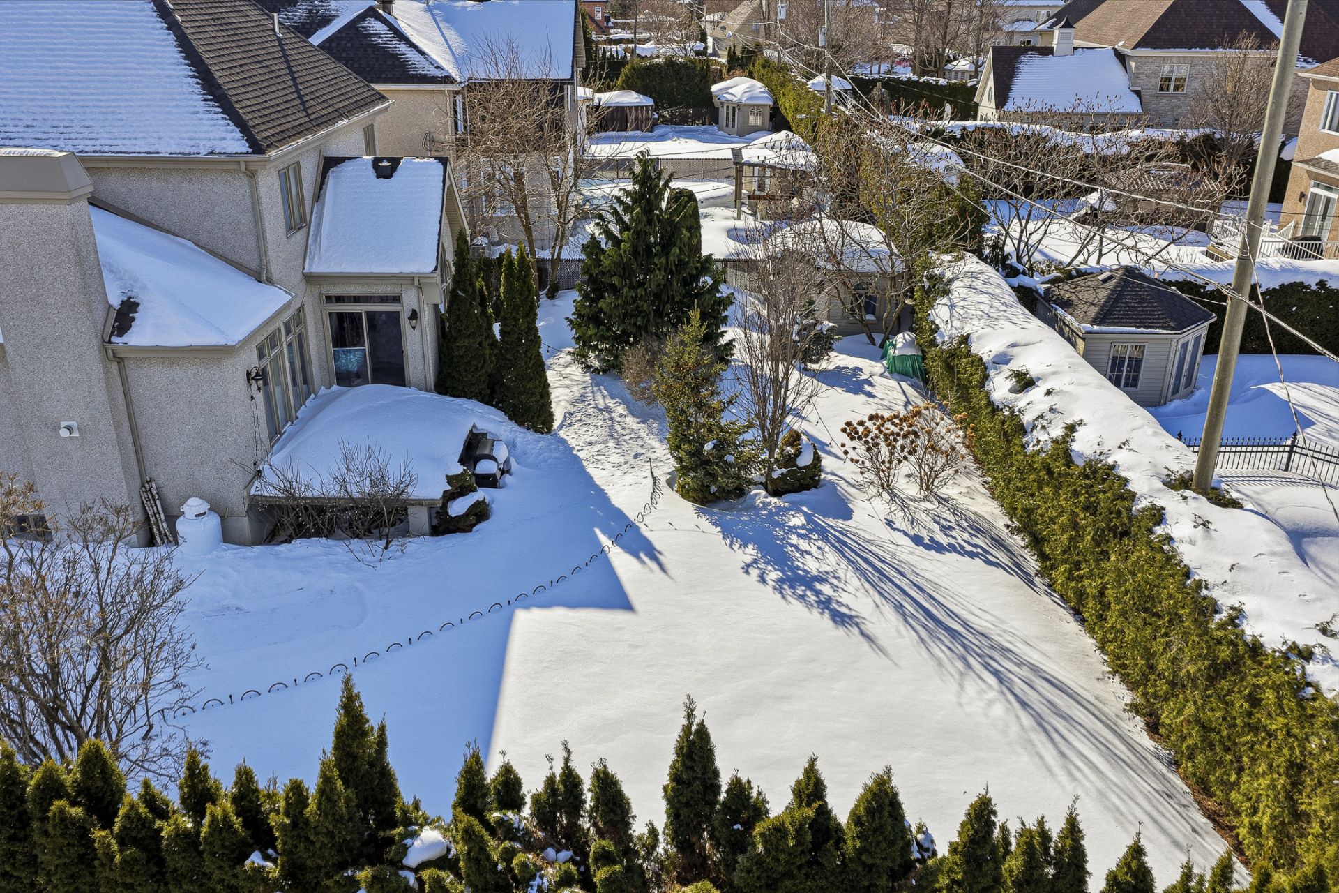 Le garage double et la cour arrière bordée de haies avec cabanon ajoutent aux avantages de la propriété.