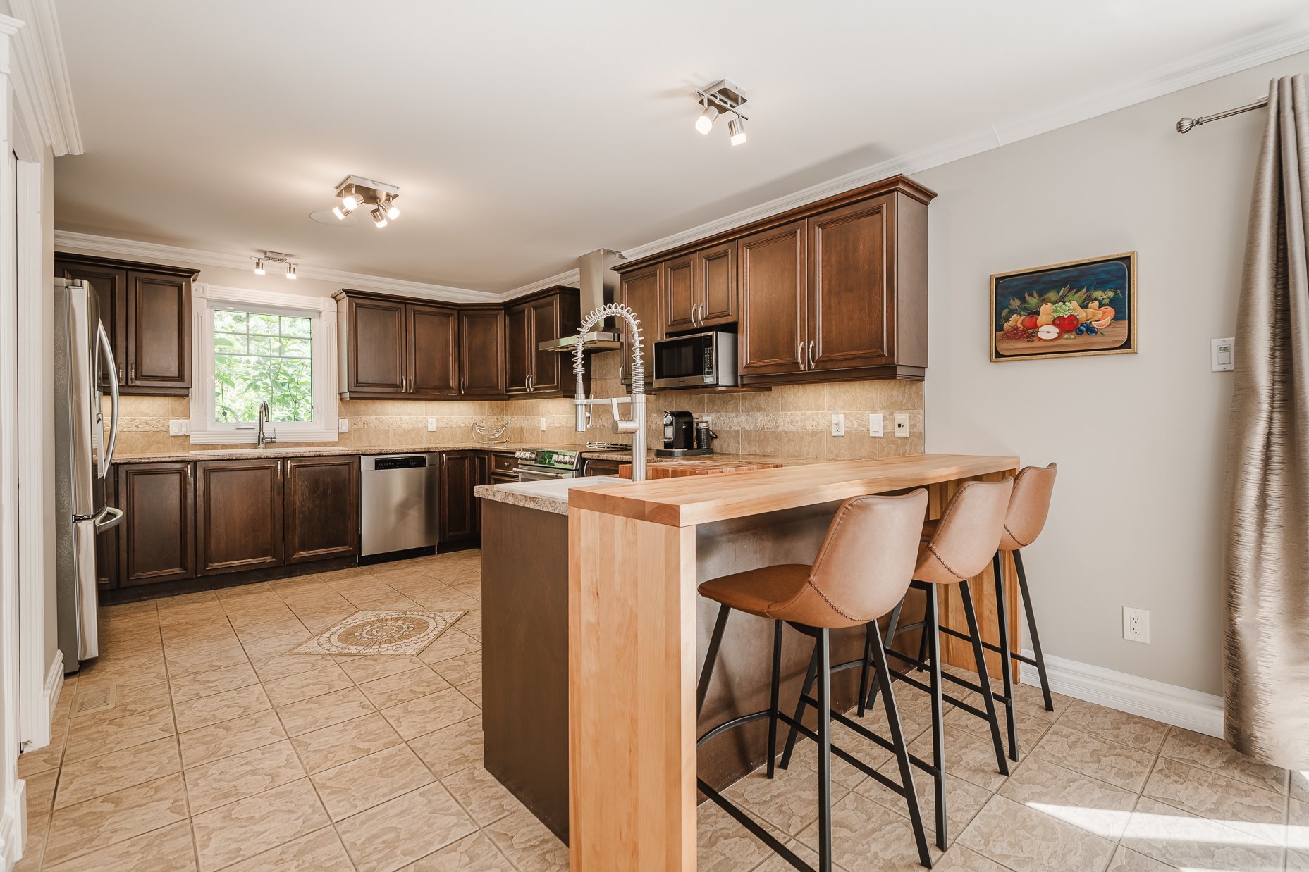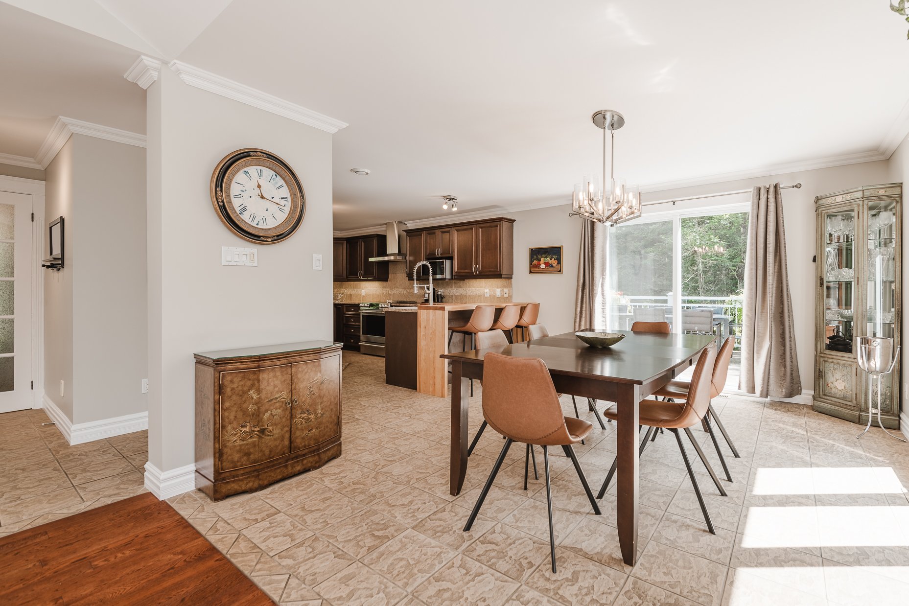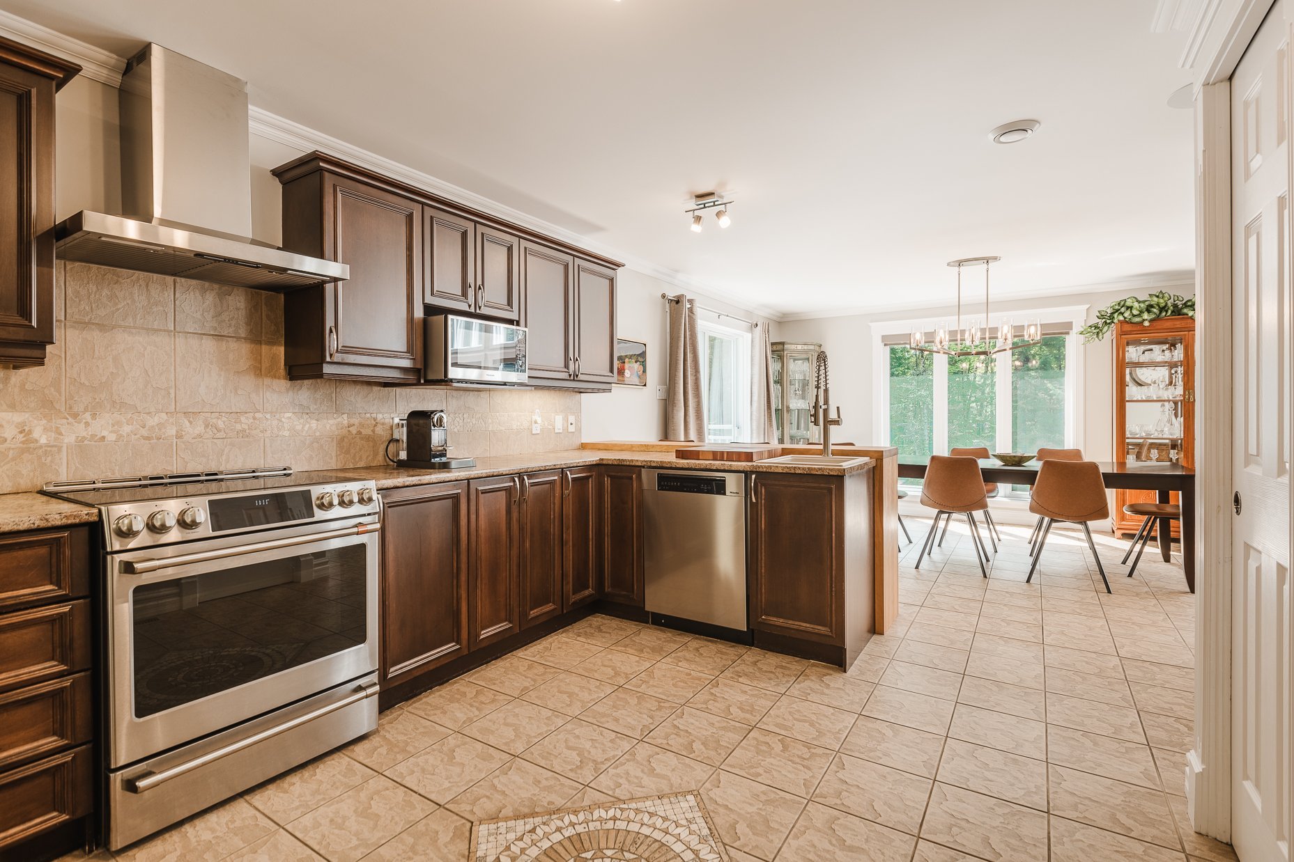 Dès l'entrée, le rez-de-chaussée s'ouvre sur un espace à aire ouverte qui comprend les pièces principales. La cuisine conviviale, est équipée d'électroménagers haut de gamme, de nombreux cabinets en bois et d'une dépense. Elle s'ouvre directement sur le salon et la salle à manger, créant un espace fluide et agréable à vivre. Le salon, baigné de lumière et agrémenté par son foyer au gaz est un lieu de détente par excellence.