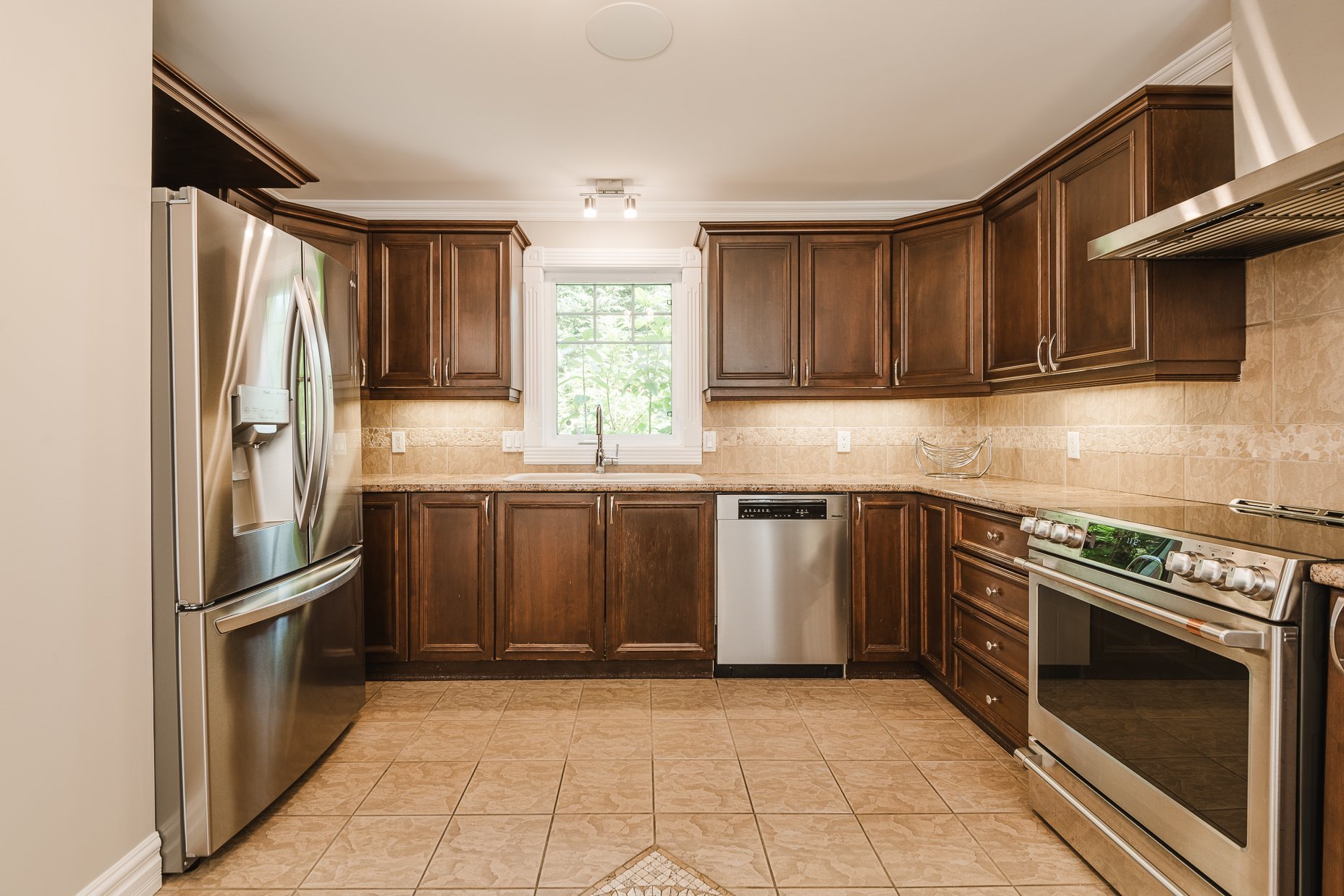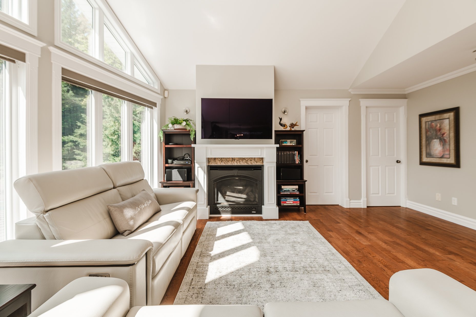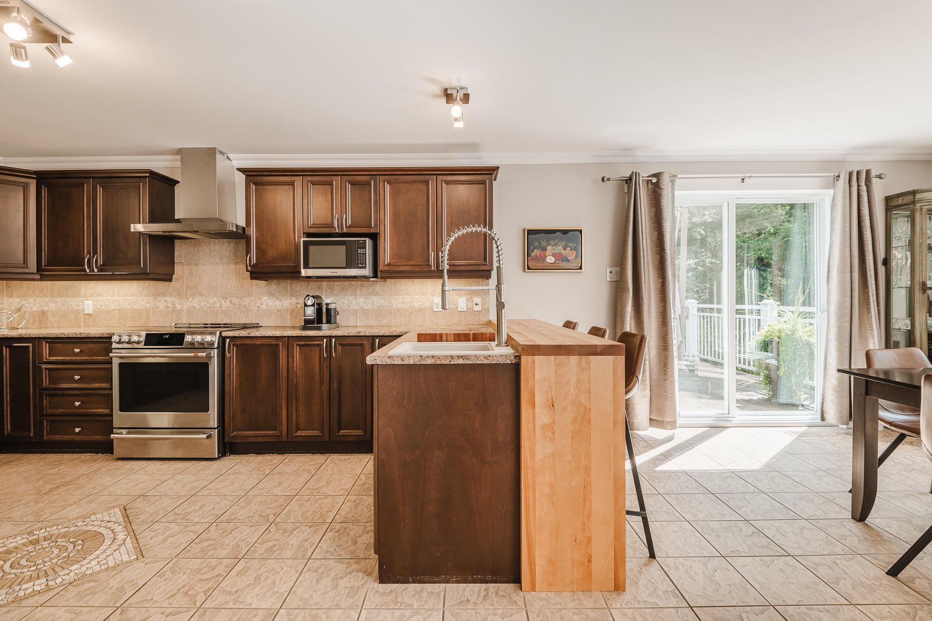 Dès l'entrée, le rez-de-chaussée s'ouvre sur un espace à aire ouverte qui comprend les pièces principales. La cuisine conviviale, est équipée d'électroménagers haut de gamme, de nombreux cabinets en bois et d'une dépense. Elle s'ouvre directement sur le salon et la salle à manger, créant un espace fluide et agréable à vivre. Le salon, baigné de lumière et agrémenté par son foyer au gaz est un lieu de détente par excellence.