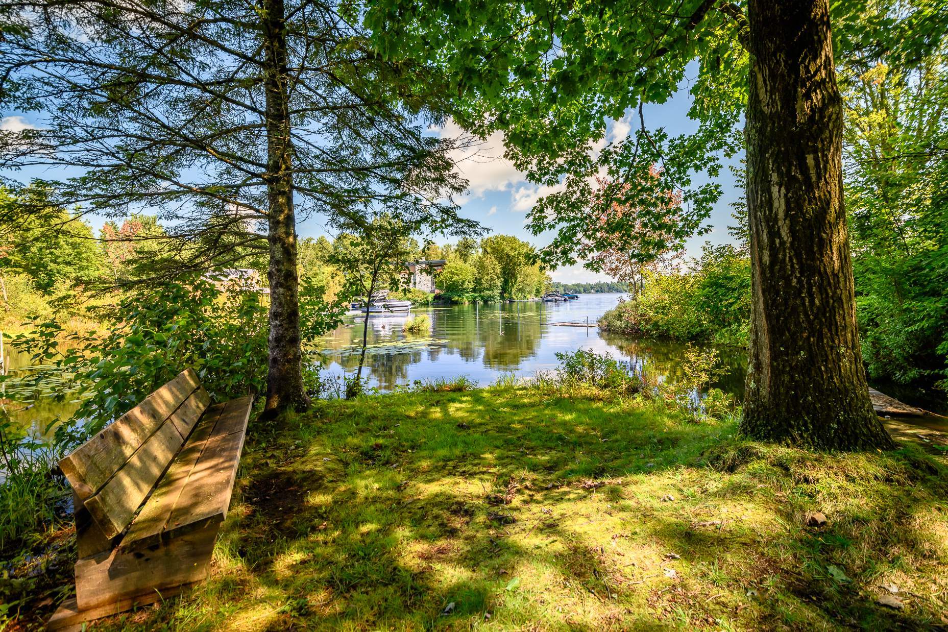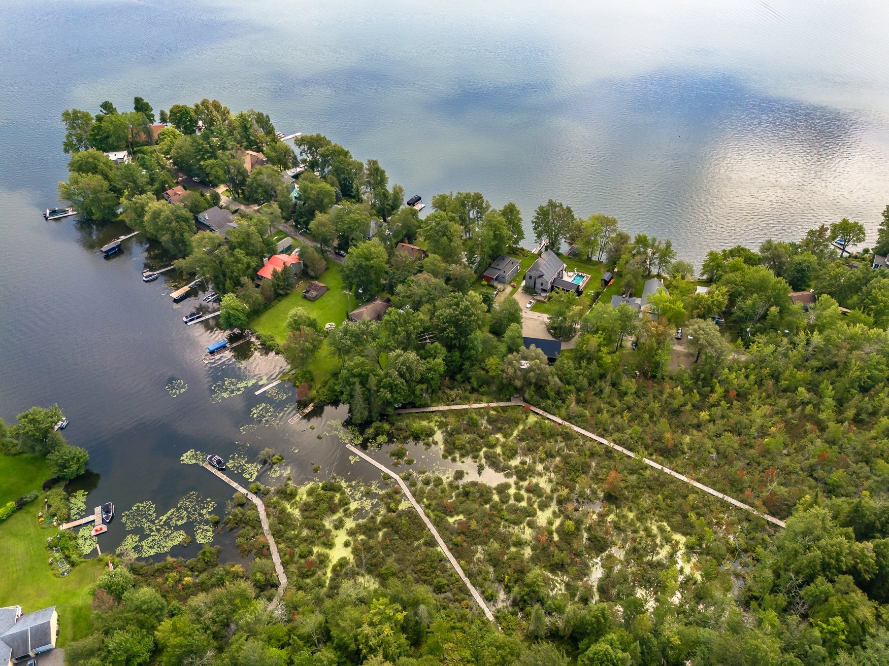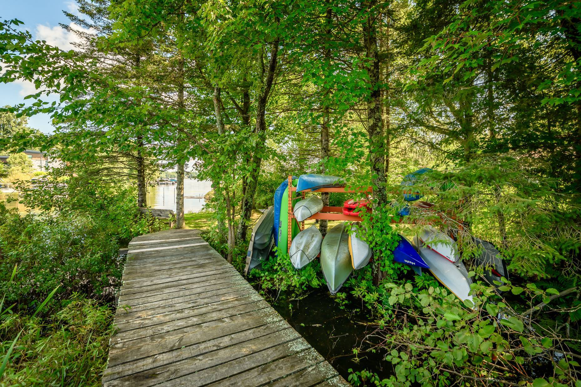 Un joli sentier à l'arrière mène à une passerelle qui débouche sur le lac Brome. L'accès au lac bénéficiera aux amateurs de sports nautiques non motorisés. Un banc, situé en bordure de l'eau, invite à la détente, tandis que des supports à kayak et SUP facilitent l'organisation.