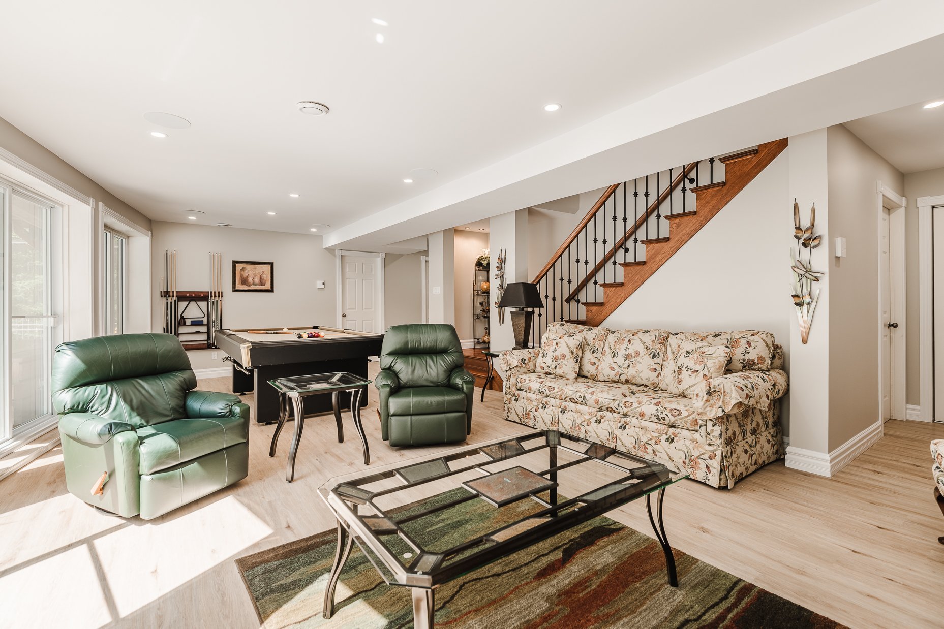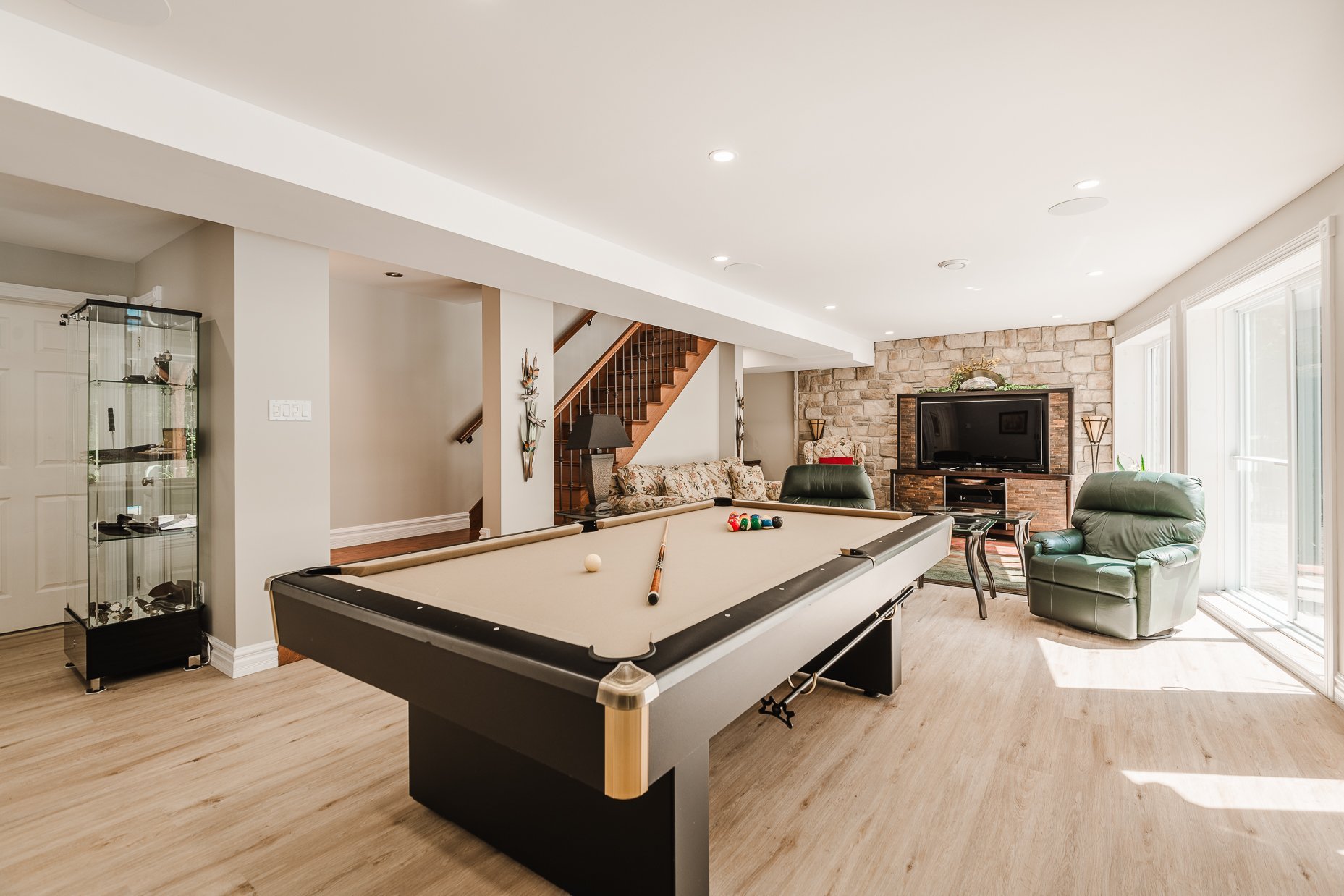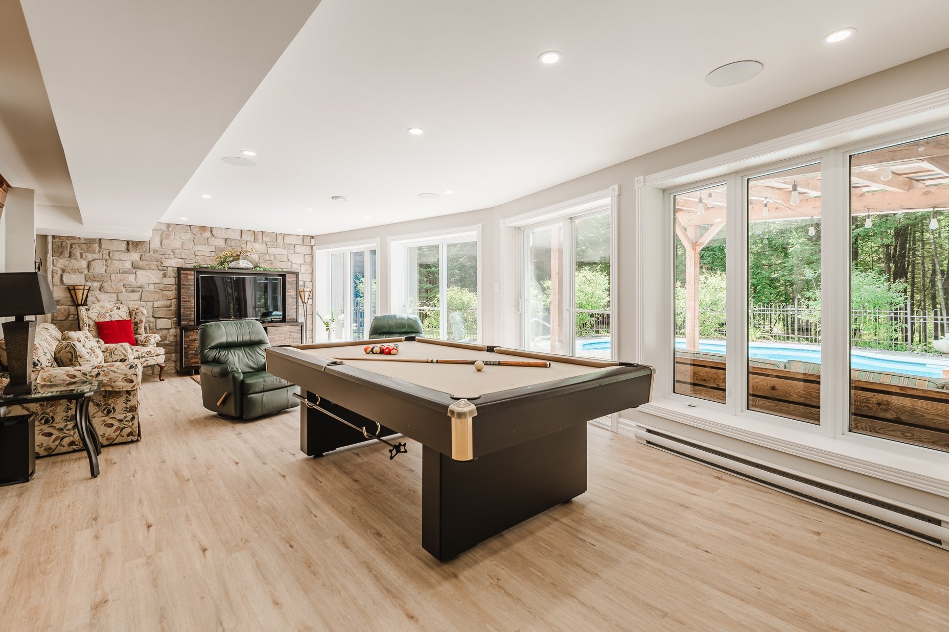 Le rez-de-jardin, lui aussi baigné de lumière, propose une grande salle familiale avec un coin billard et un espace télévision. Deux autres chambres s'y trouvent ainsi qu'une troisième salle de bains desservant ces chambres, assurant un confort optimal pour tous.
