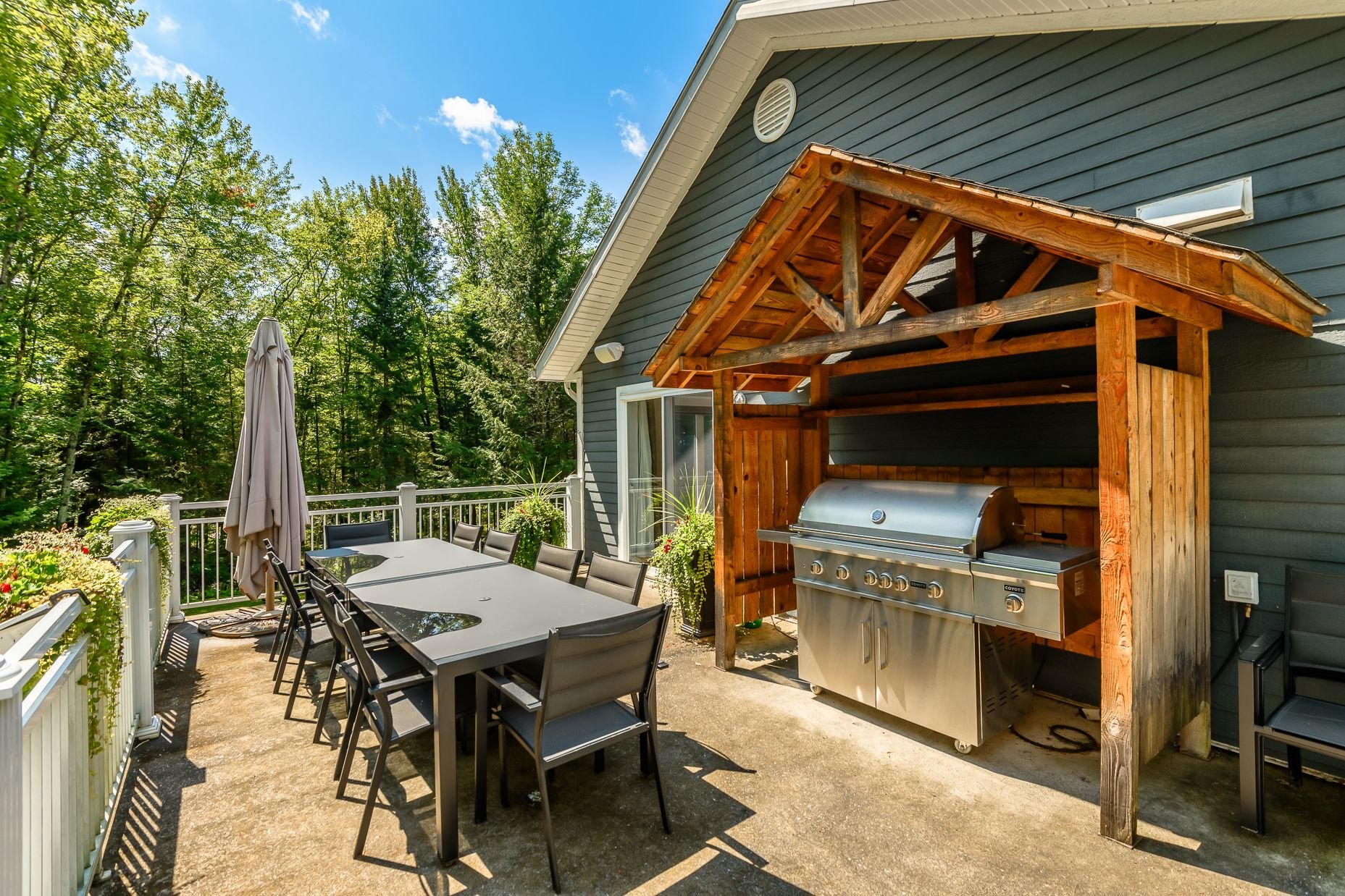 À l'extérieur, la terrasse spacieuse surplombe le terrain. Cet espace extérieur est un véritable prolongement de l'espace de vie intérieur. Les jardins, magnifiquement aménagés, abritent une piscine creusée chauffée à l'eau saline. Une aire de feu en retrait permet de prolonger les soirées d'été dans une ambiance conviviale.