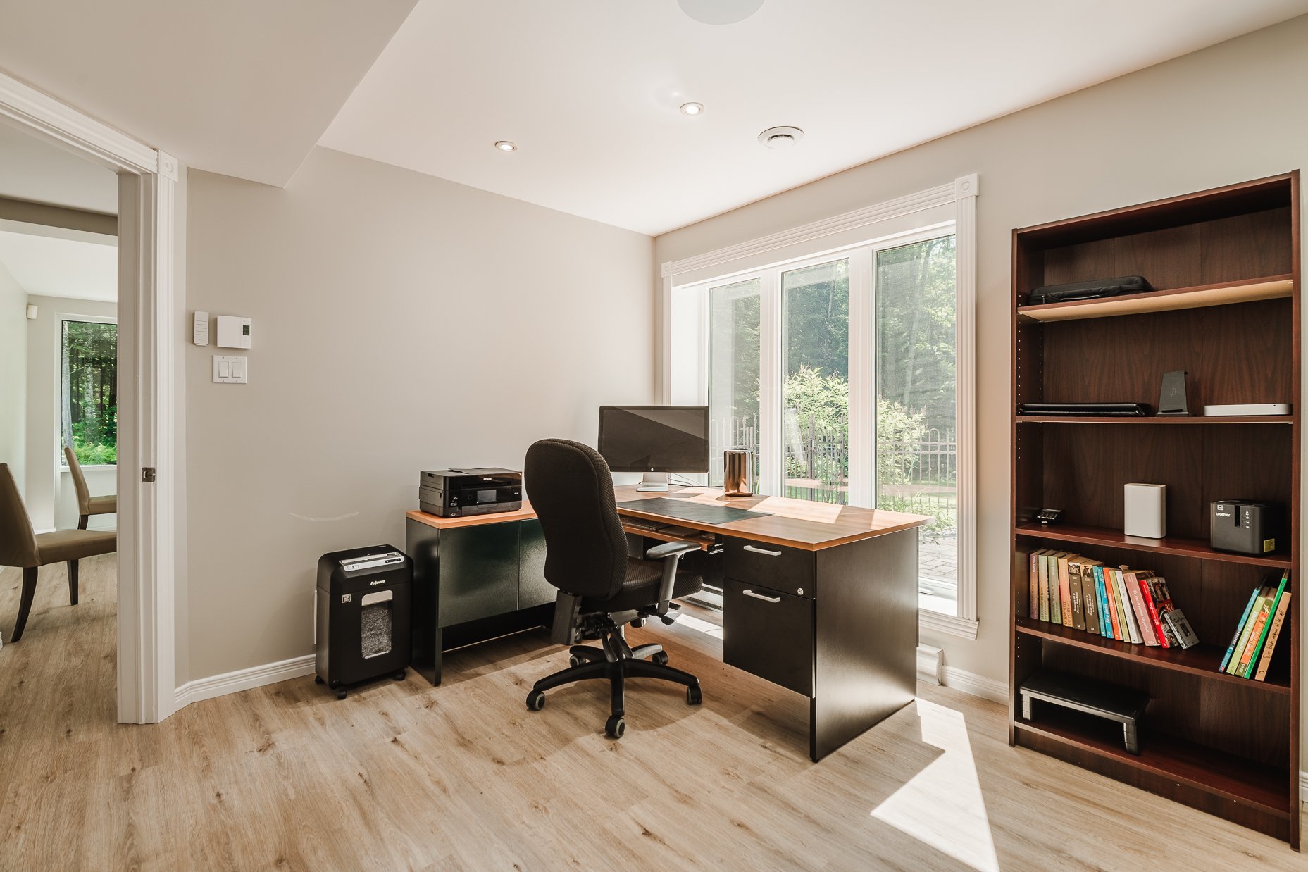 En retrait, un bureau a été soigneusement aménagé avec deux pièces fermées, parfait pour ceux qui travaillent à domicile. Calme et isolé, c'est la place idéale pour une pratique professionnelle ou pour un atelier. Une porte d'entrée séparée et une salle d'eau attenante ajoutent une touche de praticité.