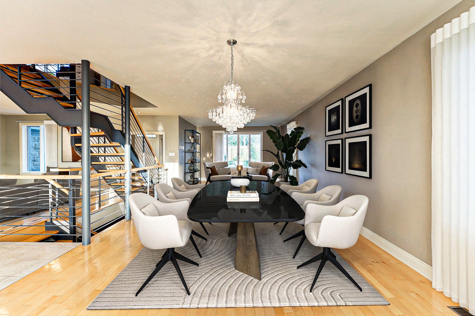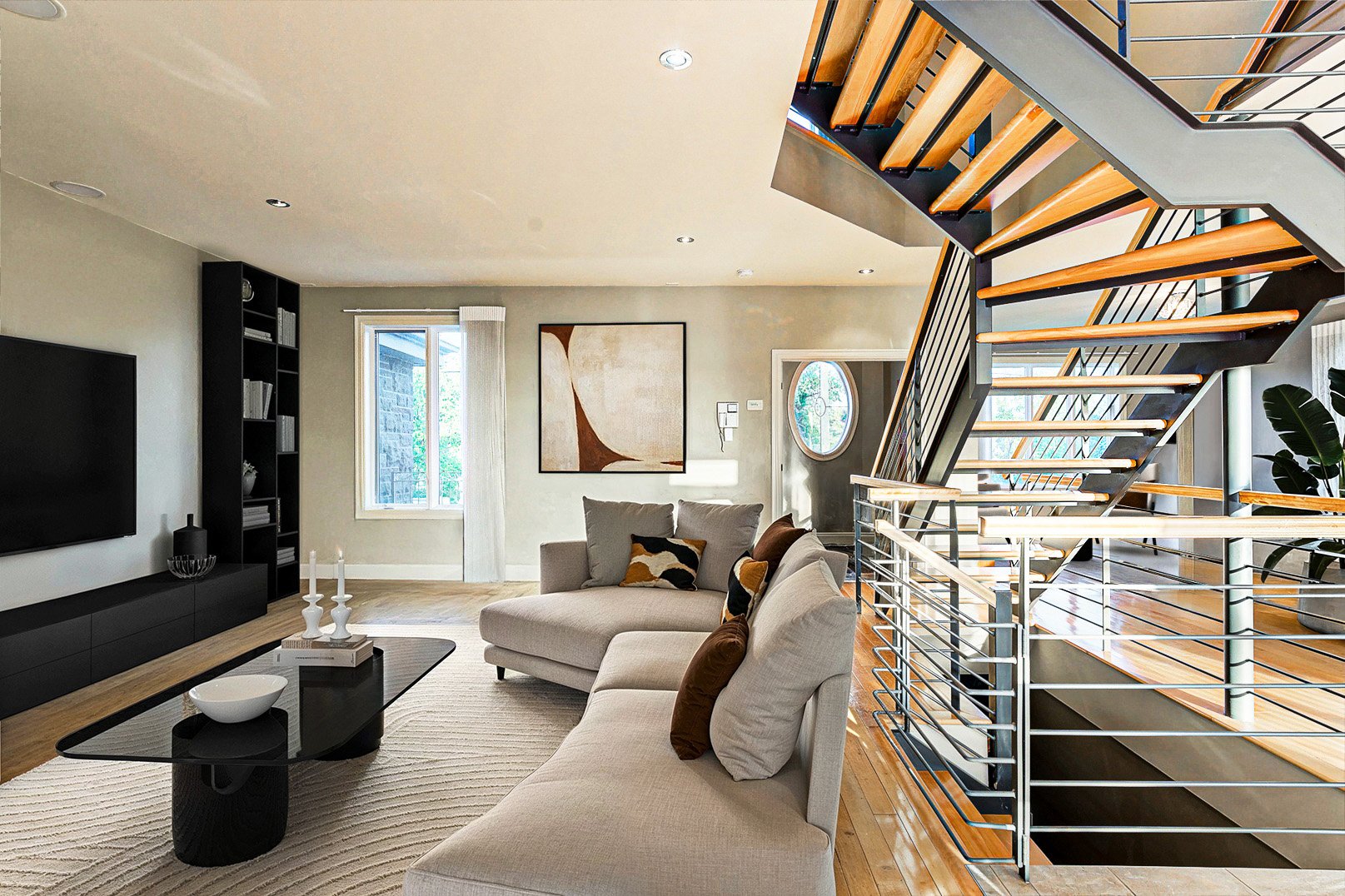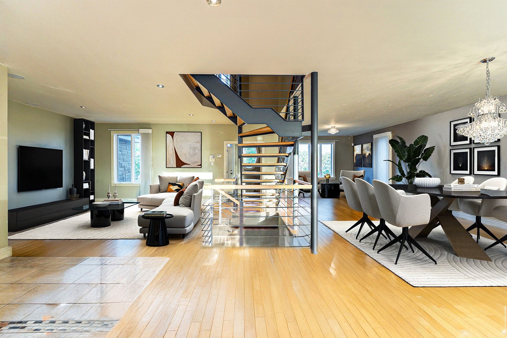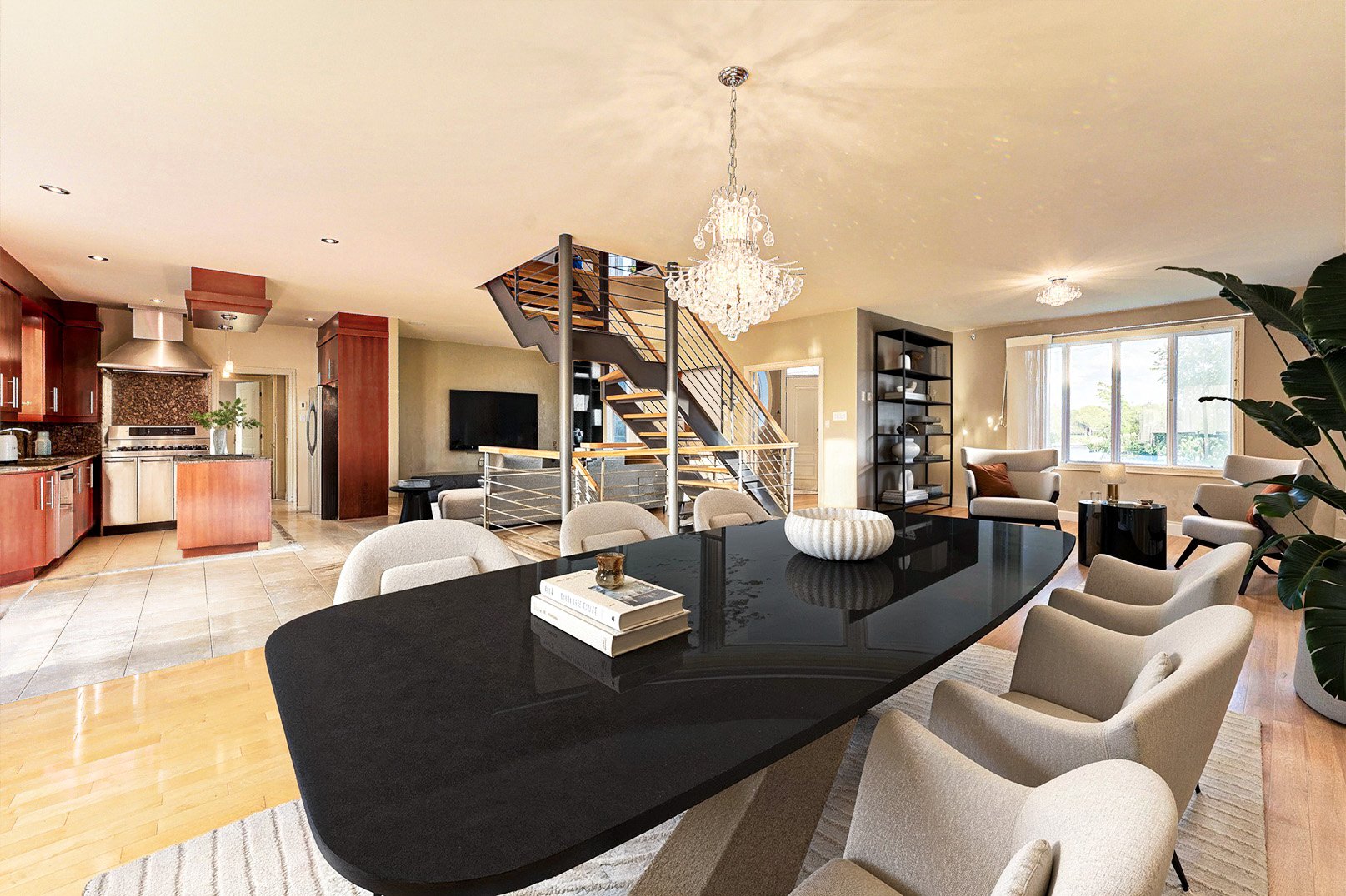 Dès l'entrée, un vestibule au charme classique, rehaussé de fenêtres ovales, ouvre sur un escalier central au design contemporain. La disposition à aire ouverte révèle des pièces baignées de lumière naturelle, des planchers chauffants, une salle à manger élégante, un salon accueillant et une cuisine gastronomique, véritable coeur de la maison, sublimée par le granit et des électroménagers de qualité professionnelle.