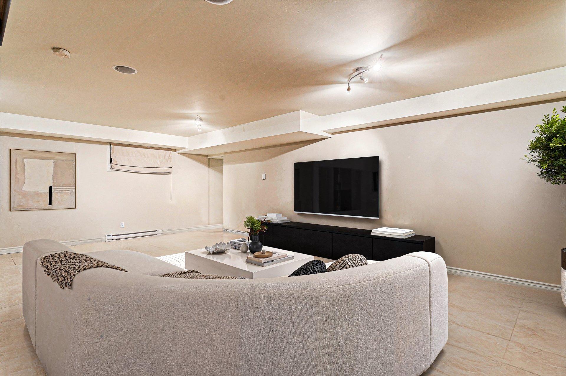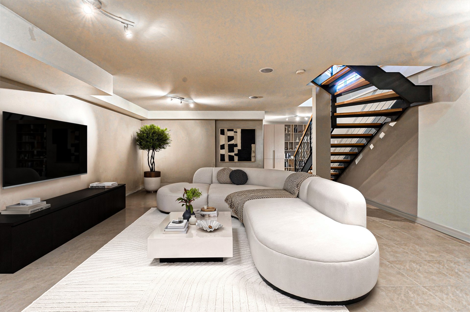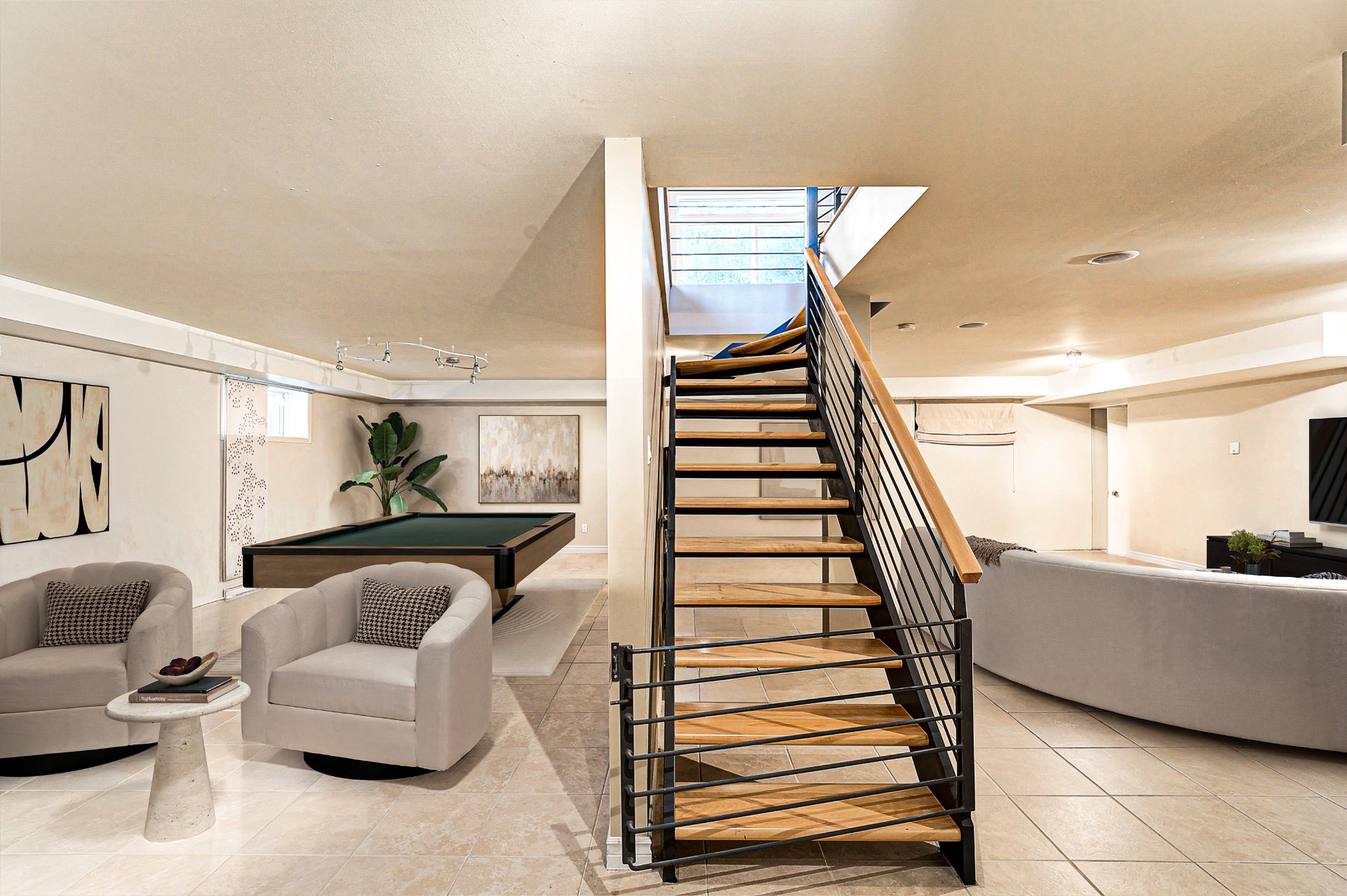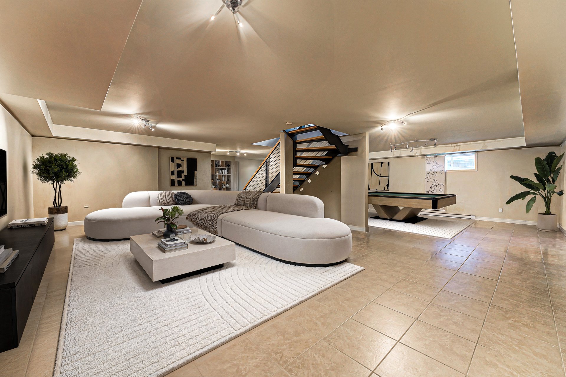 Le sous-sol entièrement aménagé propose un espace polyvalent adapté à la vie familiale, aux réceptions ou au télétravail, avec la même exigence de finition que le reste de la demeure.