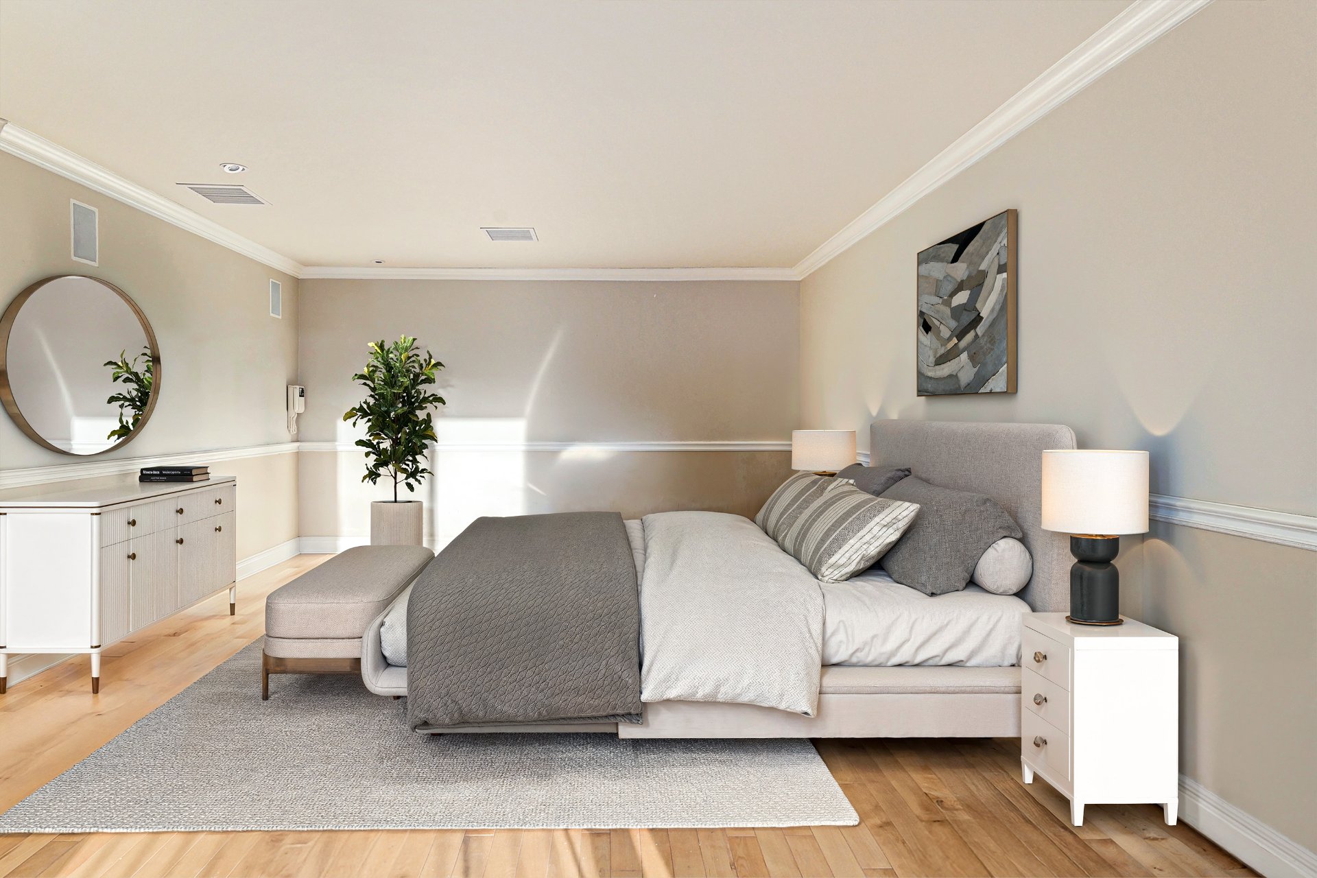 À l'étage, la suite principale évoque le raffinement d'une suite hôtelière exclusive : grand walk-in, salle de bain attenante avec douche en pierre naturelle, baignoire autoportante, et sauna privé pour une détente absolue. Les chambres additionnelles, tout aussi généreuses, offrent confort, lumière et tranquillité.