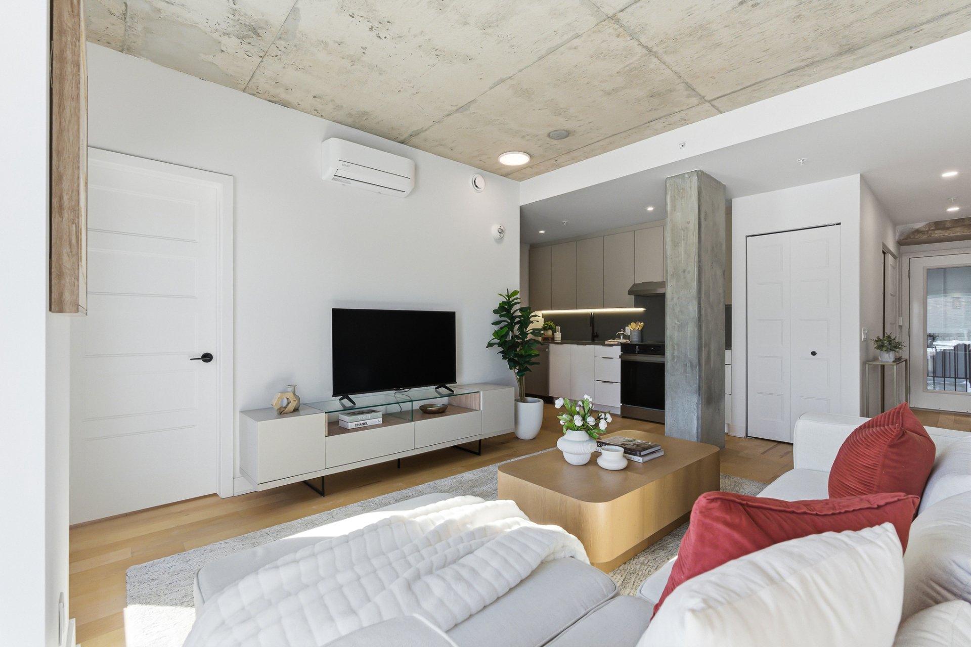 - Aire ouverte regroupant le salon avec accès balcon, la salle à manger et la cuisine.