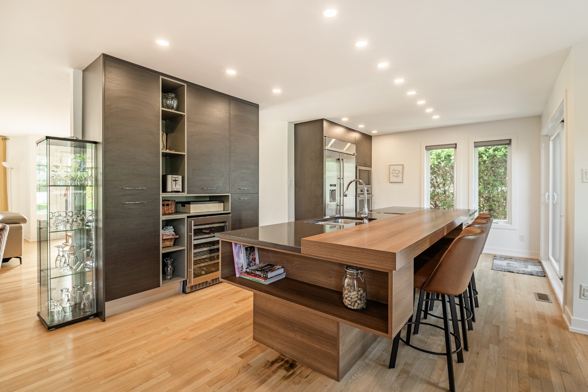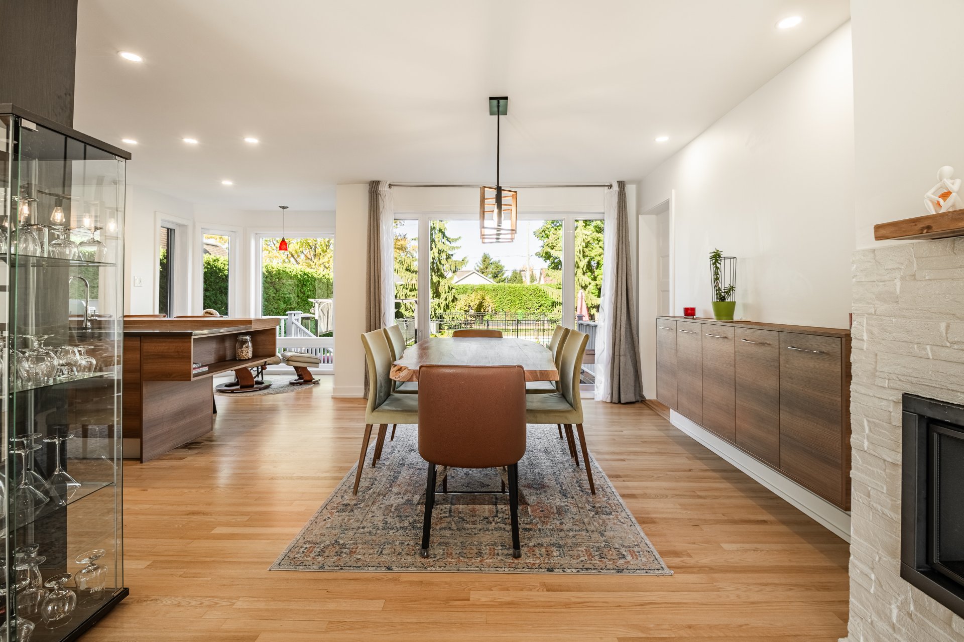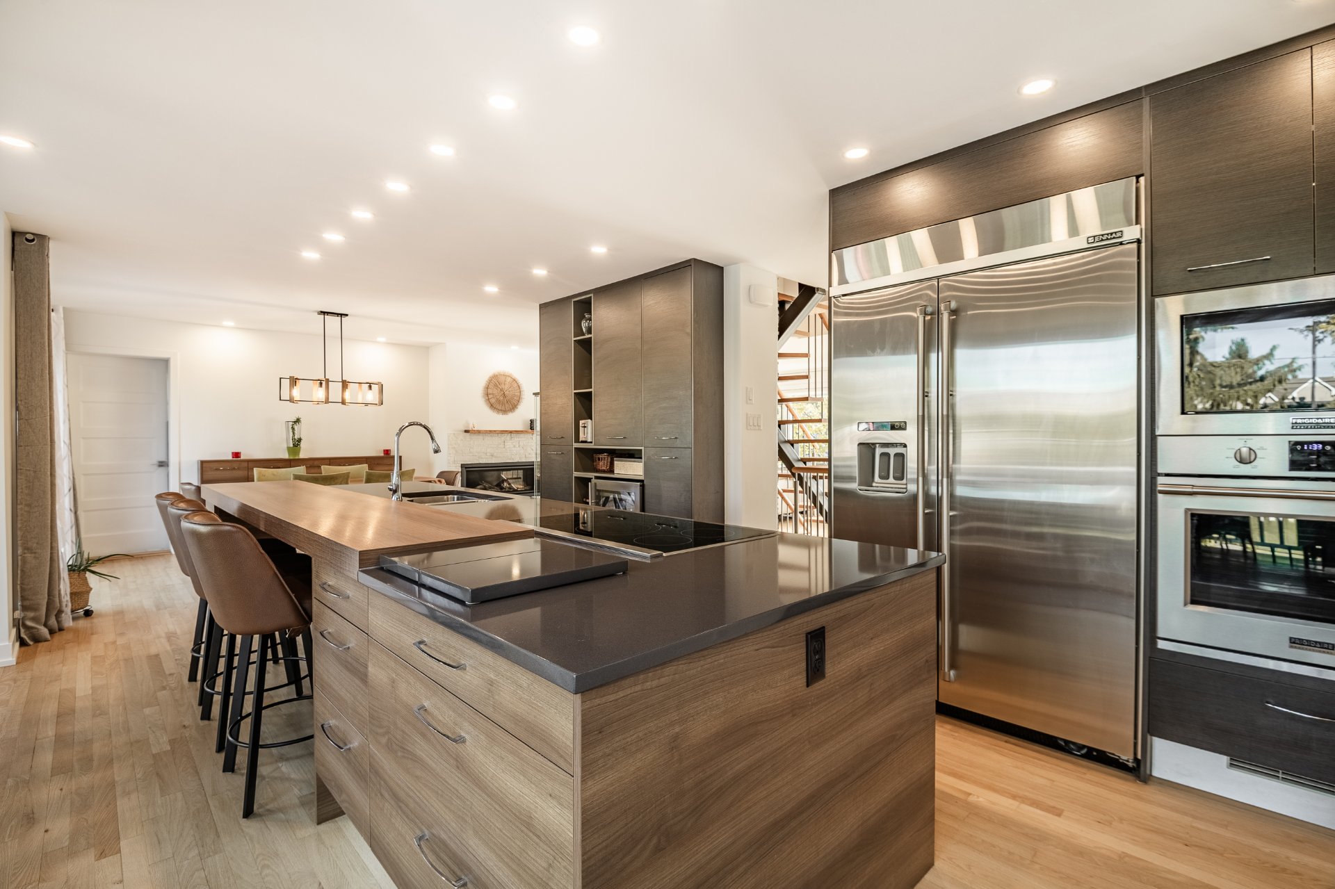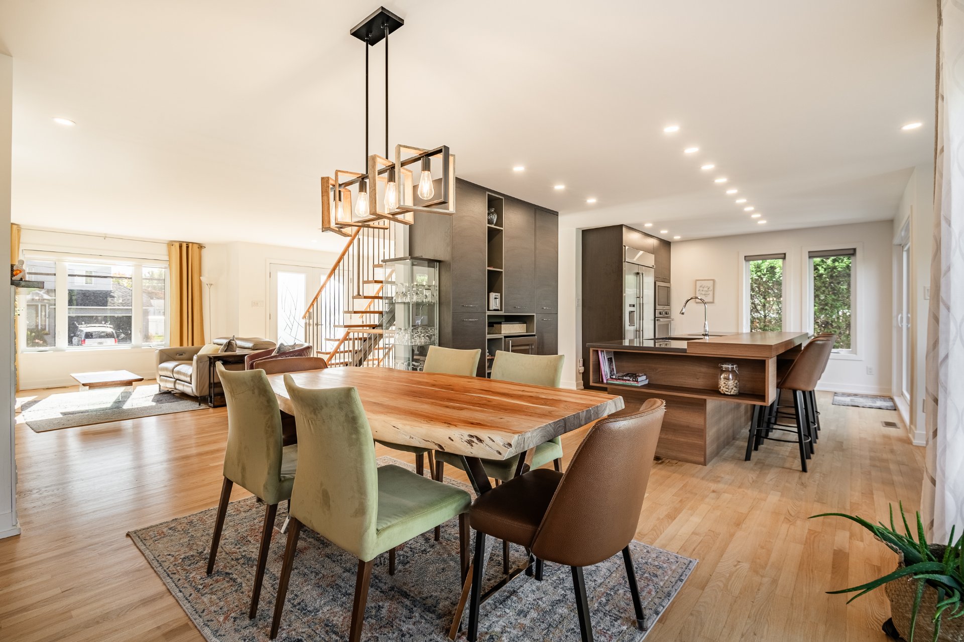 L'intérieur a été entièrement redessiné avec des matériaux nobles, une isolation optimisée et une insonorisation soignée. La maison principale s'ouvre sur un vaste espace à aire ouverte, baigné de lumière naturelle. La cuisine Mobalpa, dotée d'un immense îlot en quartz, d'électroménagers haut de gamme et d'un coin lunch convivial, communique harmonieusement avec la salle à manger et le salon agrémenté d'un foyer au propane. Un mudroom fonctionnel, une salle d'eau et un grand garde-manger complètent le rez-de-chaussée.