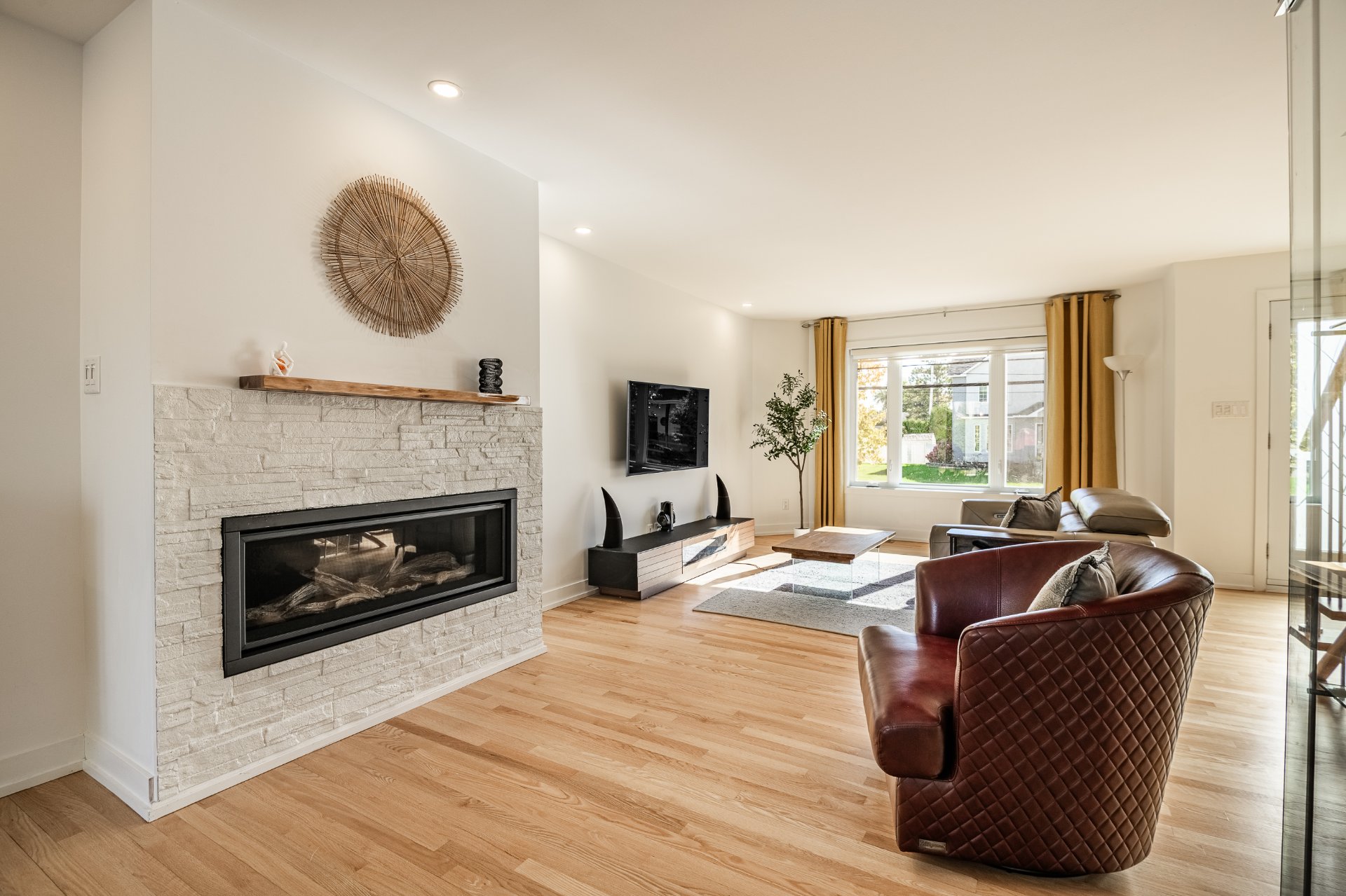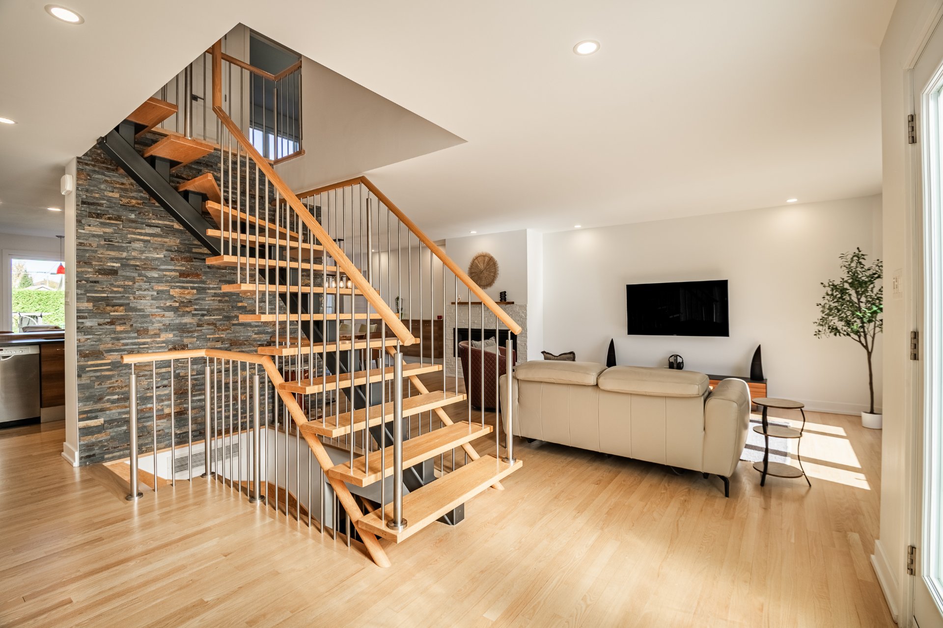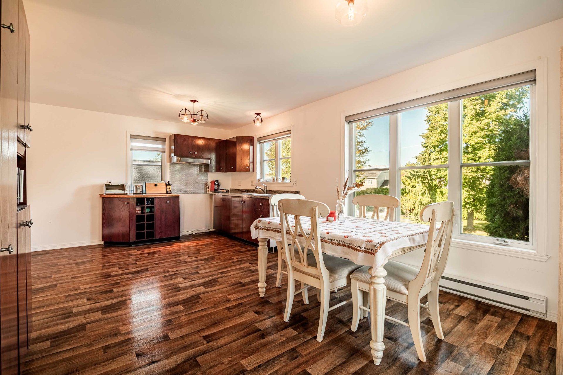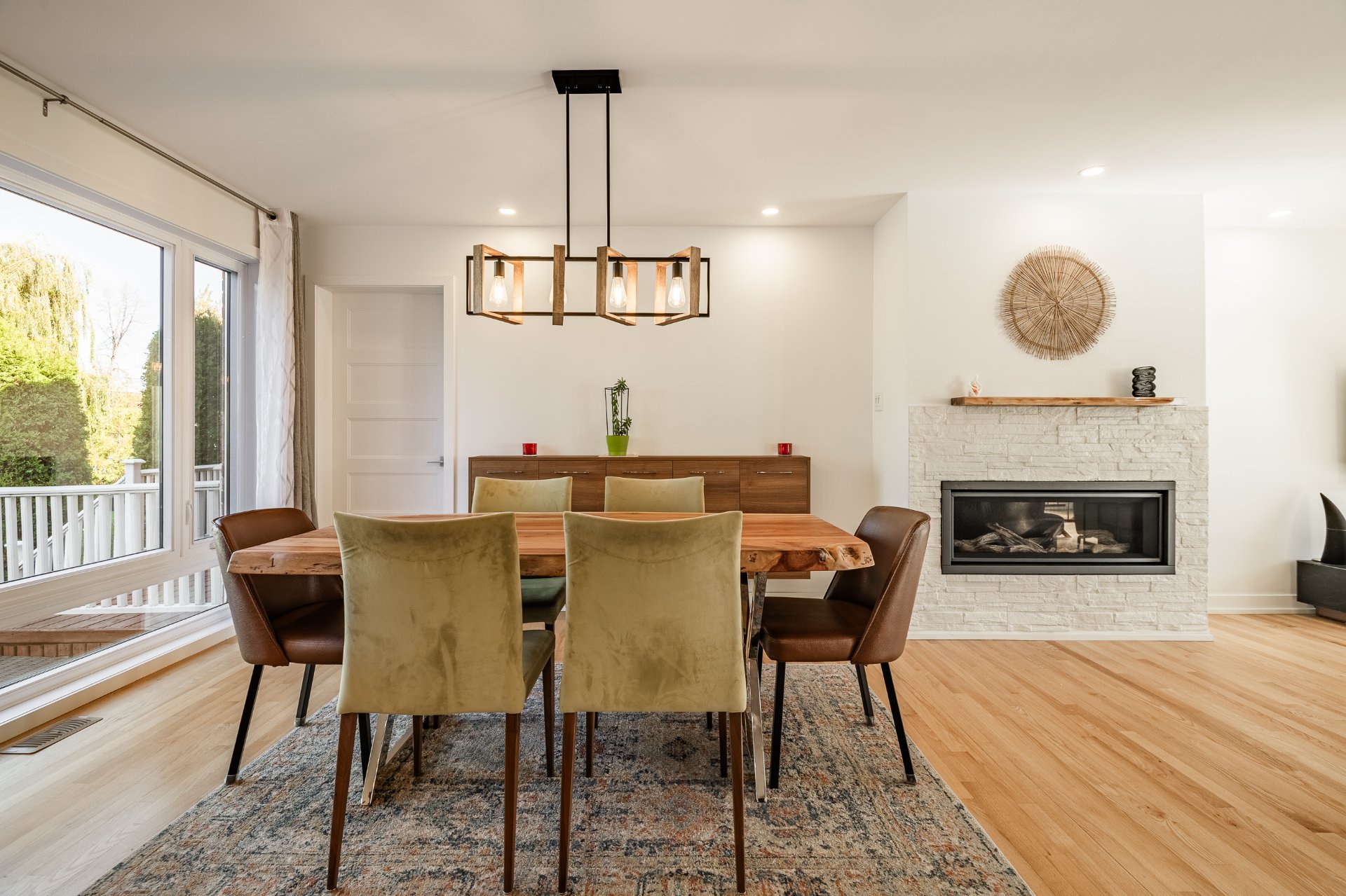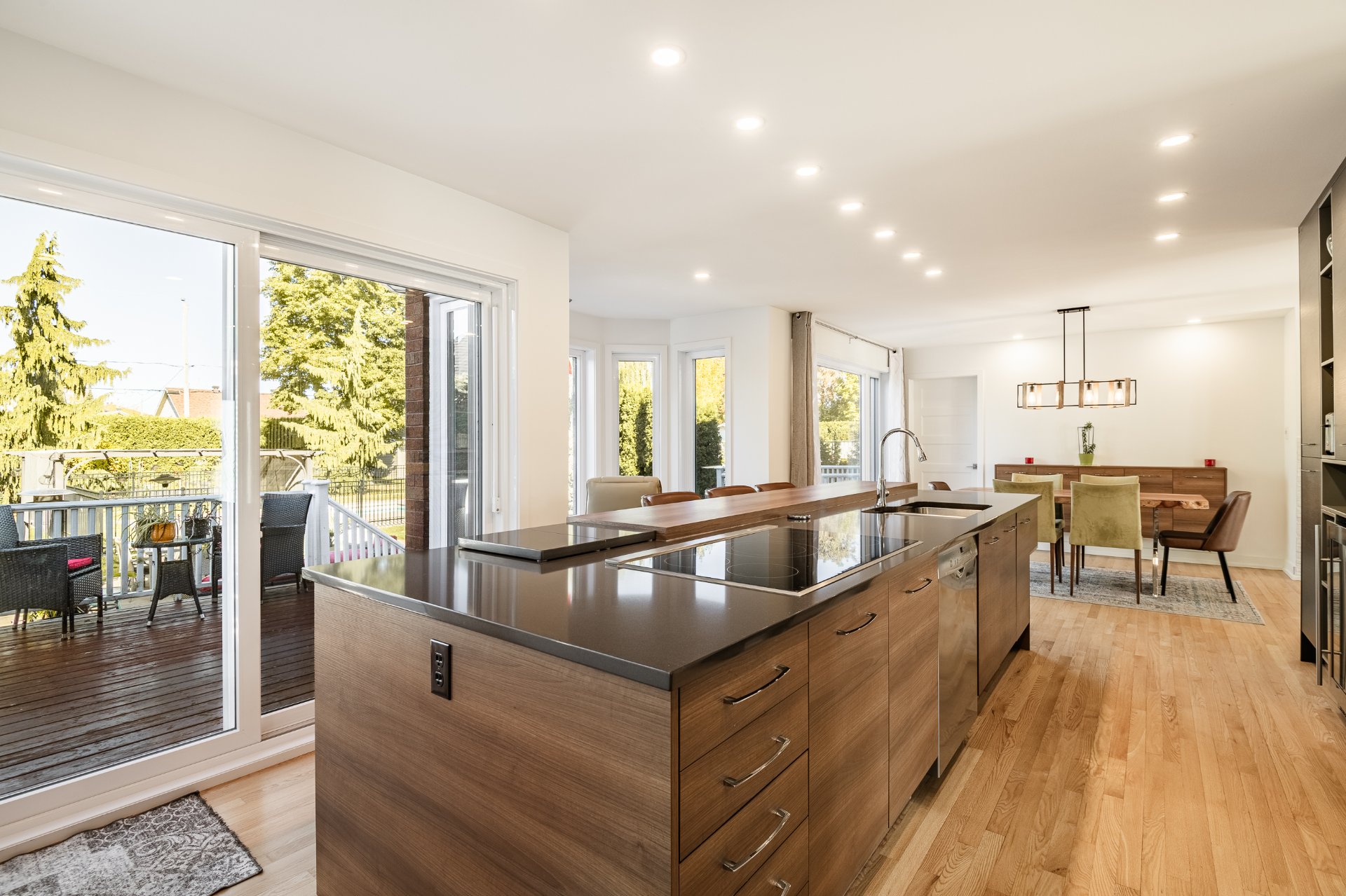 L'intérieur a été entièrement redessiné avec des matériaux nobles, une isolation optimisée et une insonorisation soignée. La maison principale s'ouvre sur un vaste espace à aire ouverte, baigné de lumière naturelle. La cuisine Mobalpa, dotée d'un immense îlot en quartz, d'électroménagers haut de gamme et d'un coin lunch convivial, communique harmonieusement avec la salle à manger et le salon agrémenté d'un foyer au propane. Un mudroom fonctionnel, une salle d'eau et un grand garde-manger complètent le rez-de-chaussée.
