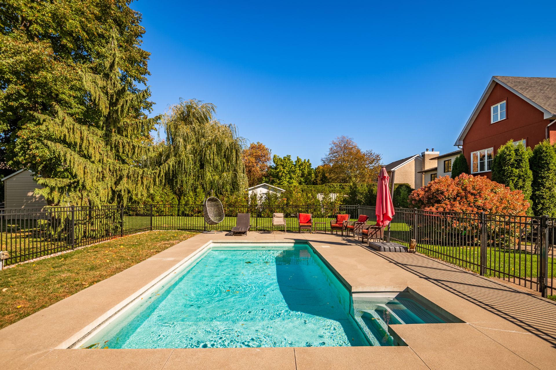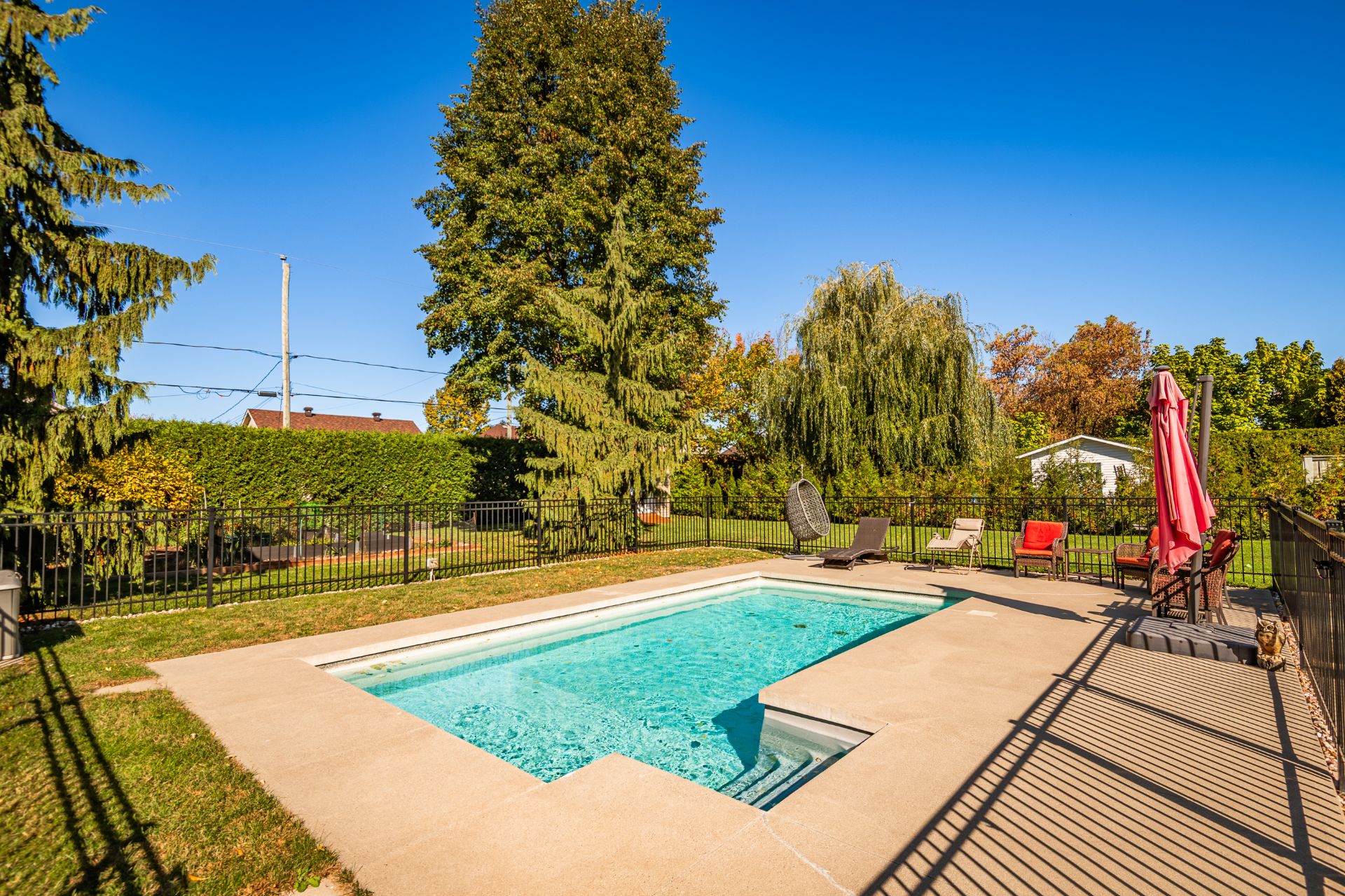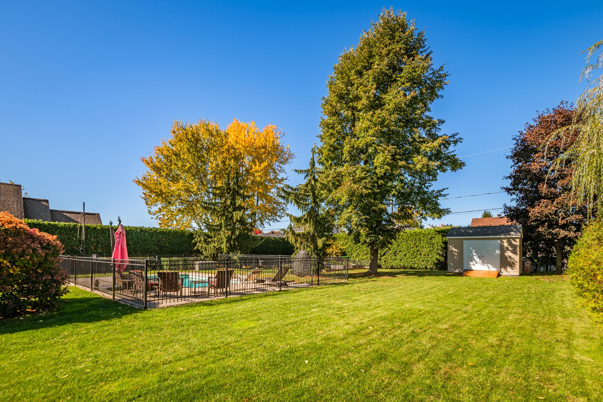 À l'extérieur, le terrain intime et superbement aménagé invite à la détente : piscine creusée Trévi (2017), patio en béton, remise (2023), jardin et coin feu. Pavé Permacon, système d'arrosage et éclairage programmable complètent cet environnement soigné.