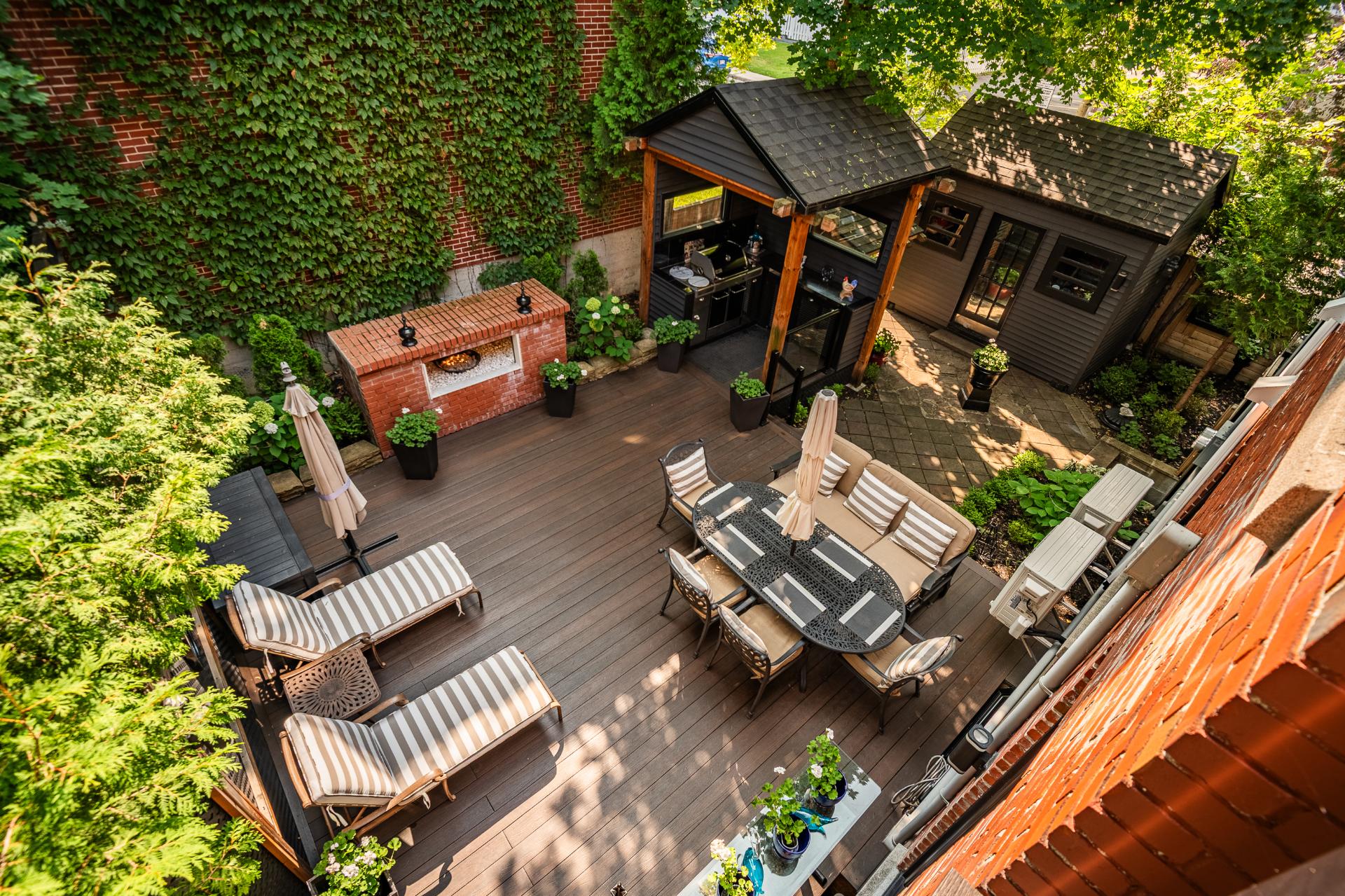 Cour arrière aménagée avec cuisine extérieure, parfaite pour recevoir