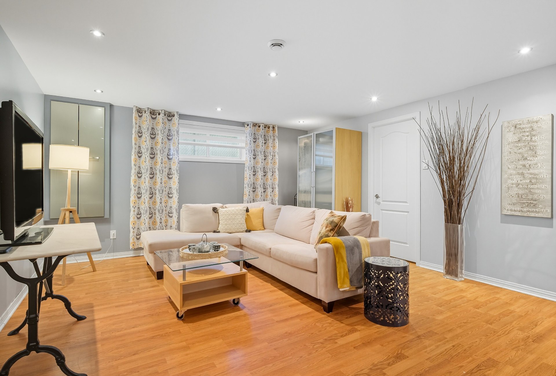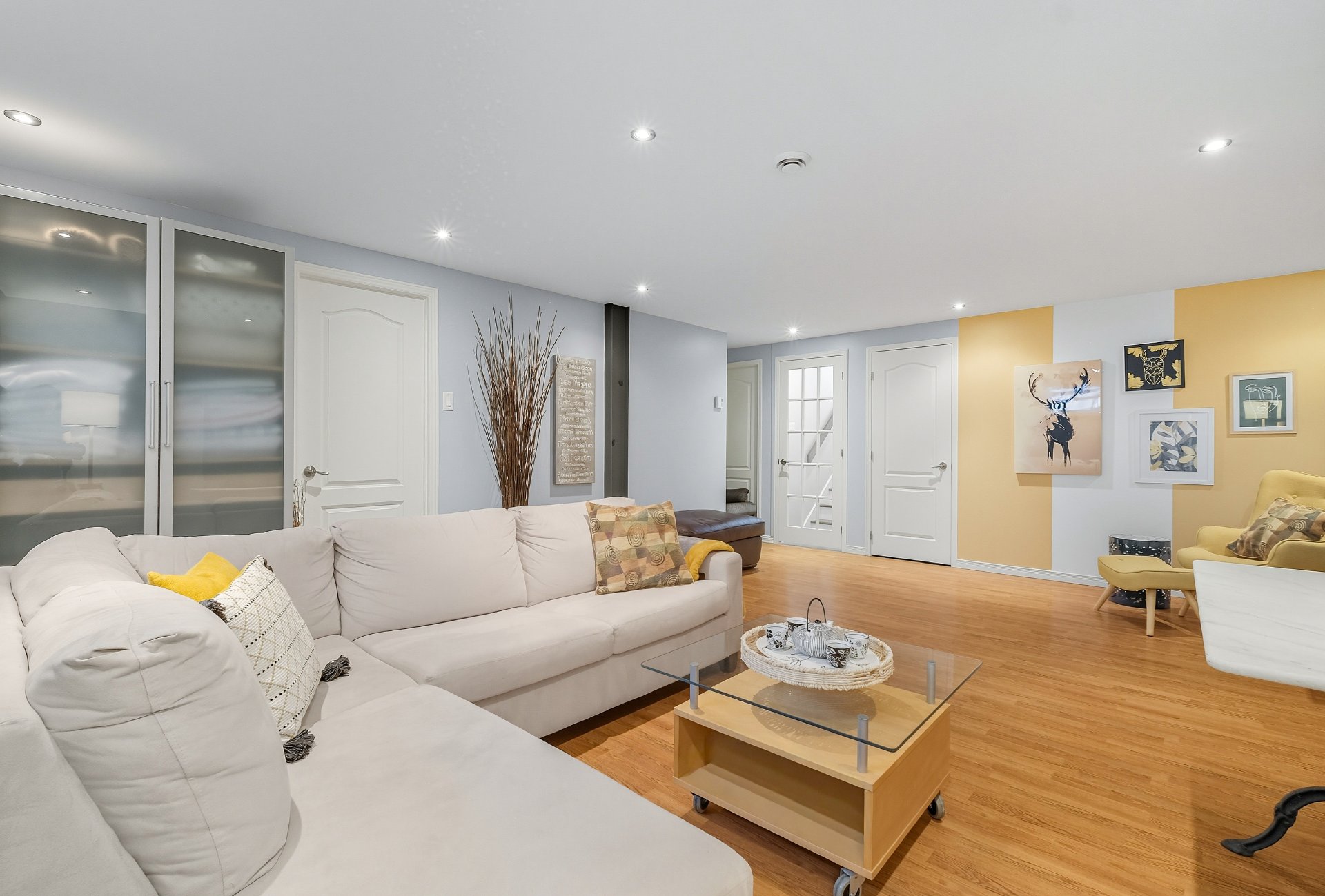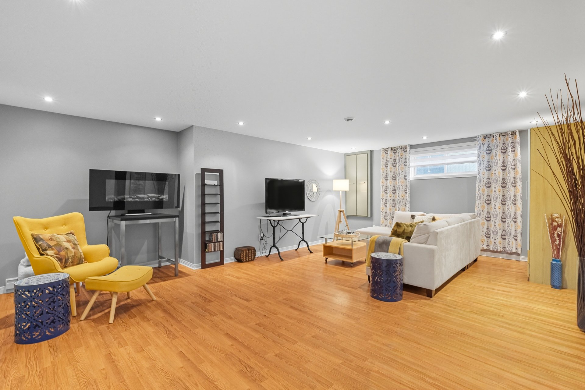 Entièrement aménagé, le sous-sol offre une grande salle familiale chaleureuse, parfaite pour vos moments de détente.