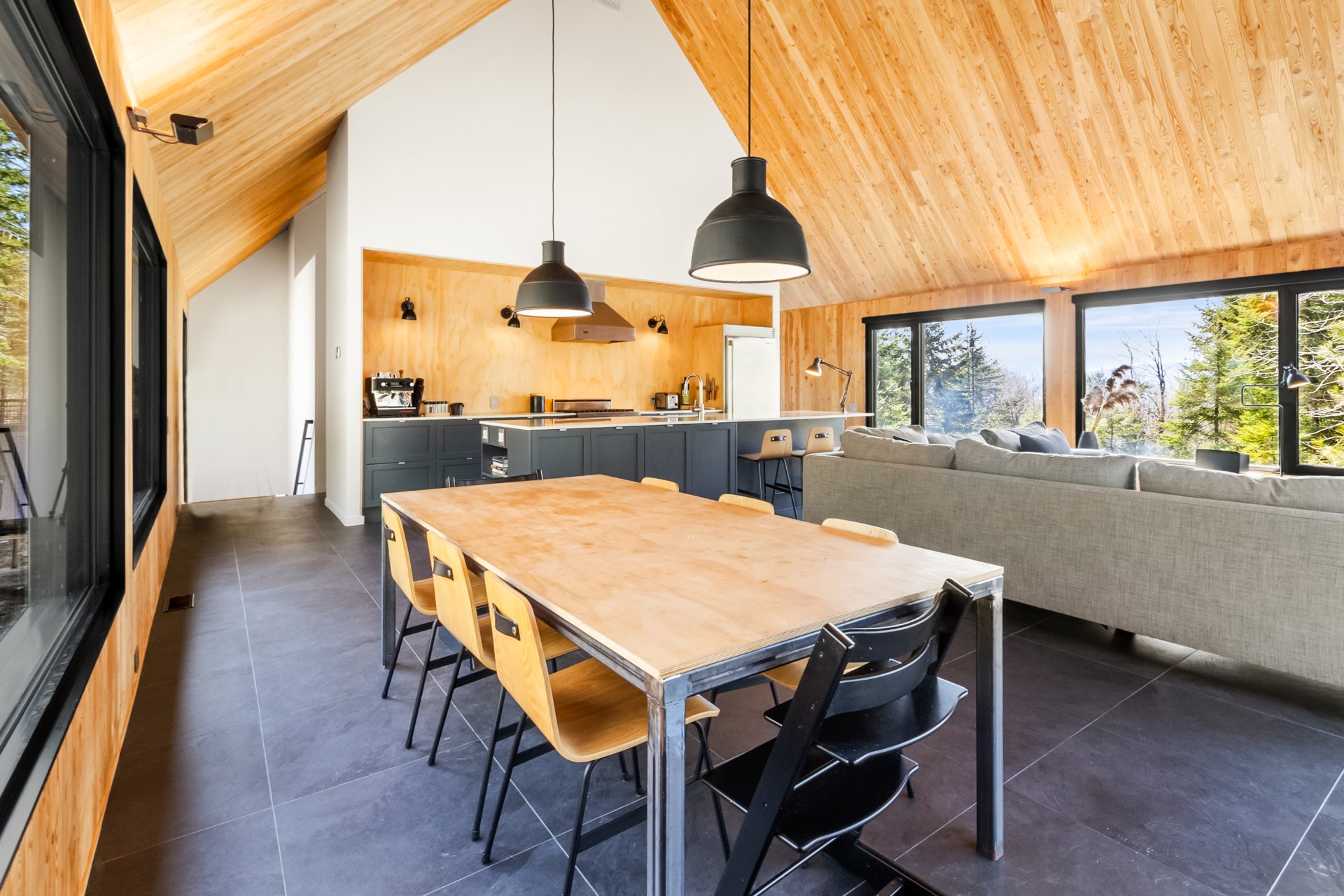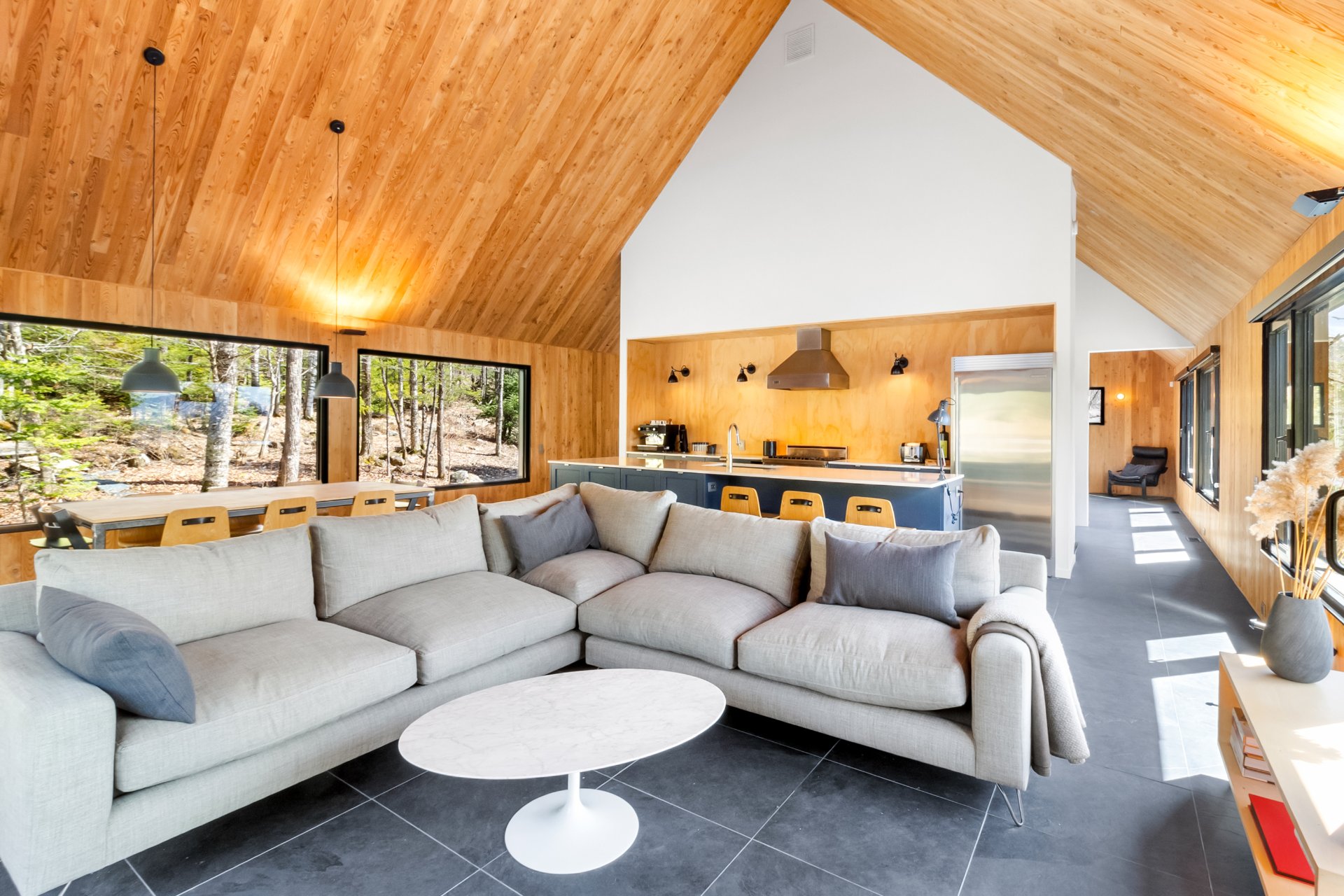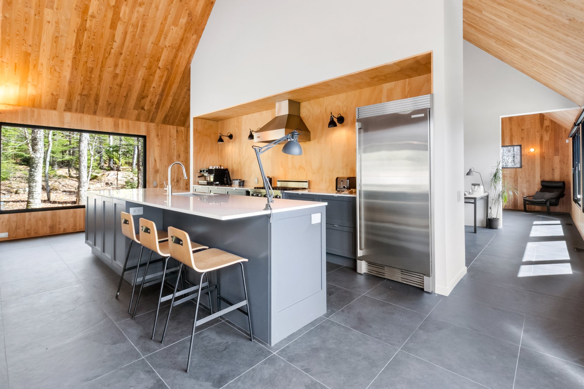L'aire de vie principale séduit par son plafond cathédrale de 20 pieds et sa luminosité abondante, mise en valeur par de grandes fenêtres et portes-patio Fabelta sur trois côtés. La cuisine gourmet, pensée pour les passionnés de gastronomie, est dotée d'un vaste îlot central et d'électroménagers haut de gamme. Le salon, convivial et chaleureux, s'articule autour d'un foyer au bois Stûv.