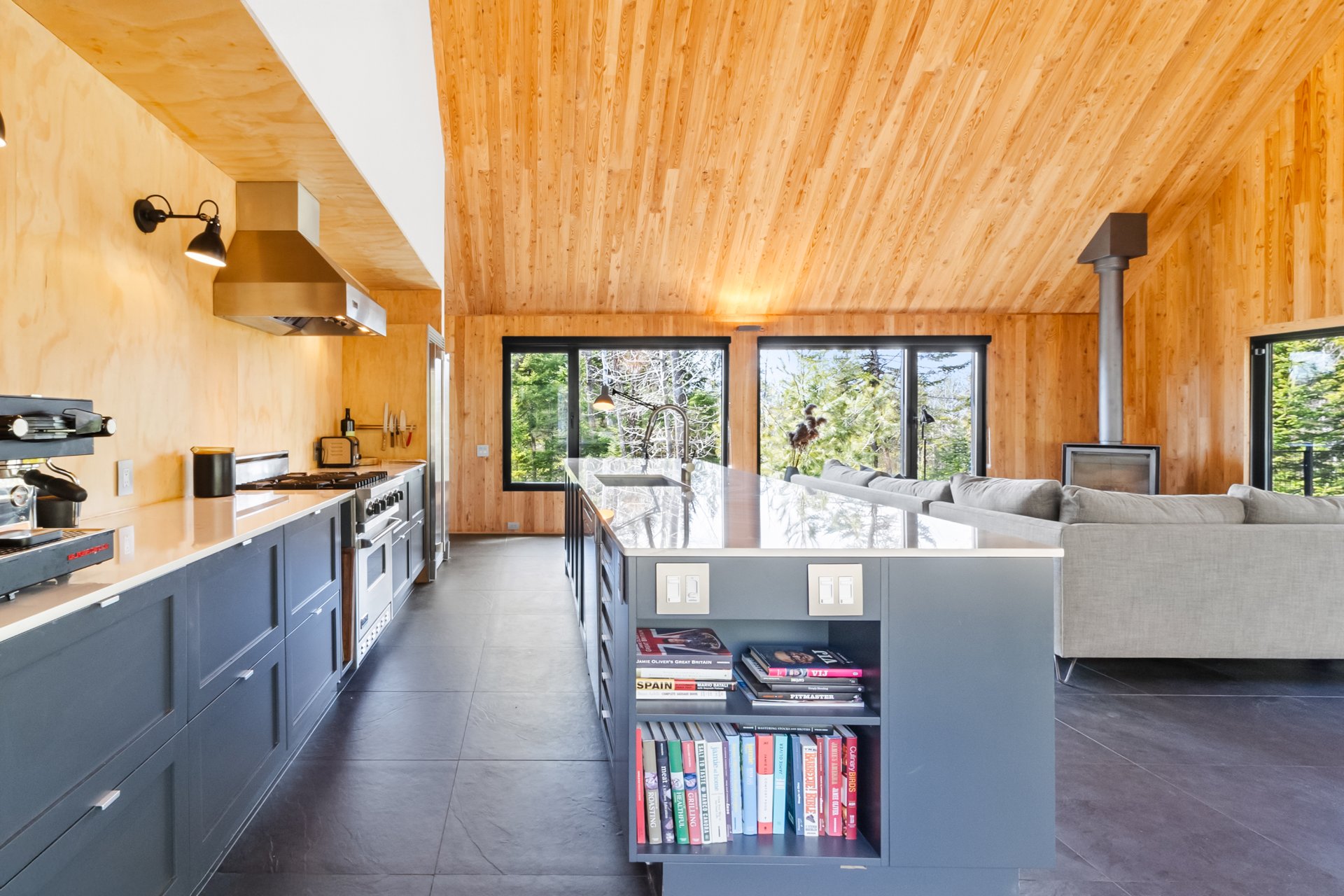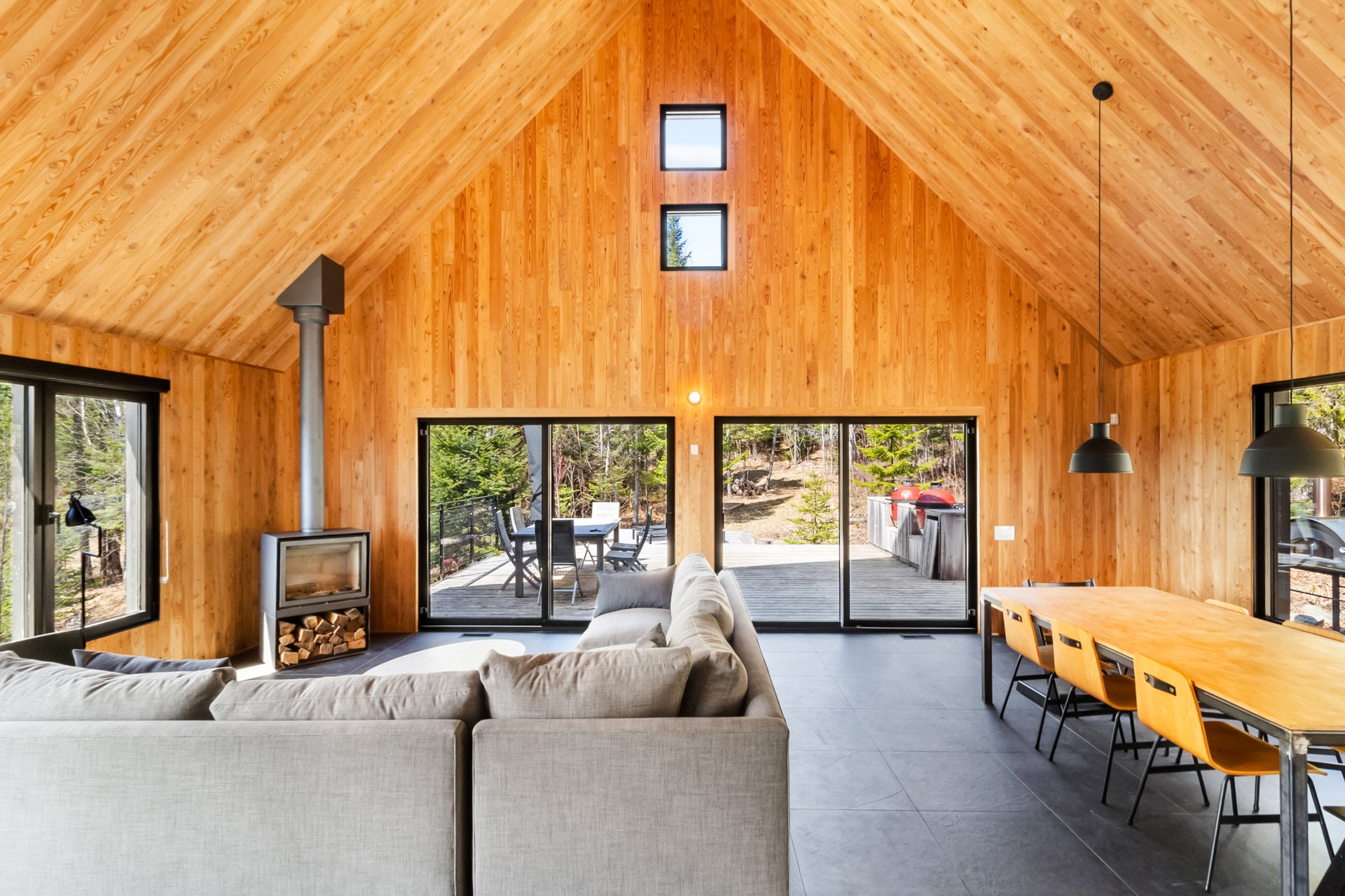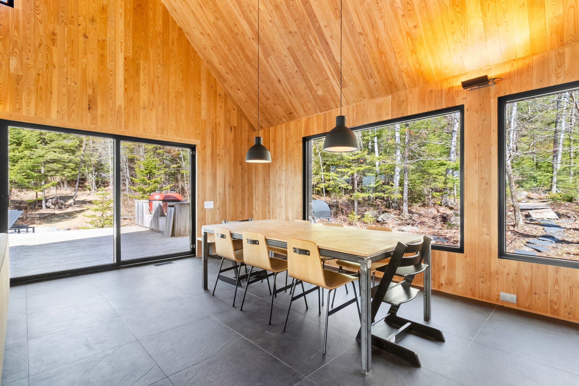 L'aire de vie principale séduit par son plafond cathédrale de 20 pieds et sa luminosité abondante, mise en valeur par de grandes fenêtres et portes-patio Fabelta sur trois côtés. La cuisine gourmet, pensée pour les passionnés de gastronomie, est dotée d'un vaste îlot central et d'électroménagers haut de gamme. Le salon, convivial et chaleureux, s'articule autour d'un foyer au bois Stûv.