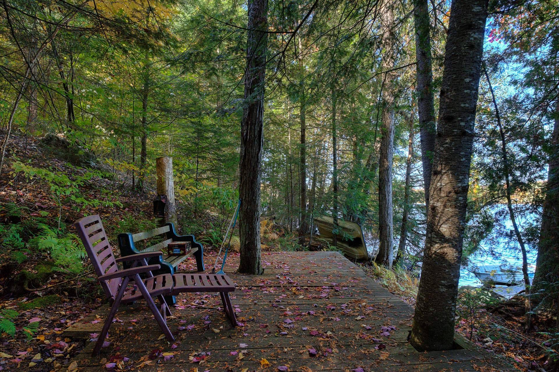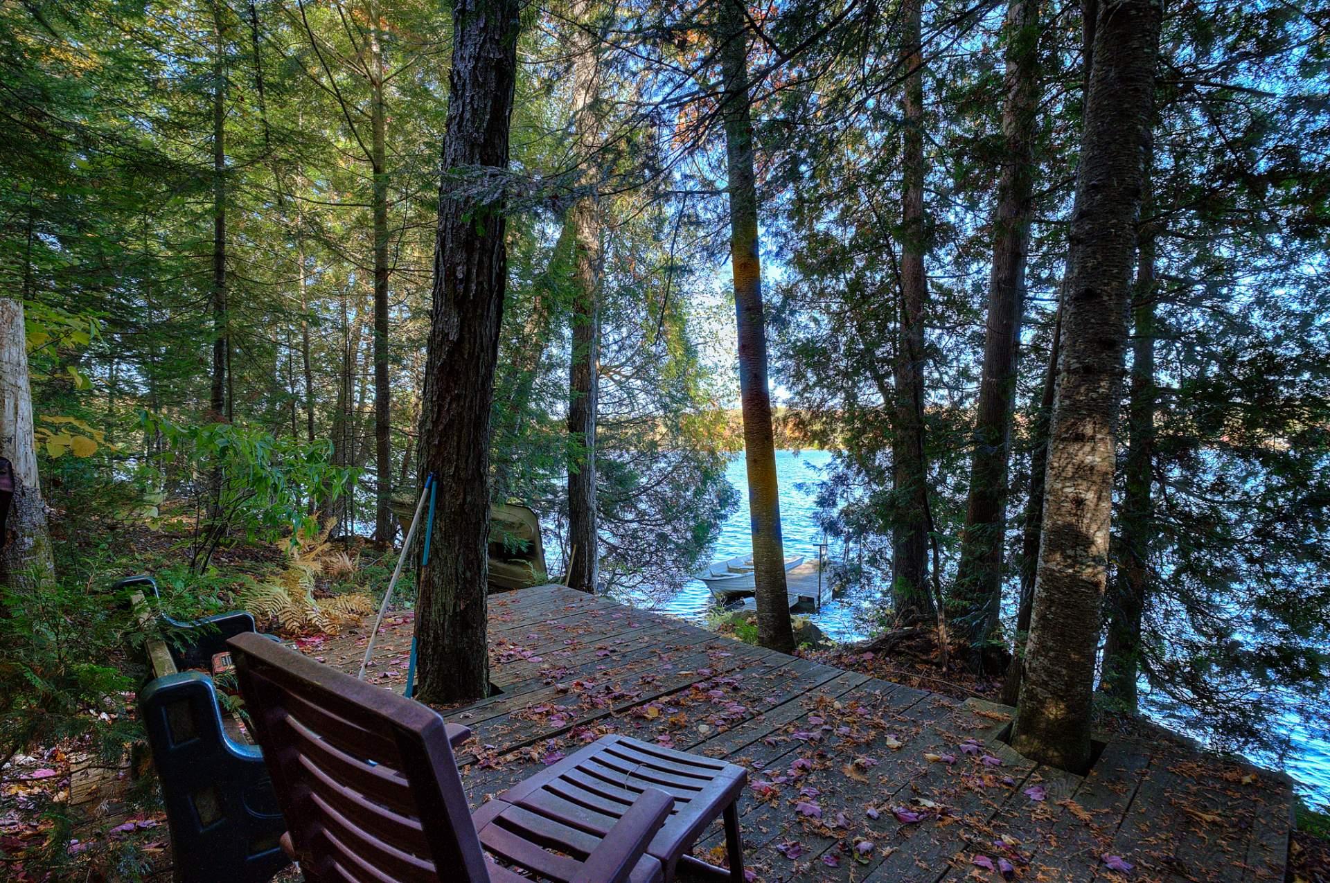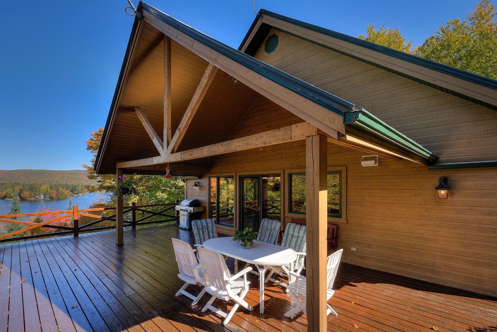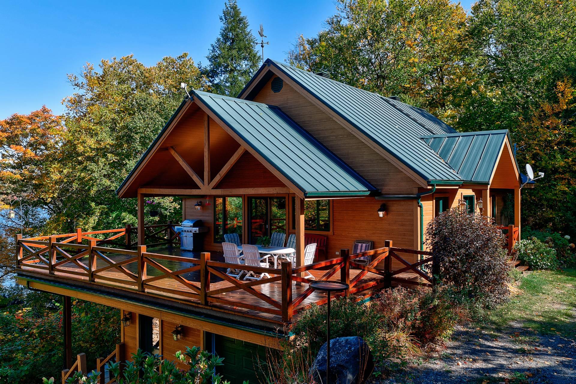 La terrasse principale, orientée vers le soleil d'après-midi, devient un prolongement naturel des aires de vie. On y profite d'une vue imprenable sur le terrain et sur le sentier privé menant au quai, où baignade, pêche, kayak et navigation tranquille se côtoient.