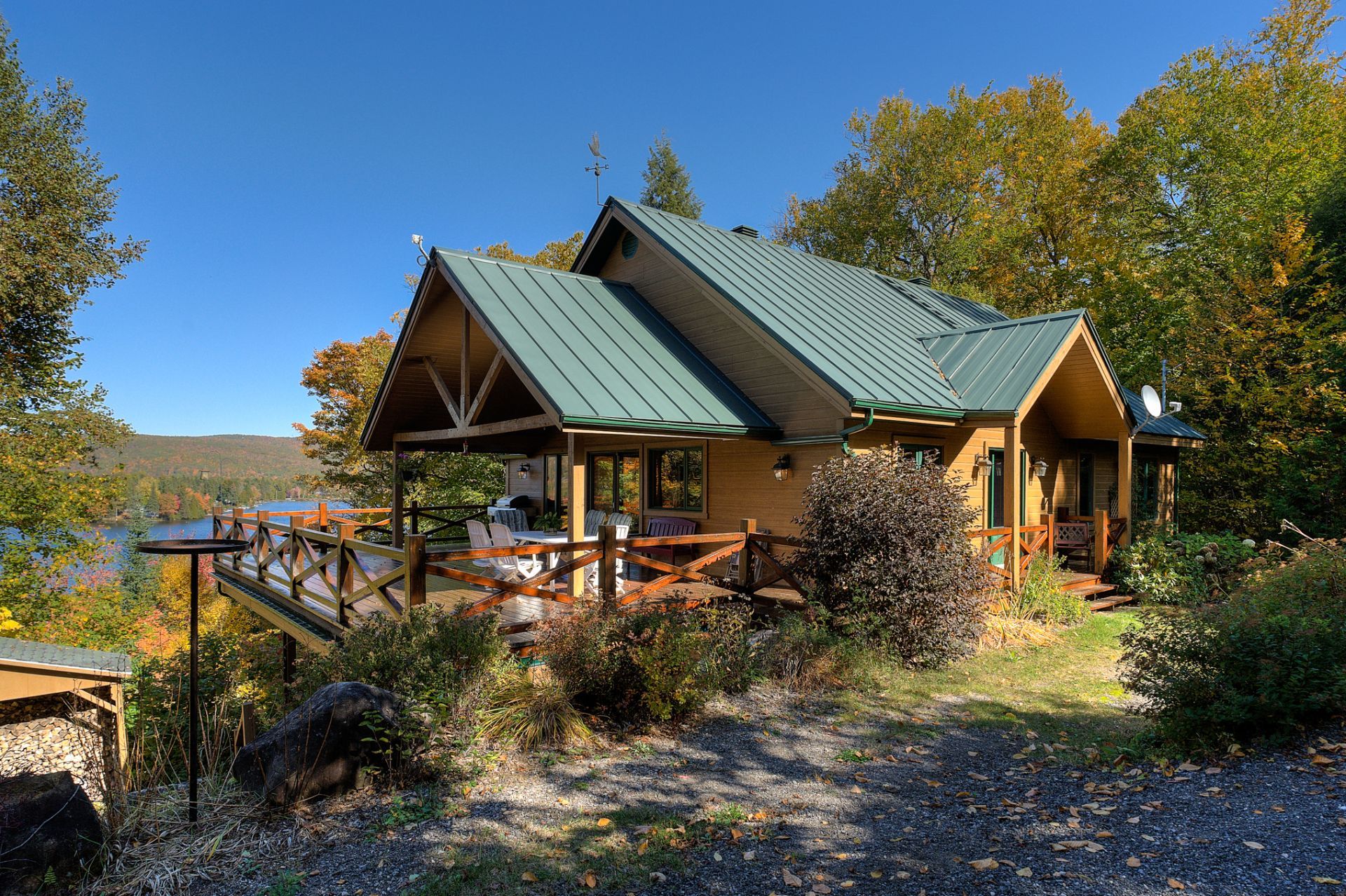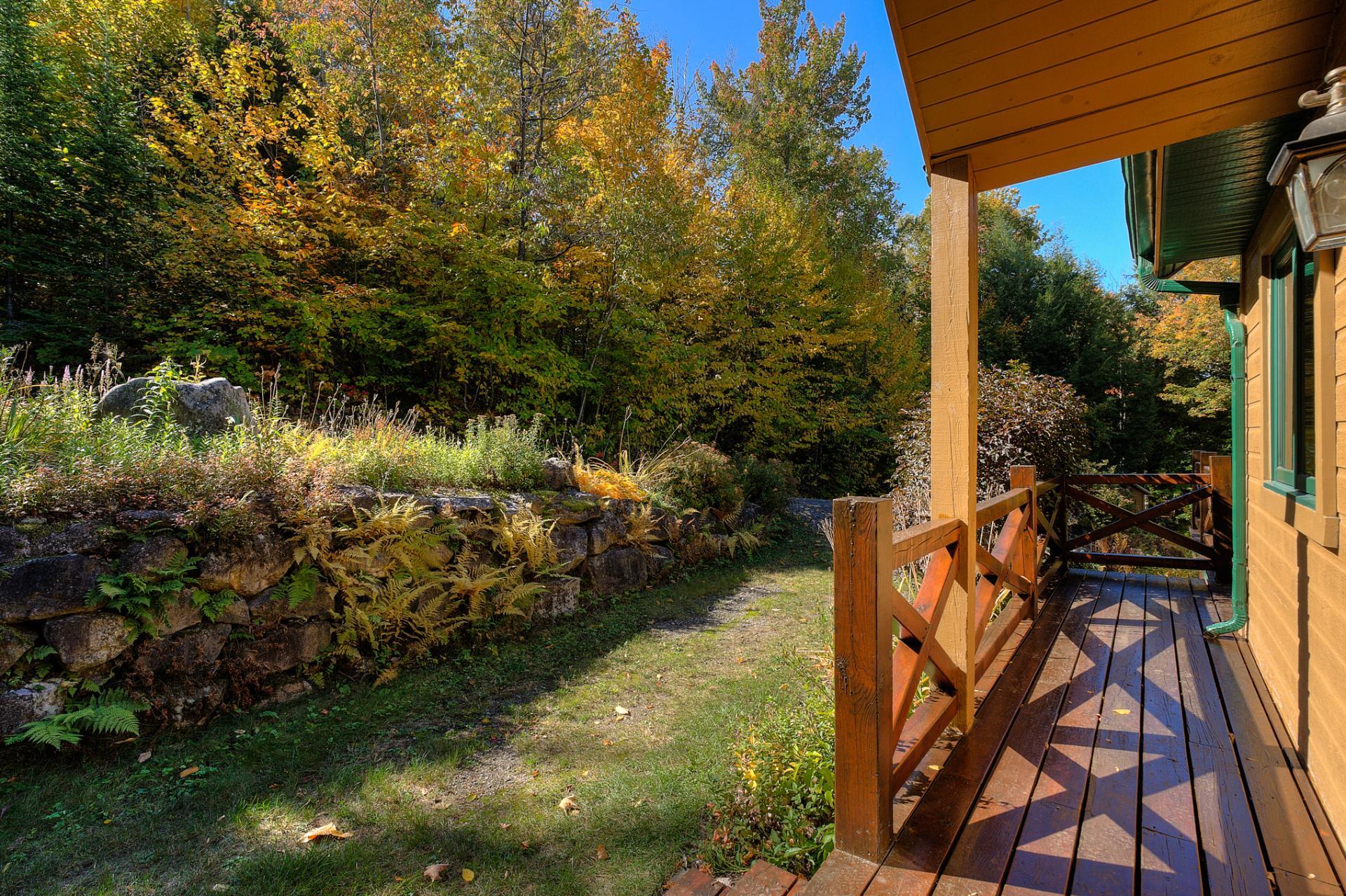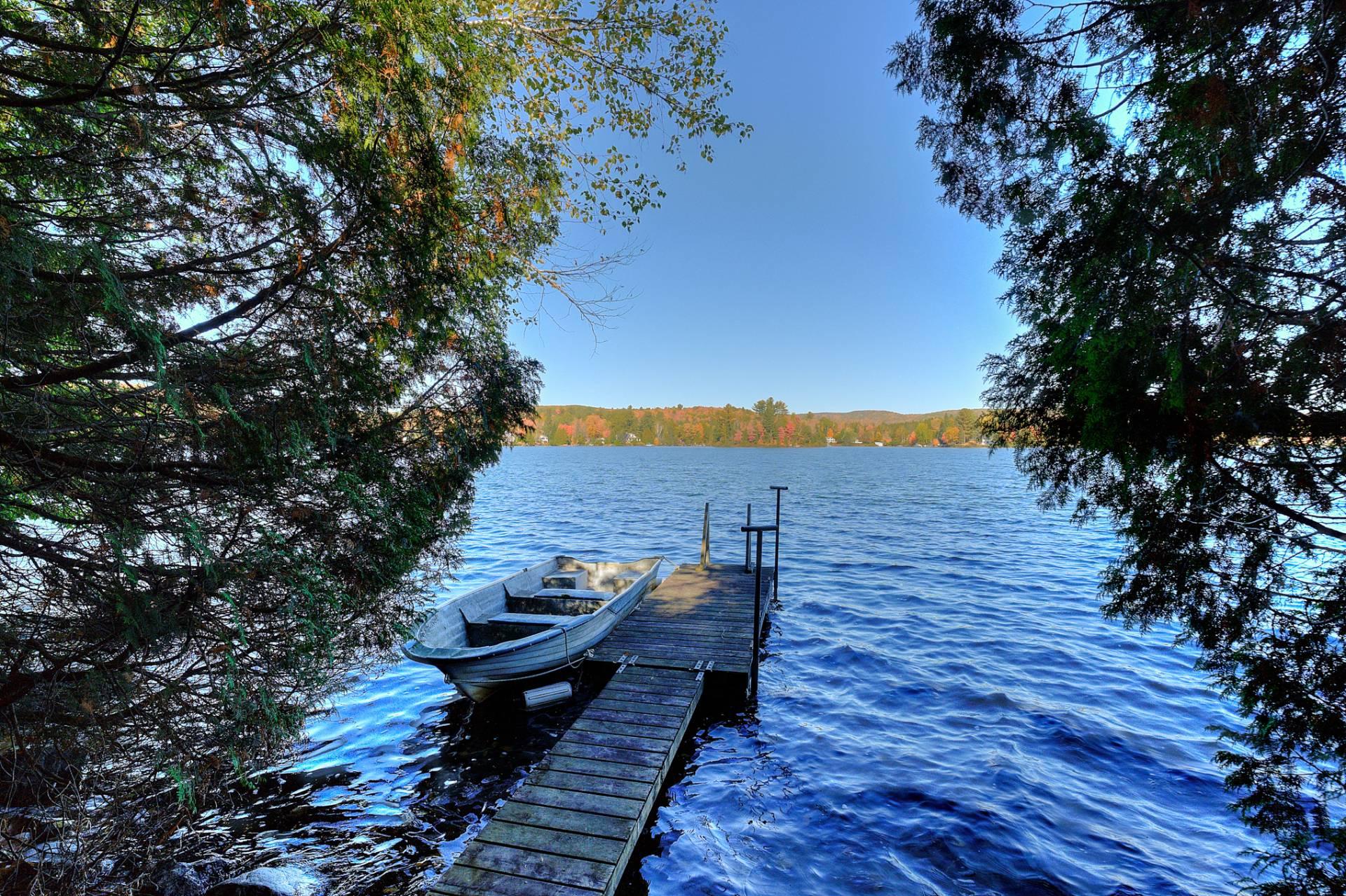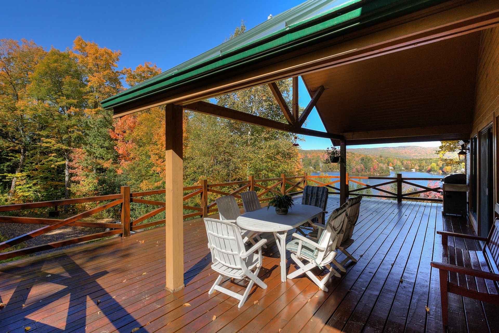 La terrasse principale, orientée vers le soleil d'après-midi, devient un prolongement naturel des aires de vie. On y profite d'une vue imprenable sur le terrain et sur le sentier privé menant au quai, où baignade, pêche, kayak et navigation tranquille se côtoient.