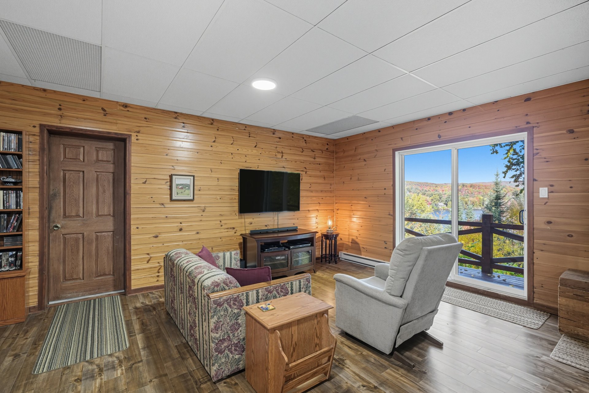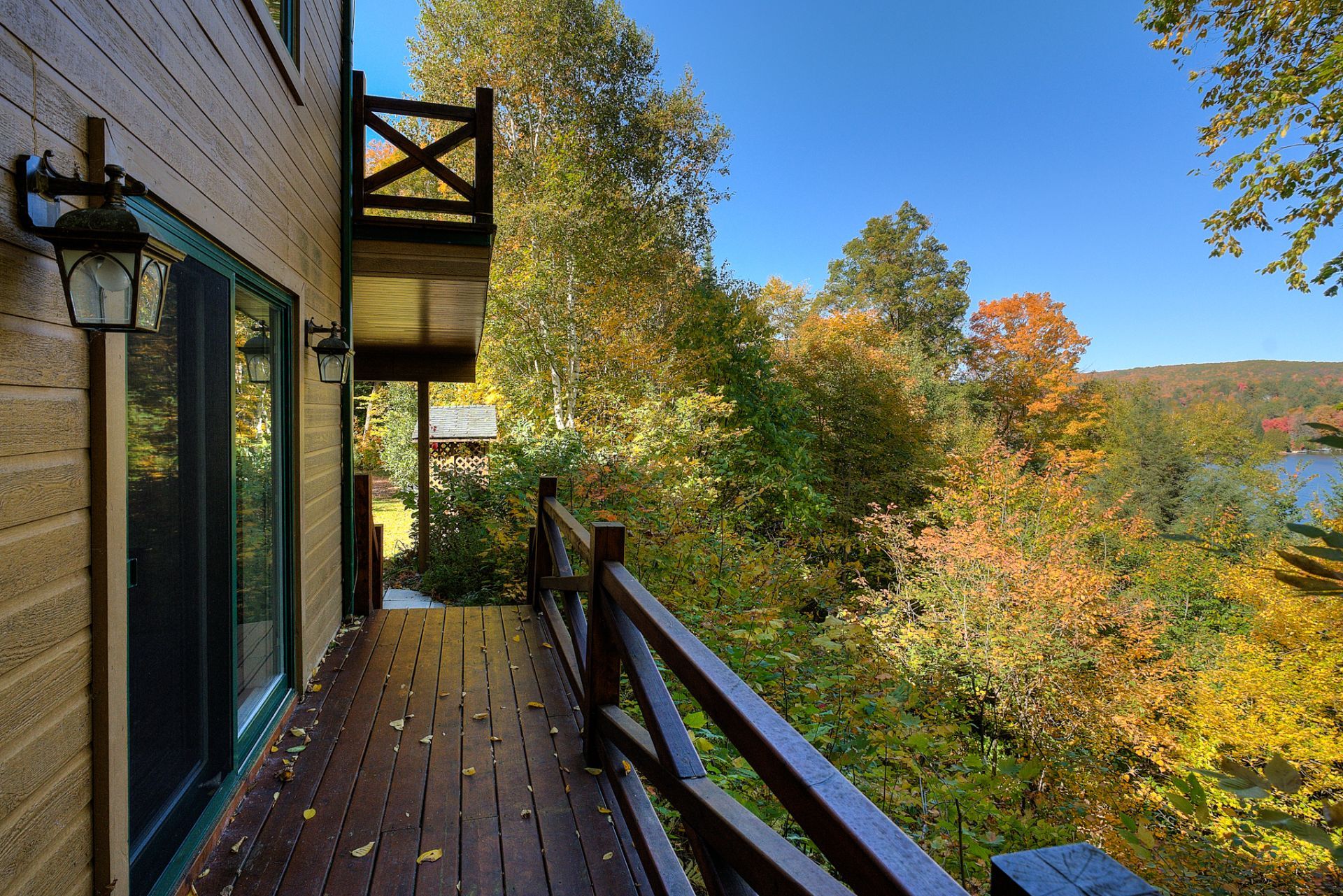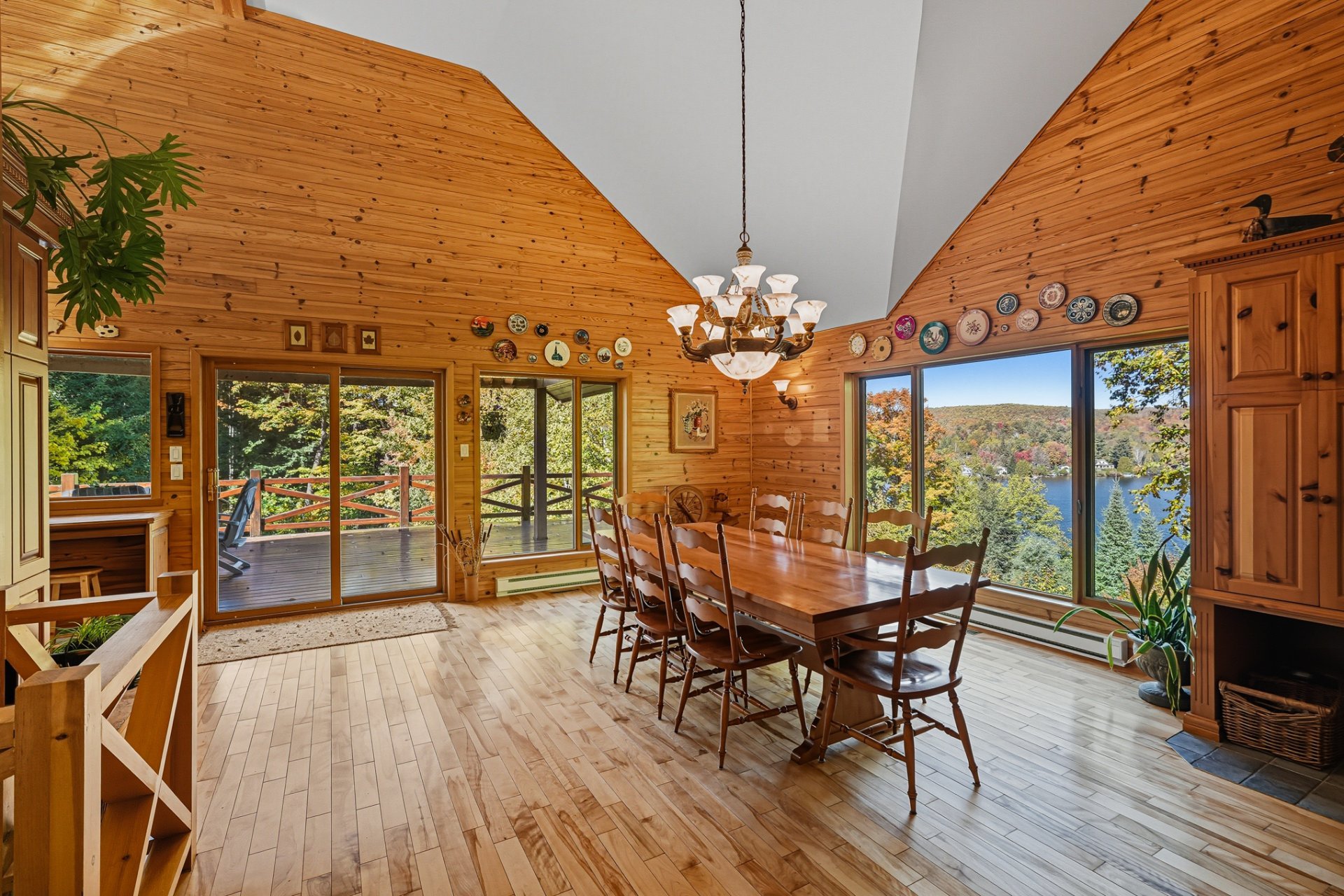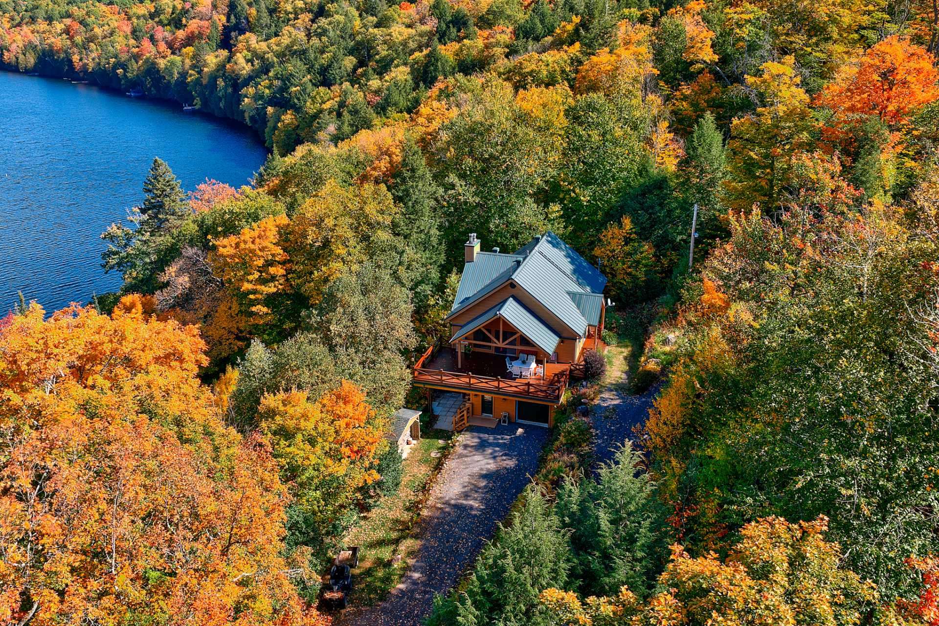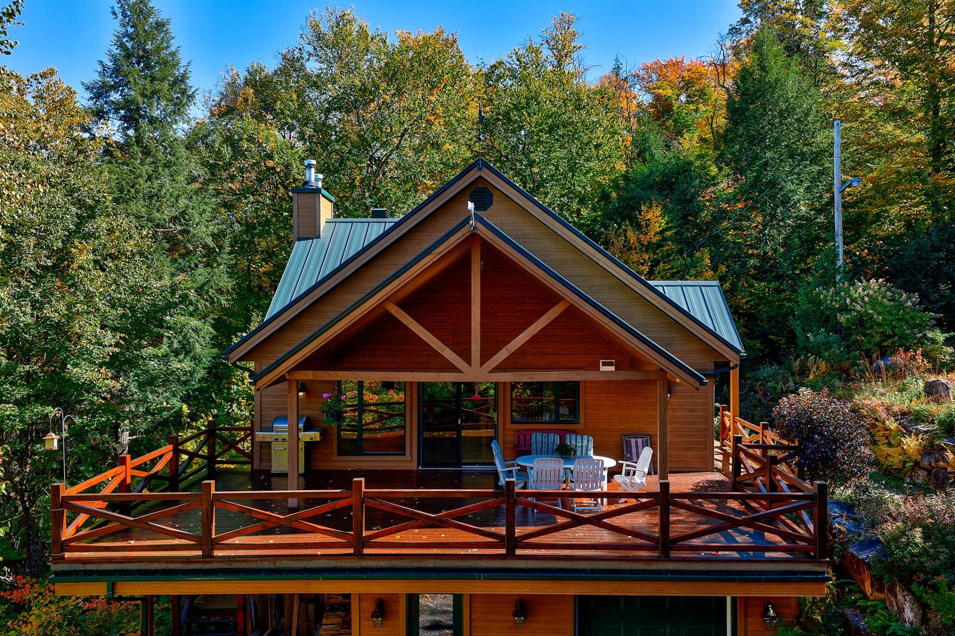 La terrasse principale, orientée vers le soleil d'après-midi, devient un prolongement naturel des aires de vie. On y profite d'une vue imprenable sur le terrain et sur le sentier privé menant au quai, où baignade, pêche, kayak et navigation tranquille se côtoient.