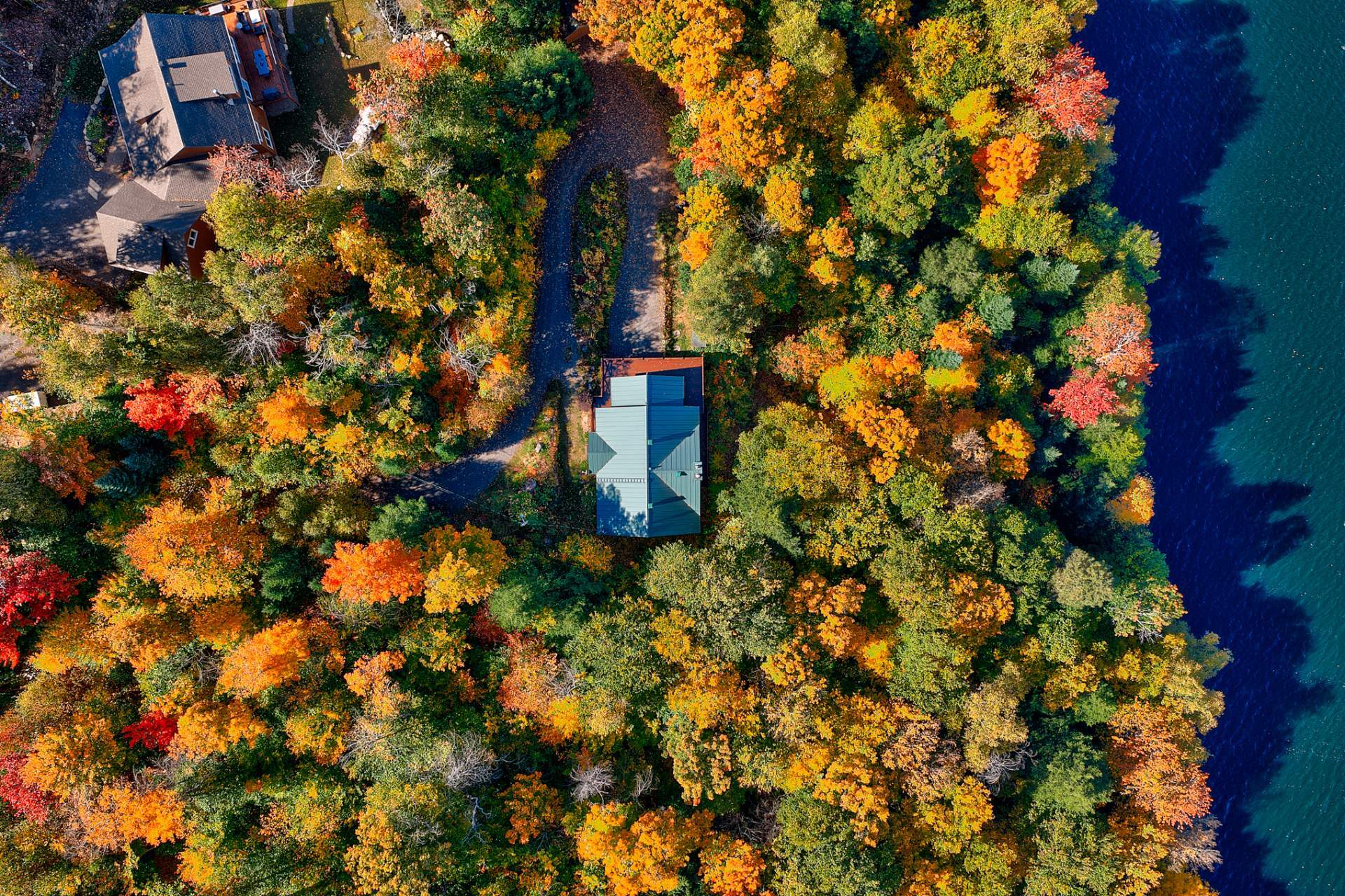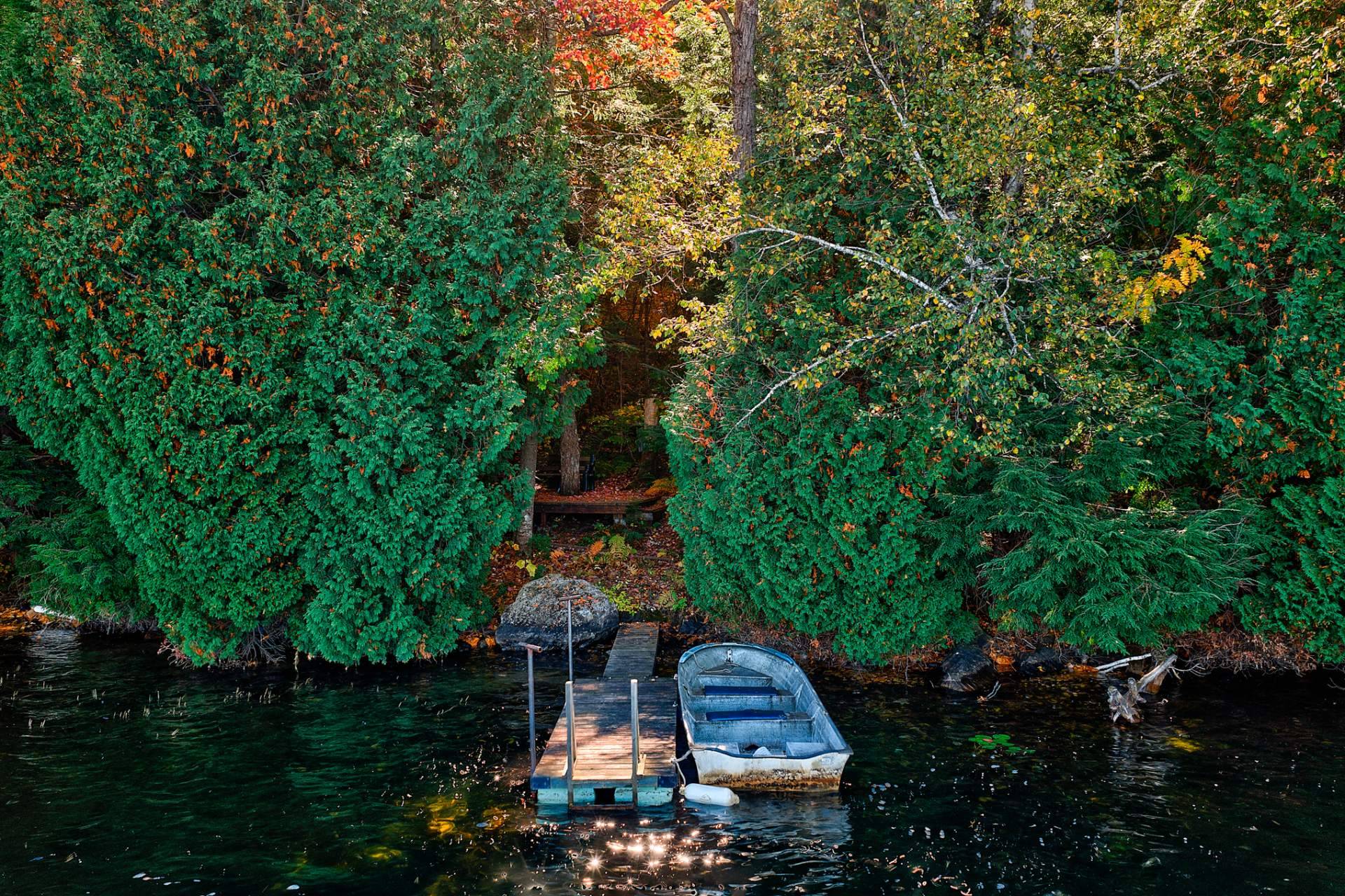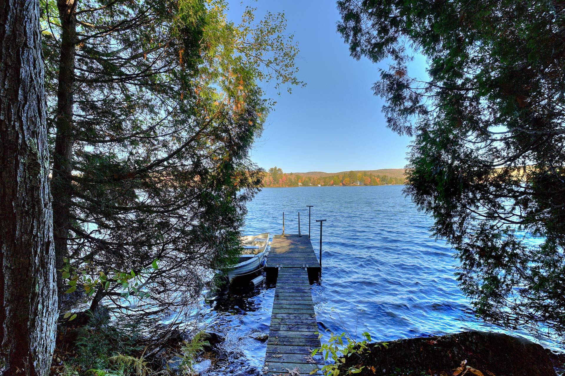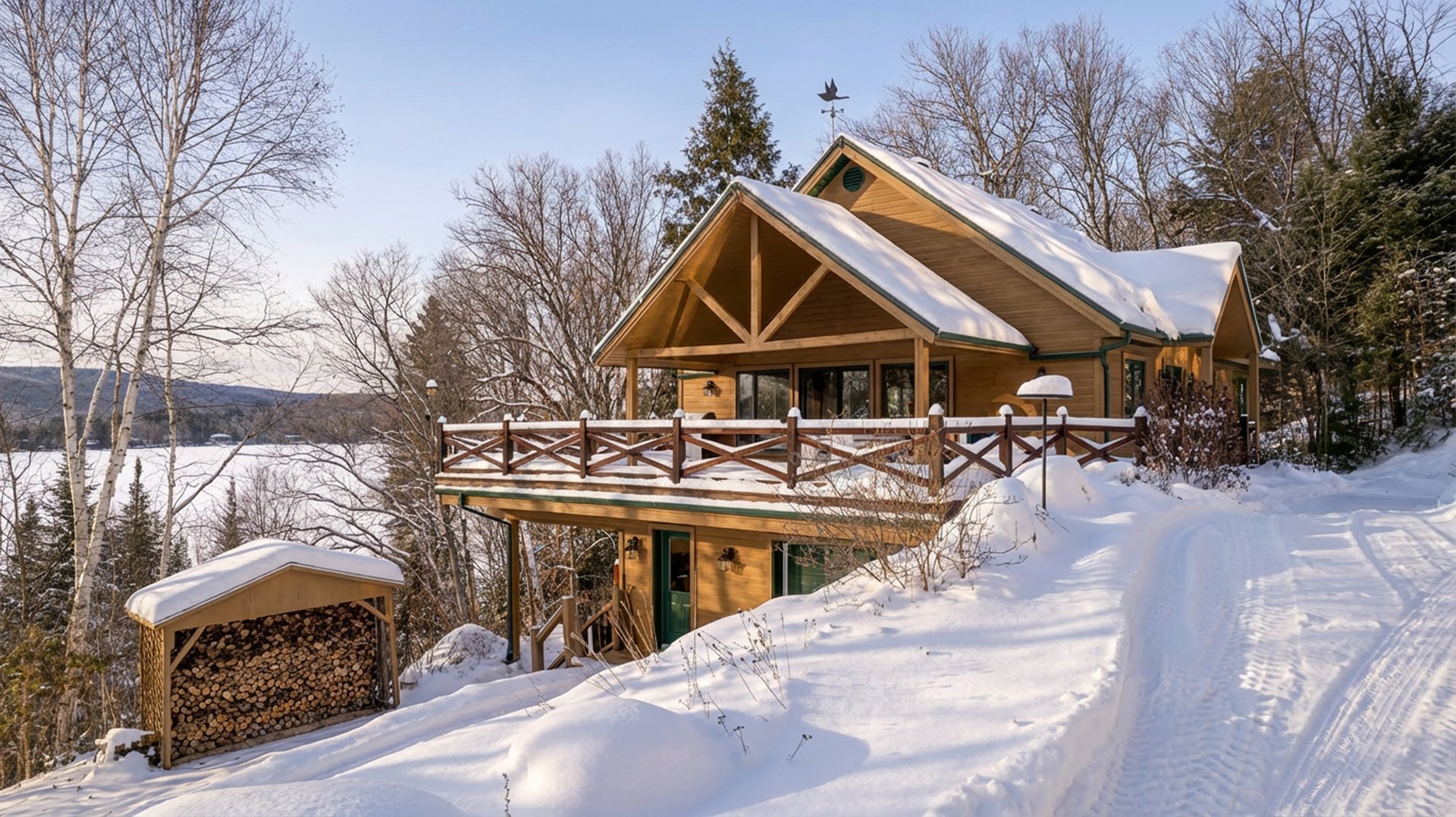 La terrasse principale, orientée vers le soleil d'après-midi, devient un prolongement naturel des aires de vie. On y profite d'une vue imprenable sur le terrain et sur le sentier privé menant au quai, où baignade, pêche, kayak et navigation tranquille se côtoient.