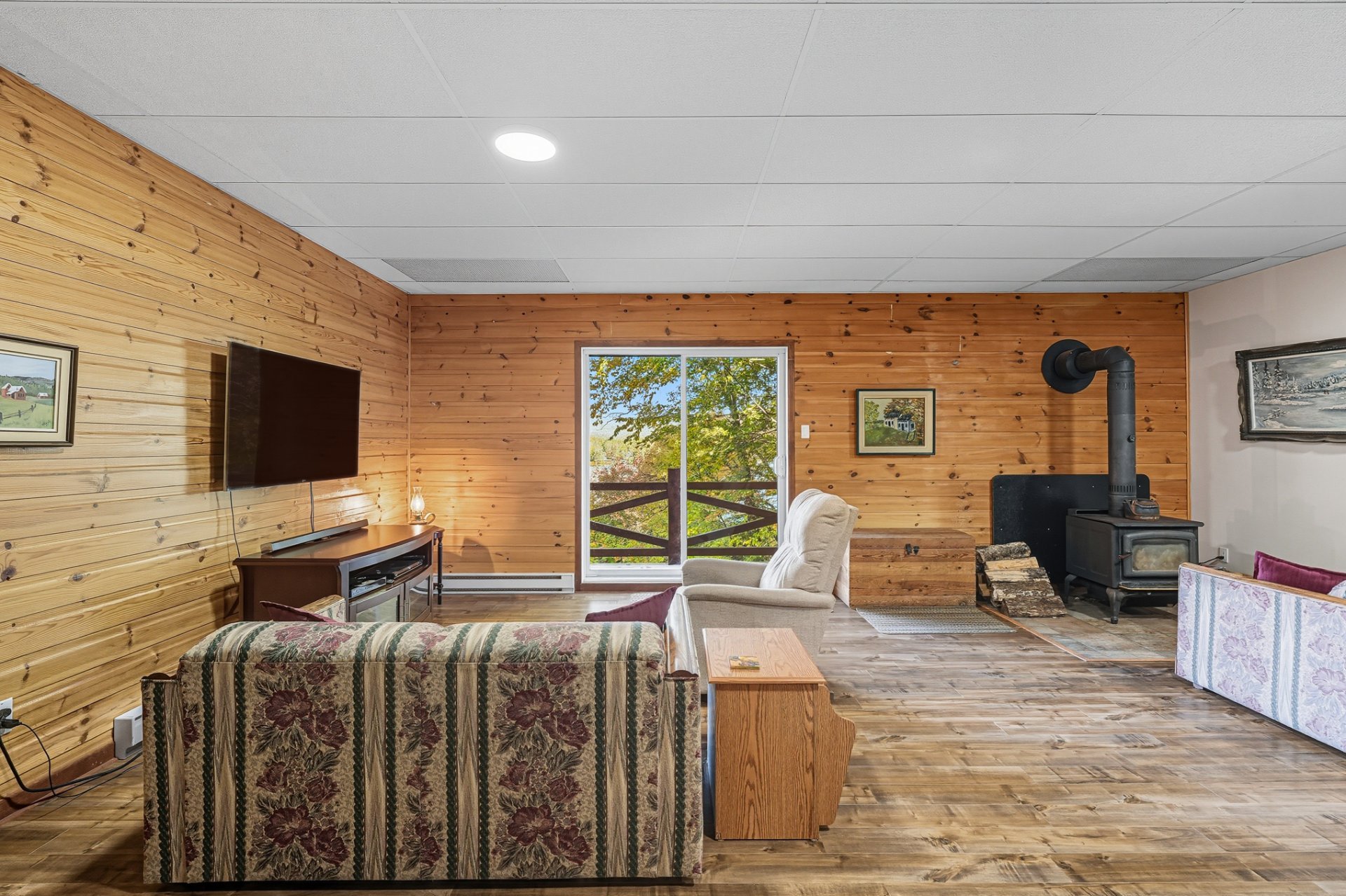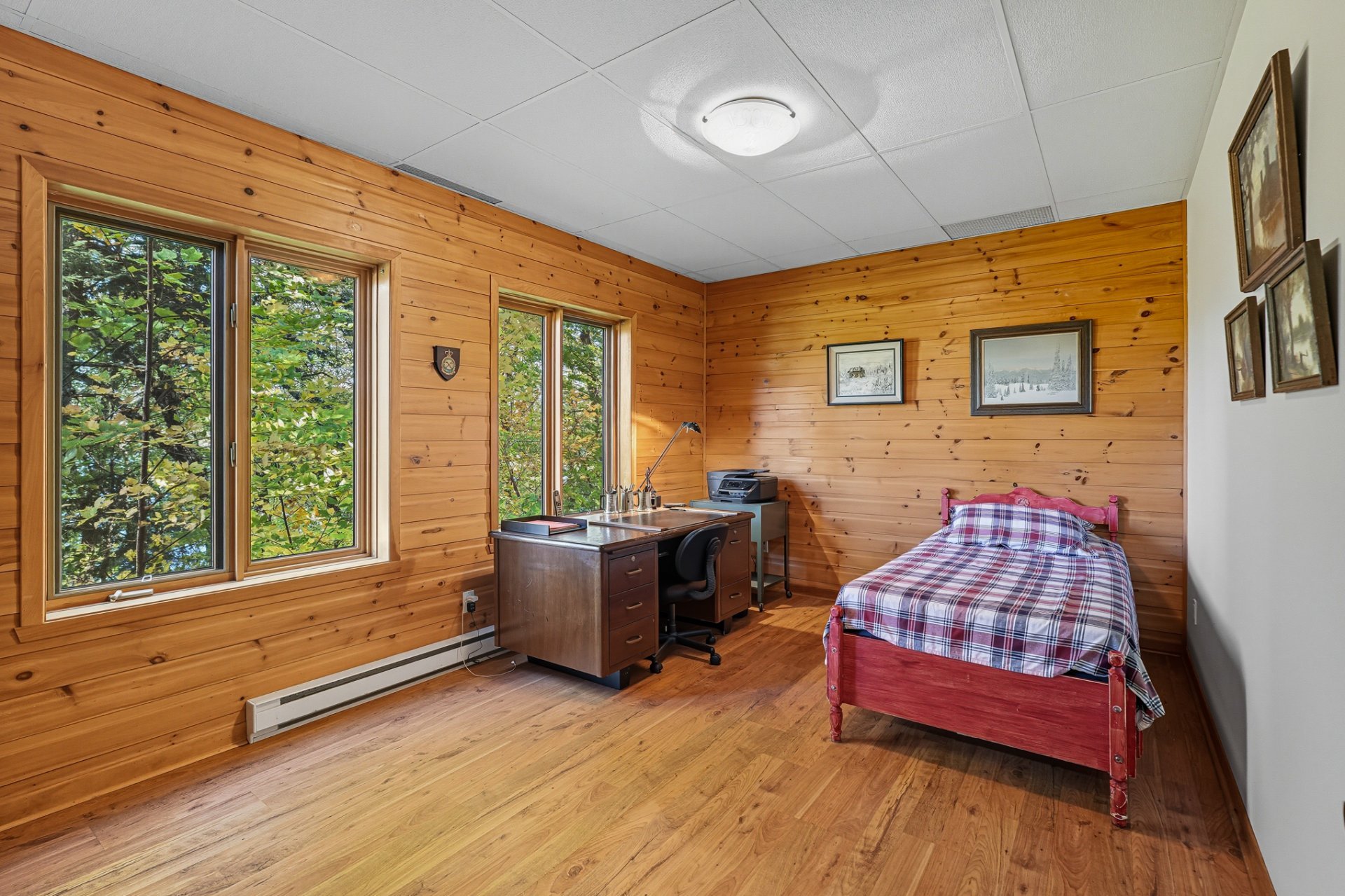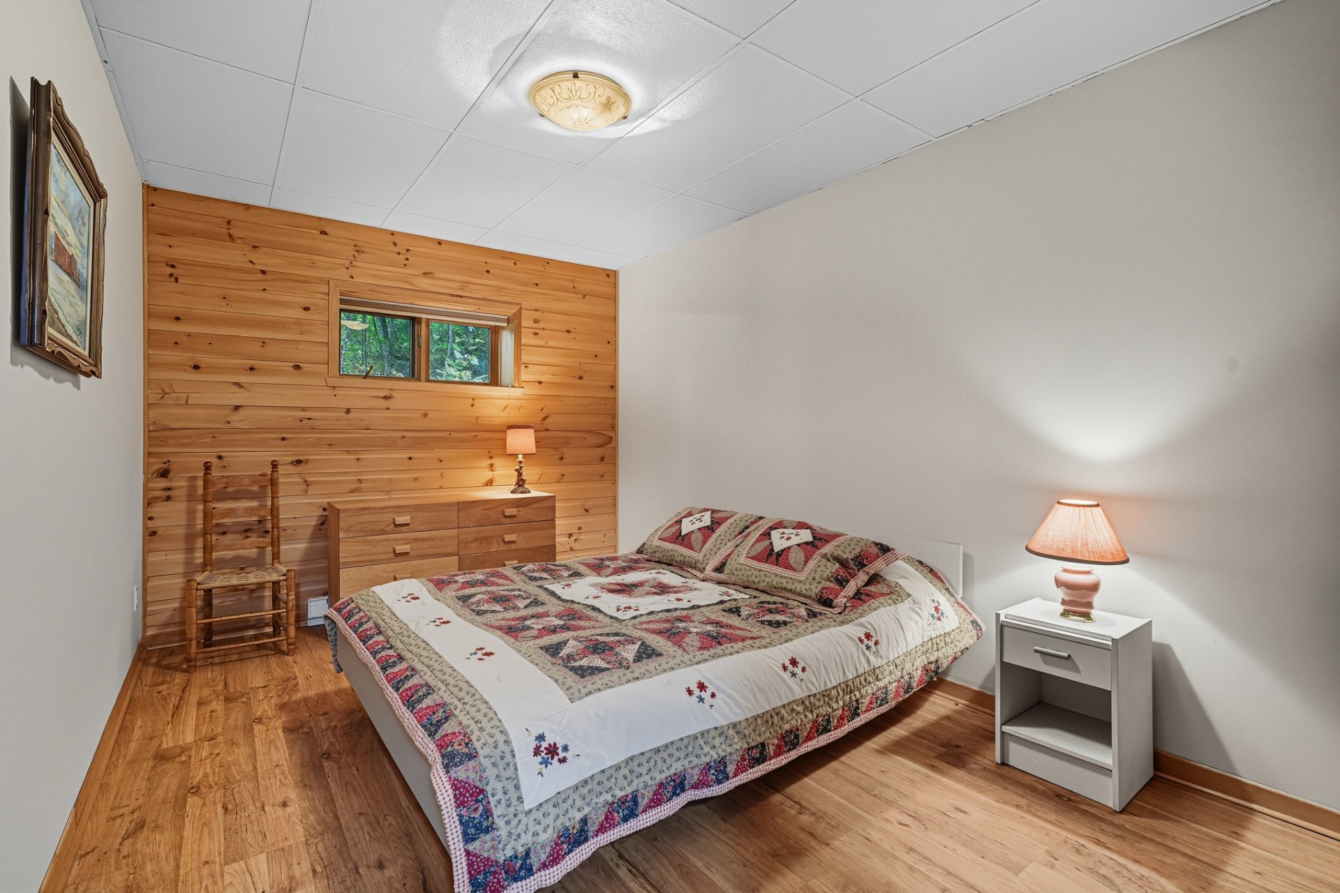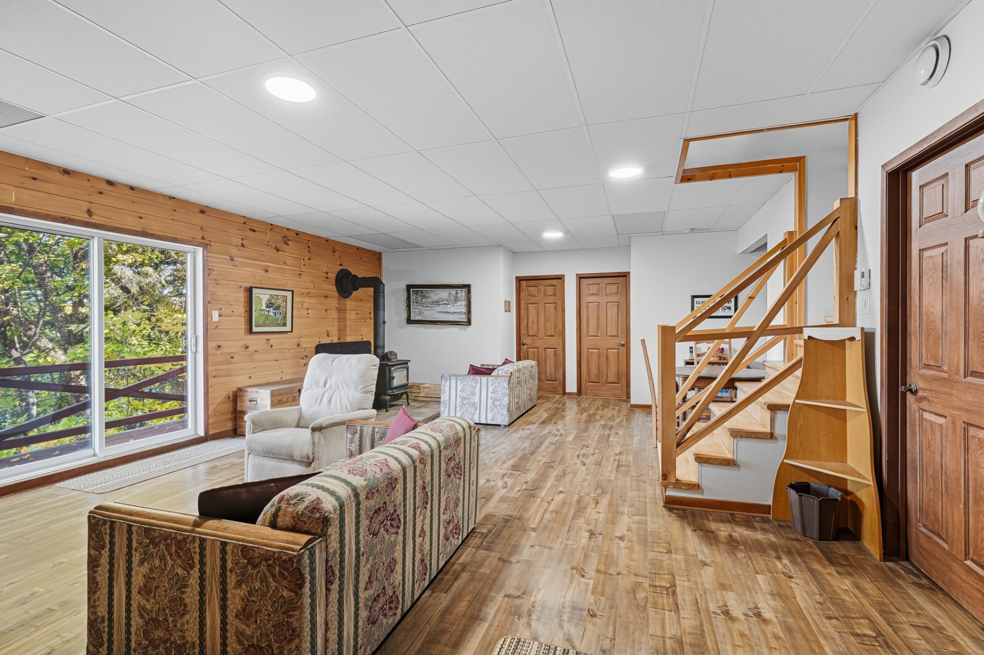 La chambre principale, avec salle de bain attenante, bain thérapeutique et douche indépendante, complète harmonieusement le rez-de-chaussée. À l'étage inférieur, une grande salle familiale avec poêle à bois, trois chambres additionnelles et une salle de bain offrent tout le confort nécessaire pour accueillir famille et amis.