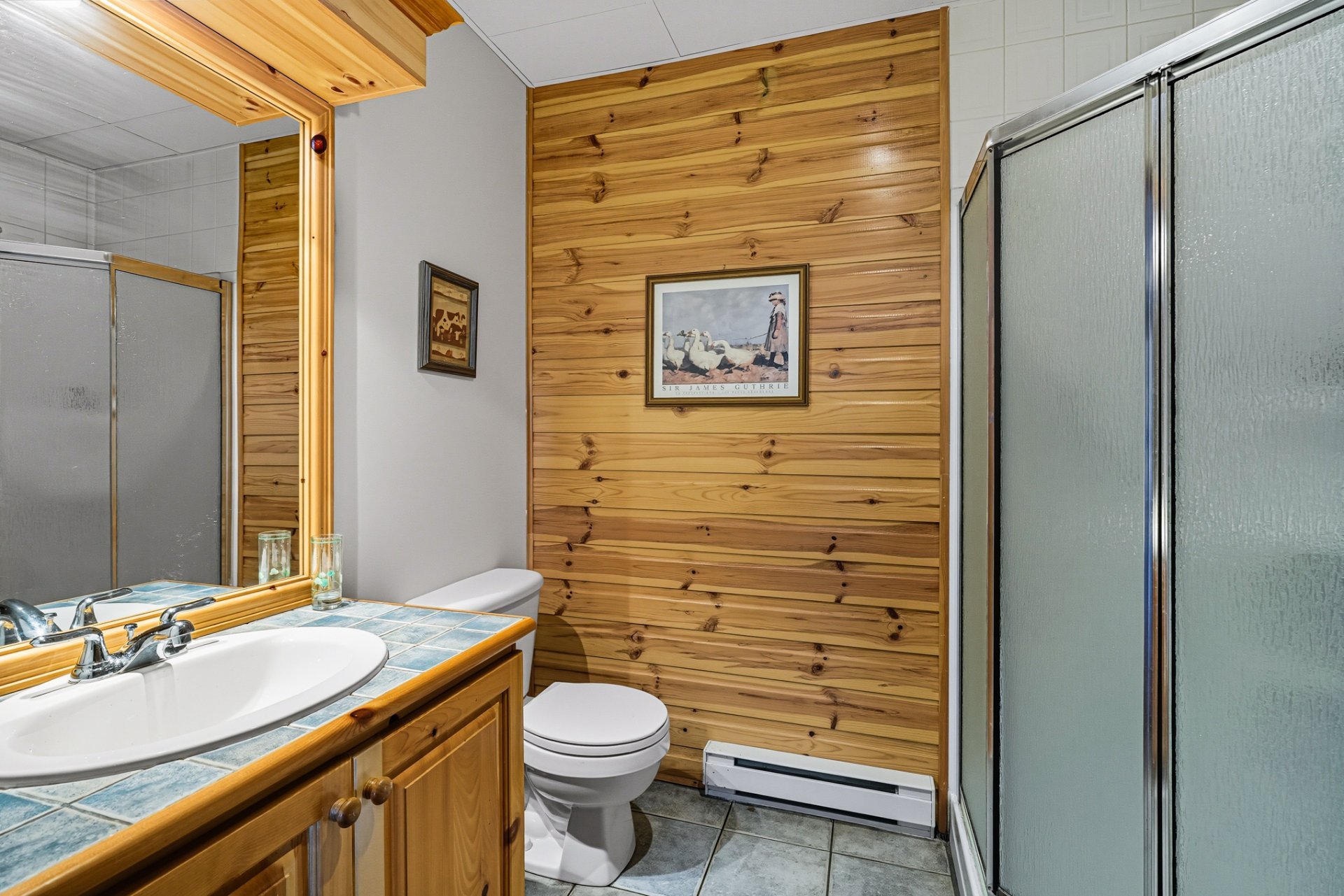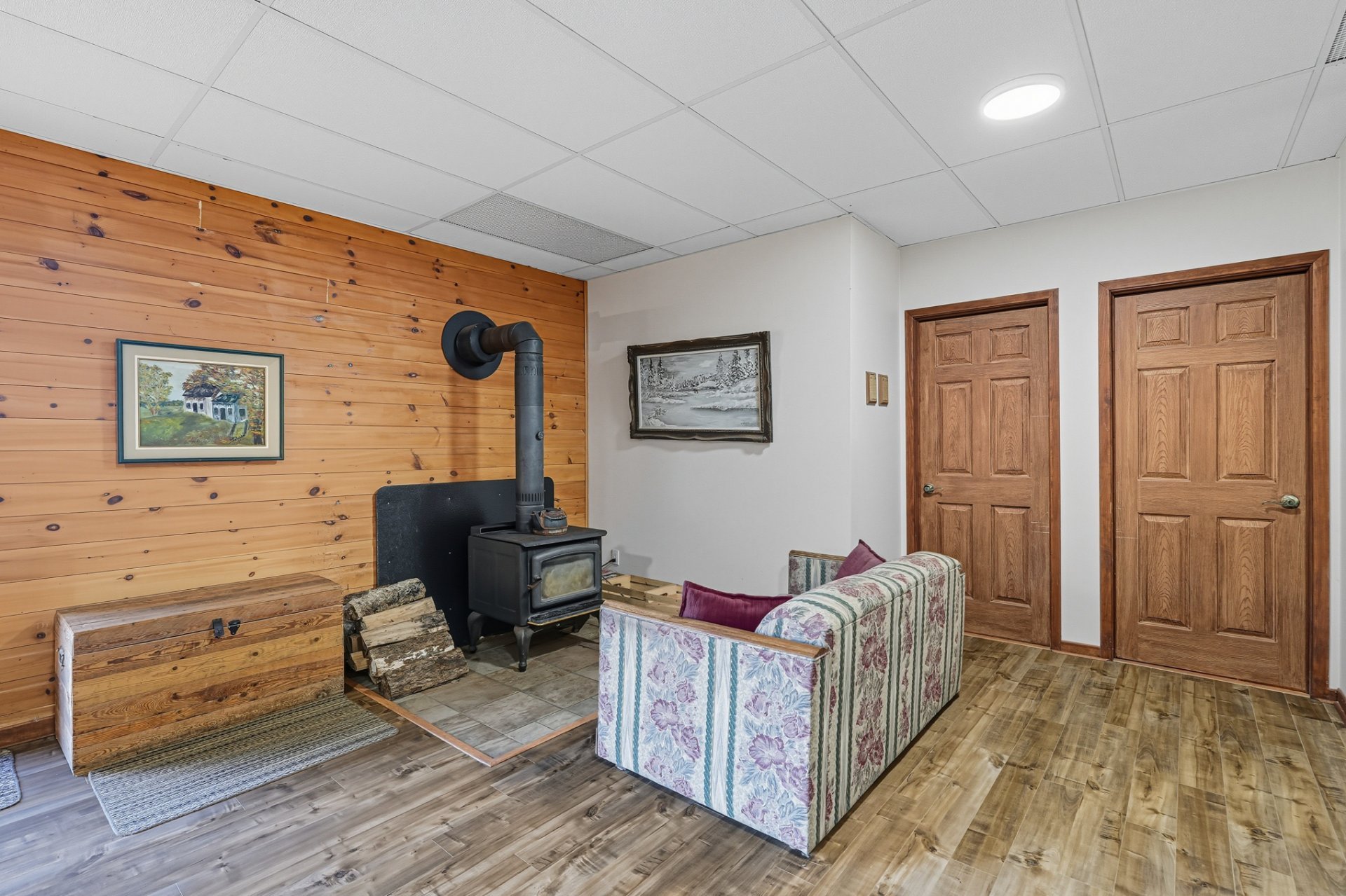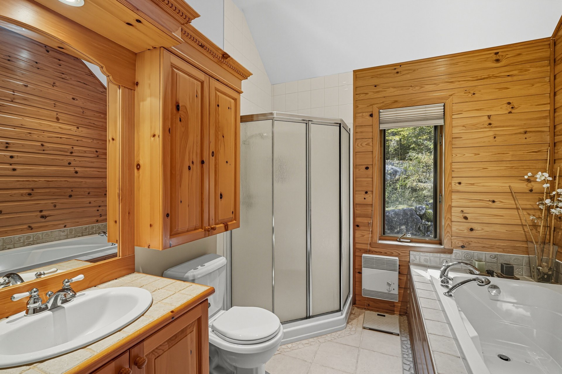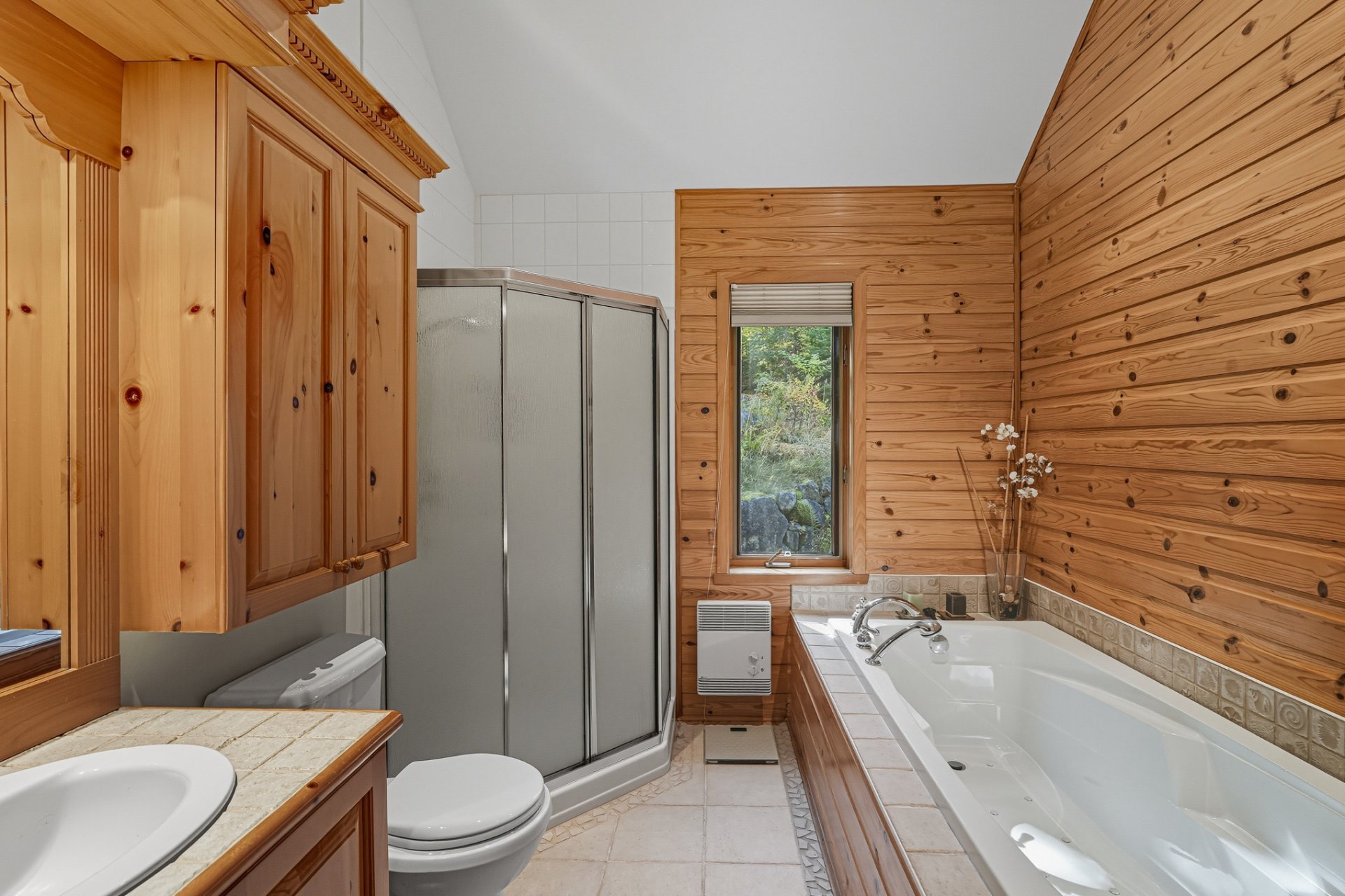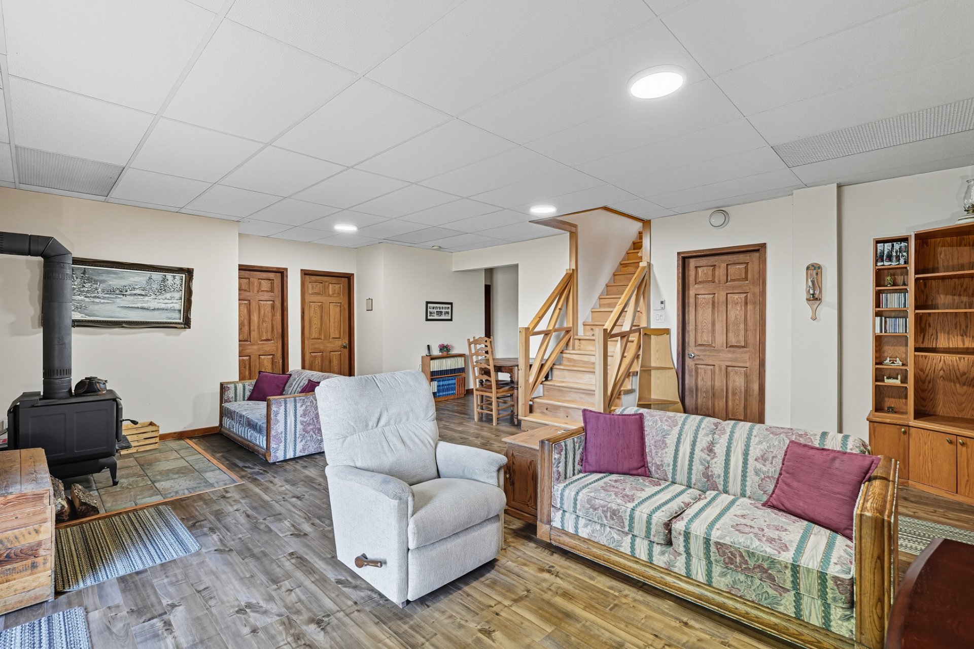 La chambre principale, avec salle de bain attenante, bain thérapeutique et douche indépendante, complète harmonieusement le rez-de-chaussée. À l'étage inférieur, une grande salle familiale avec poêle à bois, trois chambres additionnelles et une salle de bain offrent tout le confort nécessaire pour accueillir famille et amis.
