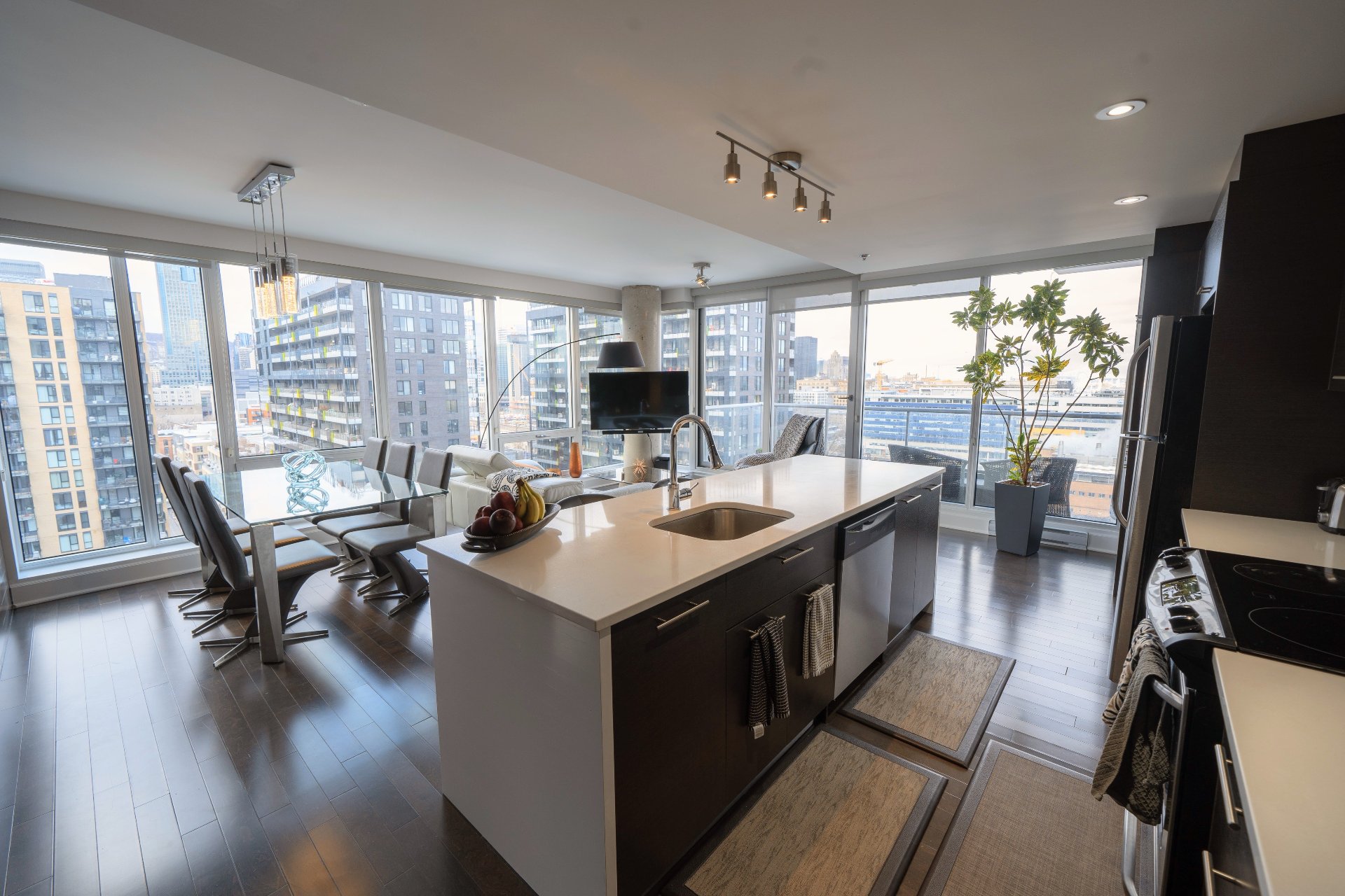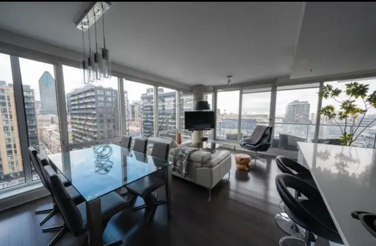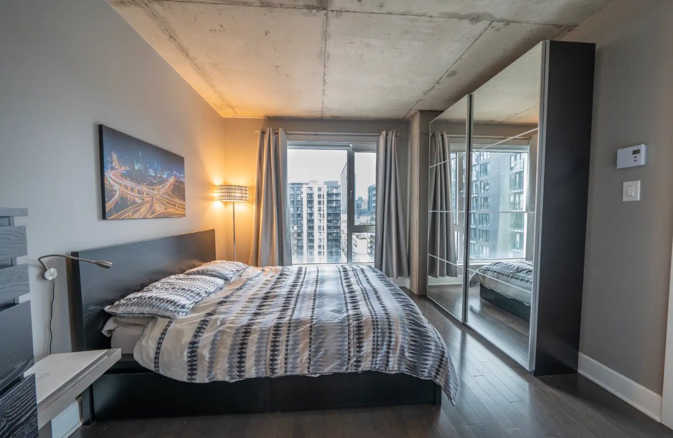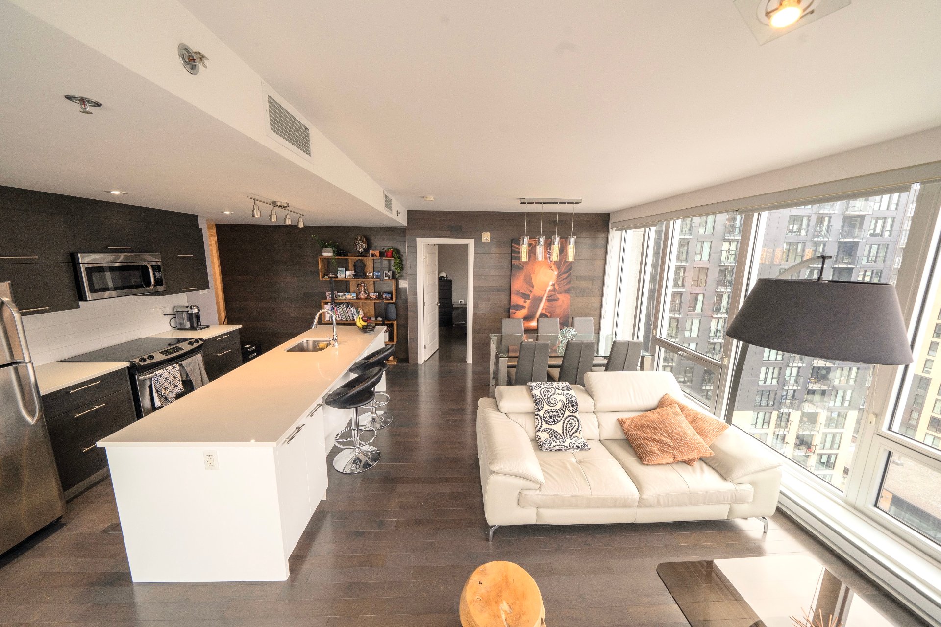 Spacious 1-bedroom corner condo for rent in Griffintown, 775 sq. ft. on the 17th floor with great city views. Bright unit with floor-to-ceiling windows, walk-in closet, dining and living areas, office nook, and large bathroom with shower and tub. Includes laundry and entry closets. Excellent location at Peel & Wellington, close to shops, restaurants, and less than 1 km from Bonaventure Metro.