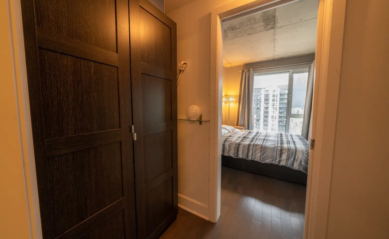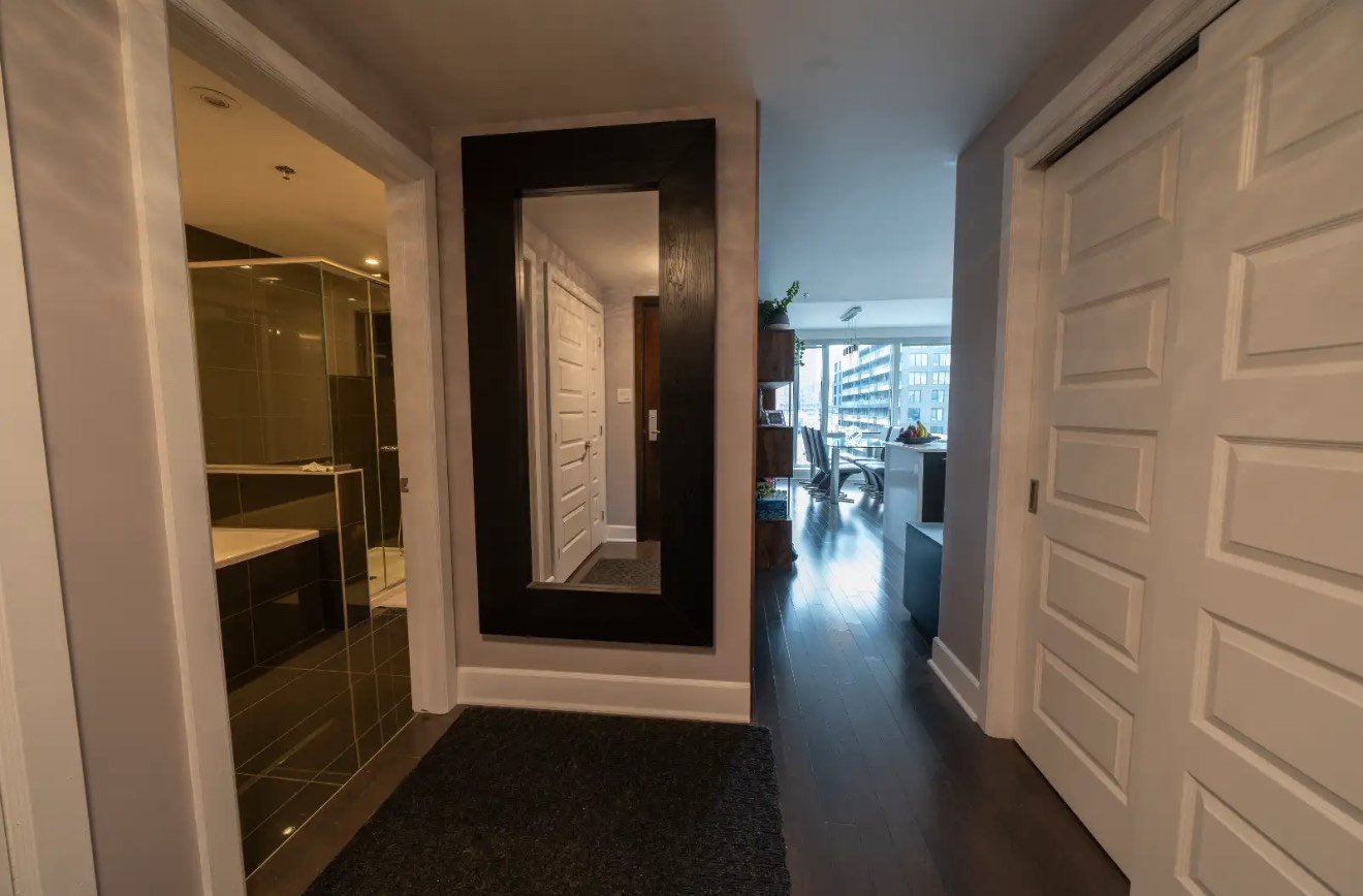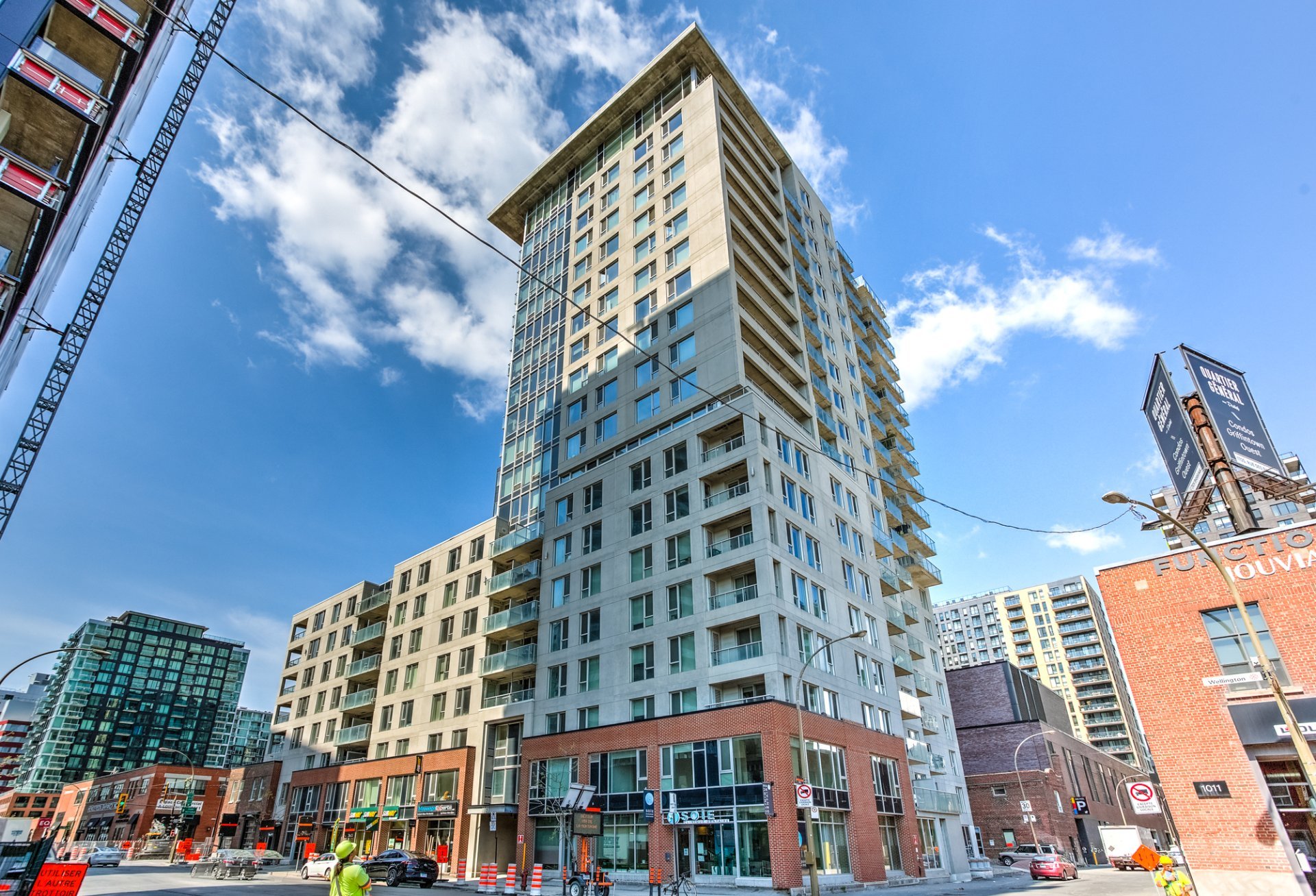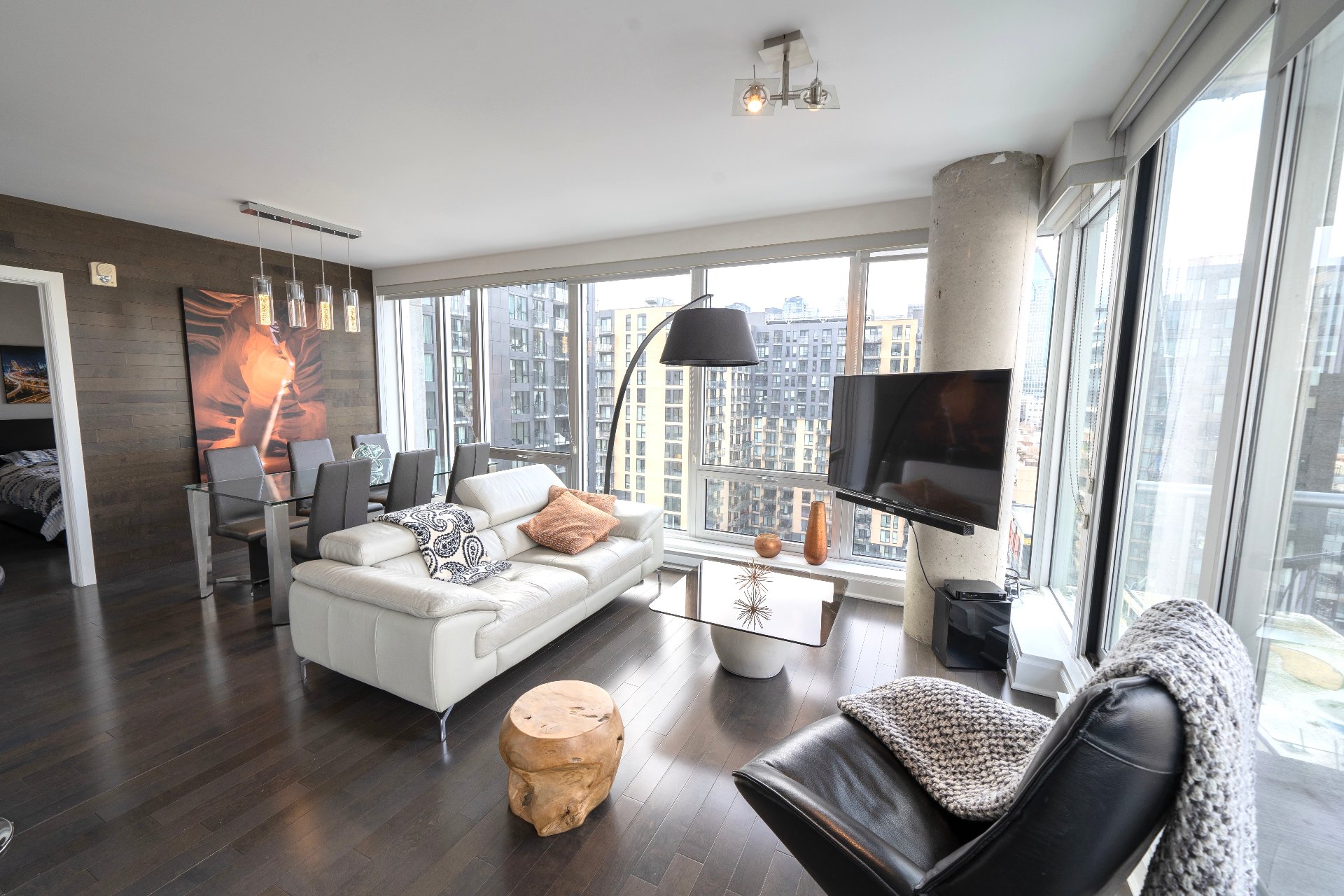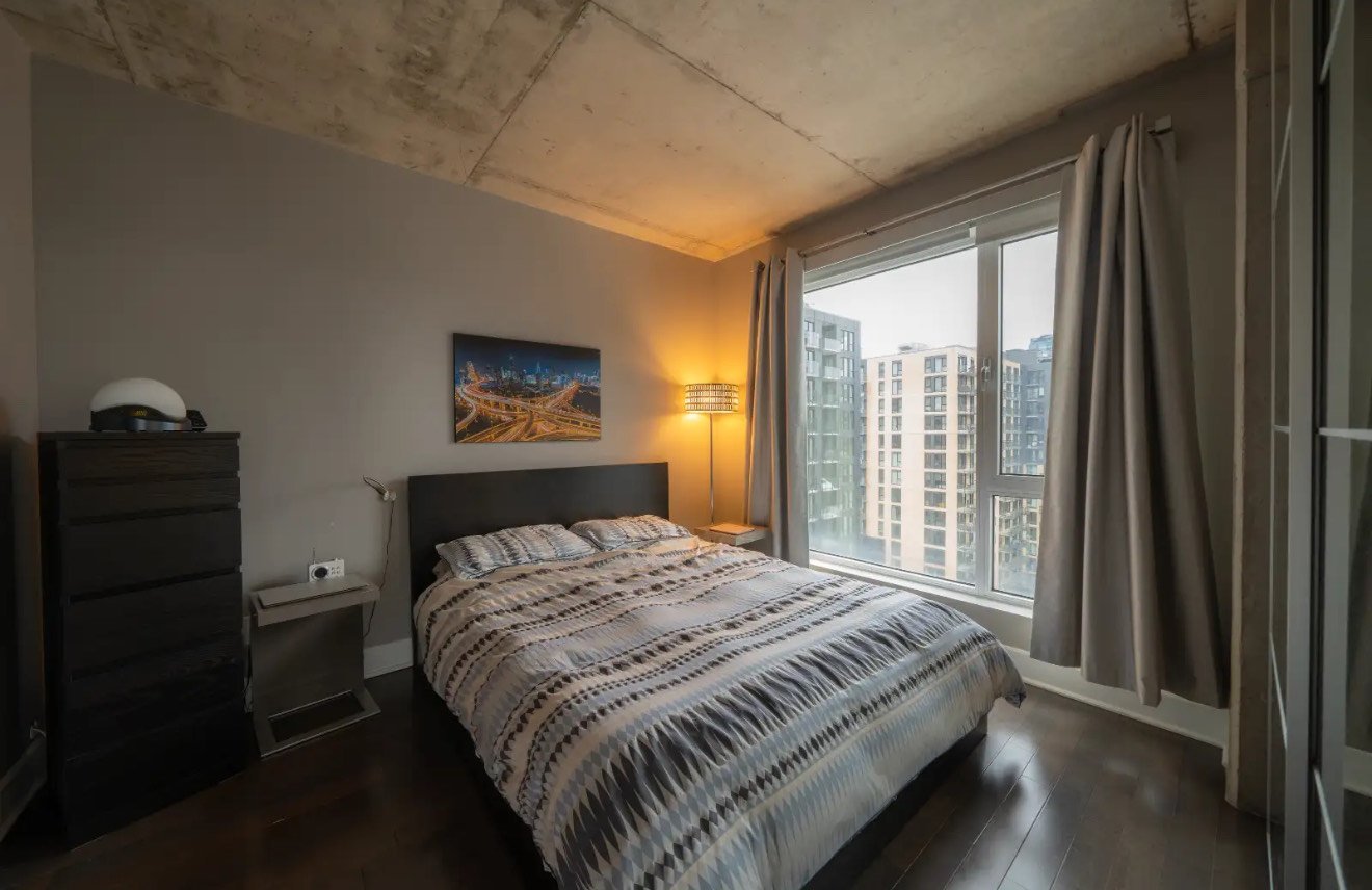 Spacious 1-bedroom corner condo for rent in Griffintown, 775 sq. ft. on the 17th floor with great city views. Bright unit with floor-to-ceiling windows, walk-in closet, dining and living areas, office nook, and large bathroom with shower and tub. Includes laundry and entry closets. Excellent location at Peel & Wellington, close to shops, restaurants, and less than 1 km from Bonaventure Metro.