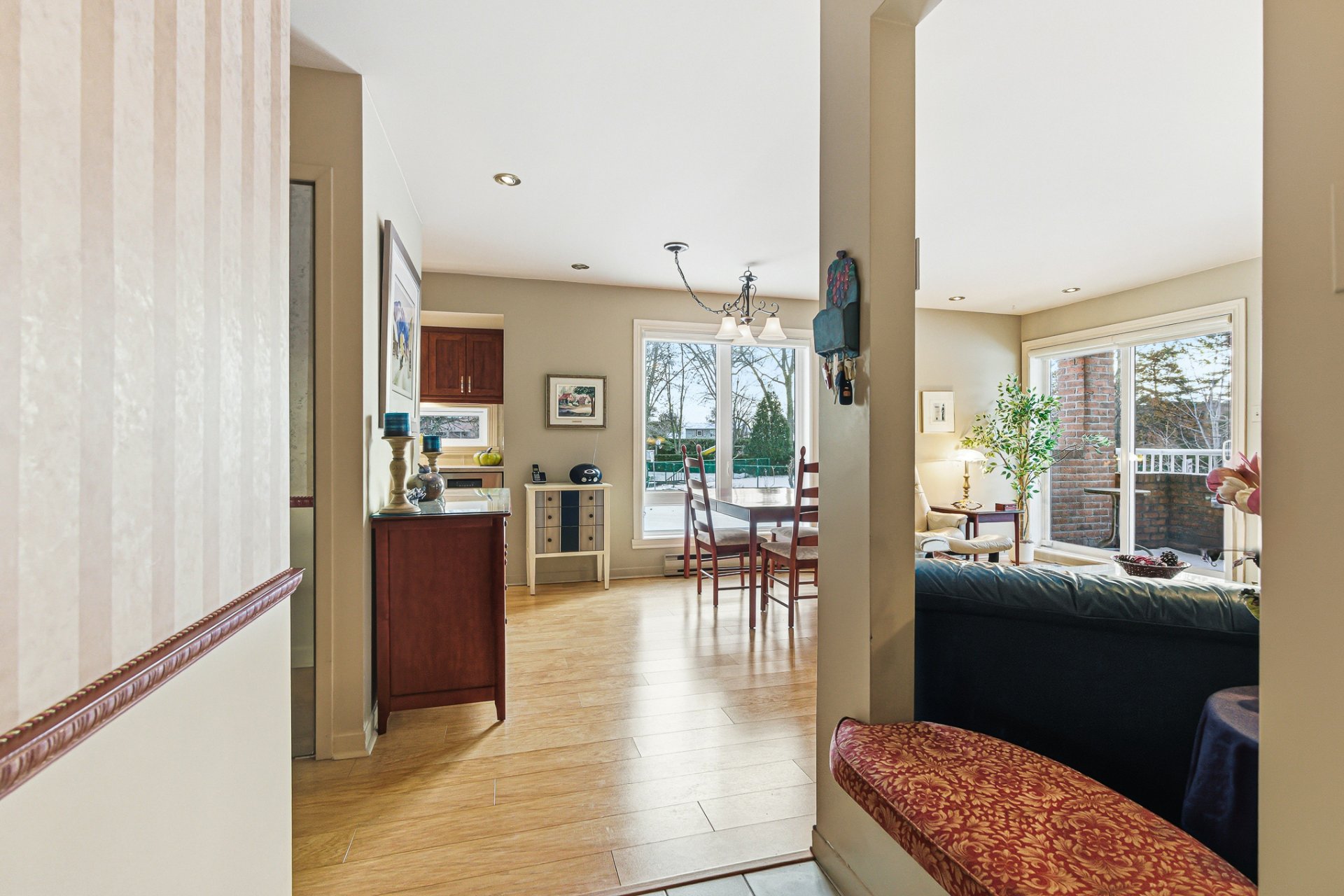 Le hall d'entrée, aménagé sur un plancher de céramique, comprend un grand garde-robe pratique pour ranger manteaux et effets personnels. Il s'ouvre ensuite sur un vaste salon baigné de lumière grâce aux nombreuses fenêtres qui entourent la pièce et illuminent l'ensemble du condo. La salle à manger s'intègre parfaitement à cet espace ouvert et bénéficie d'une grande fenêtre latérale qui accentue la luminosité.