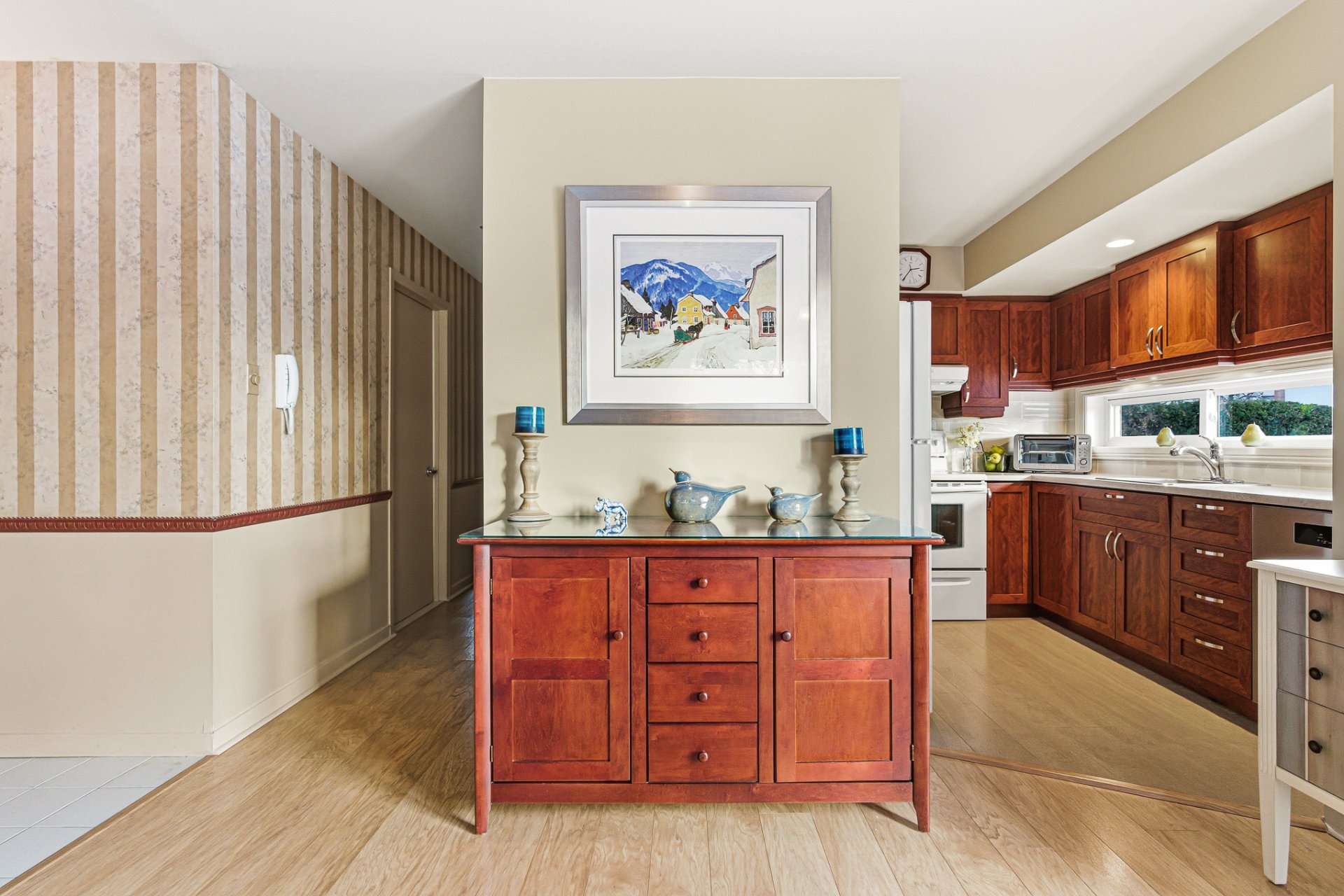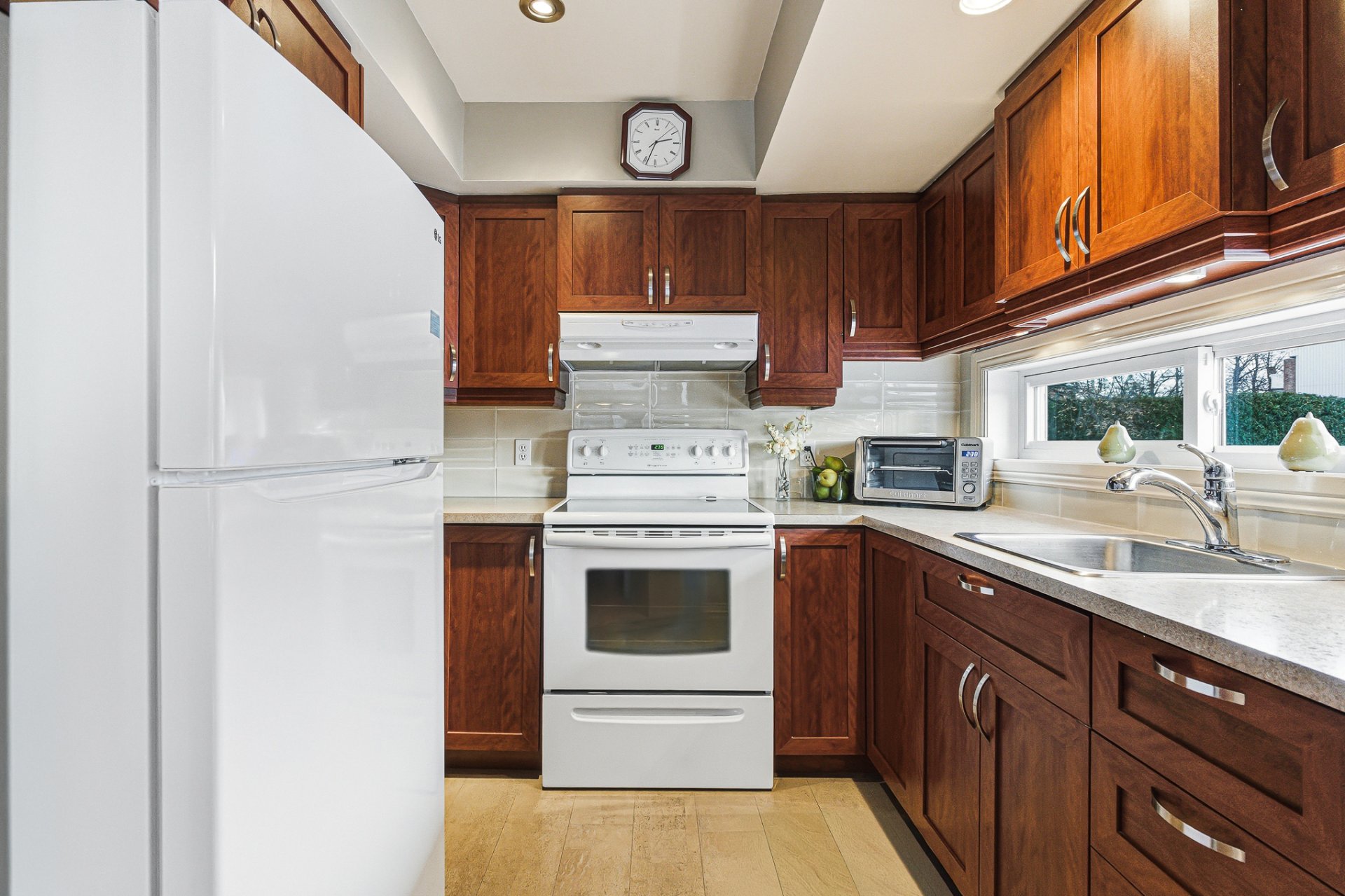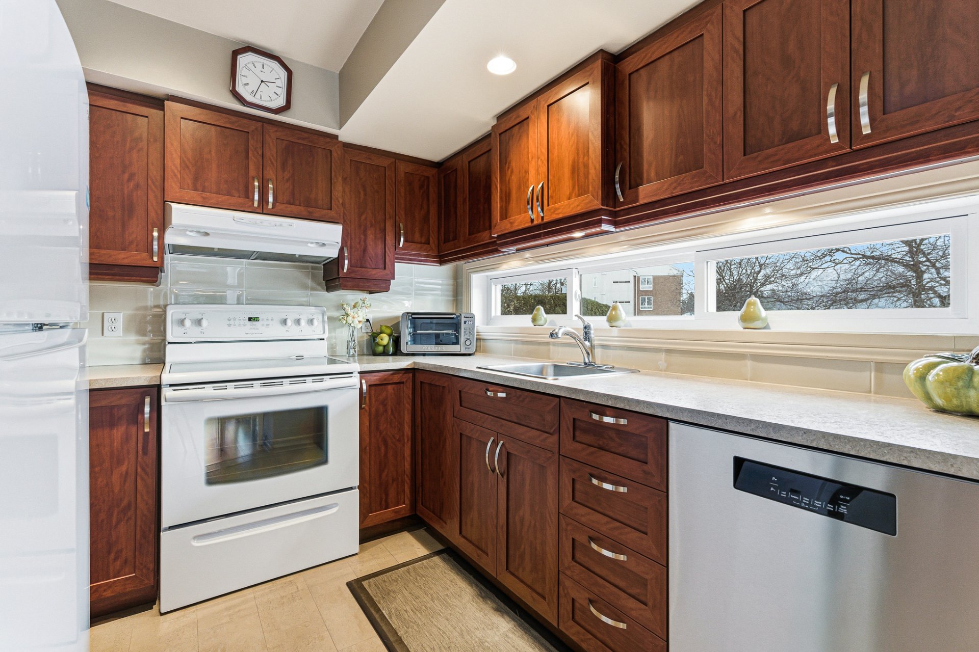 La cuisine, légèrement en retrait, profite d'une longue fenêtre horizontale qui laisse entrer une belle lumière naturelle et ajoute une touche épurée et contemporaine. Les armoires sont de belle qualité et offrent une excellente fonctionnalité.