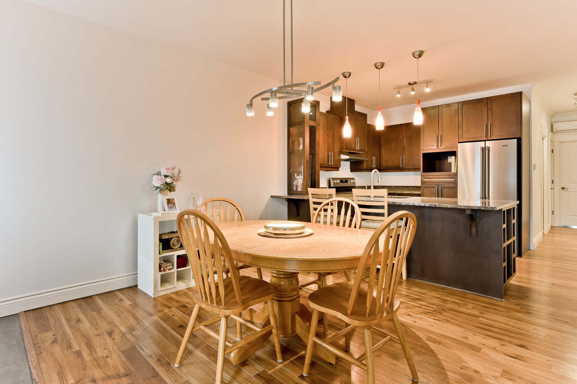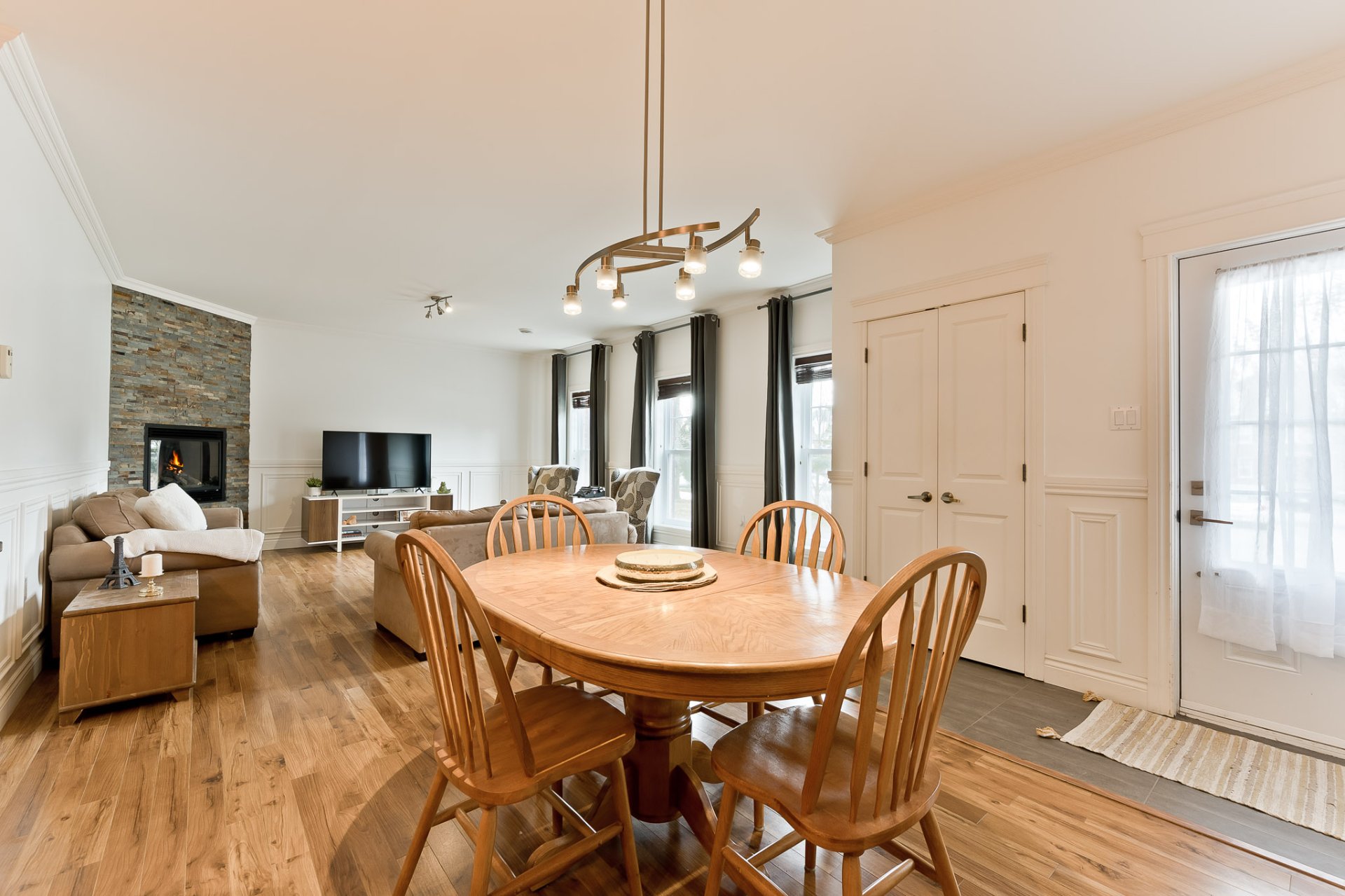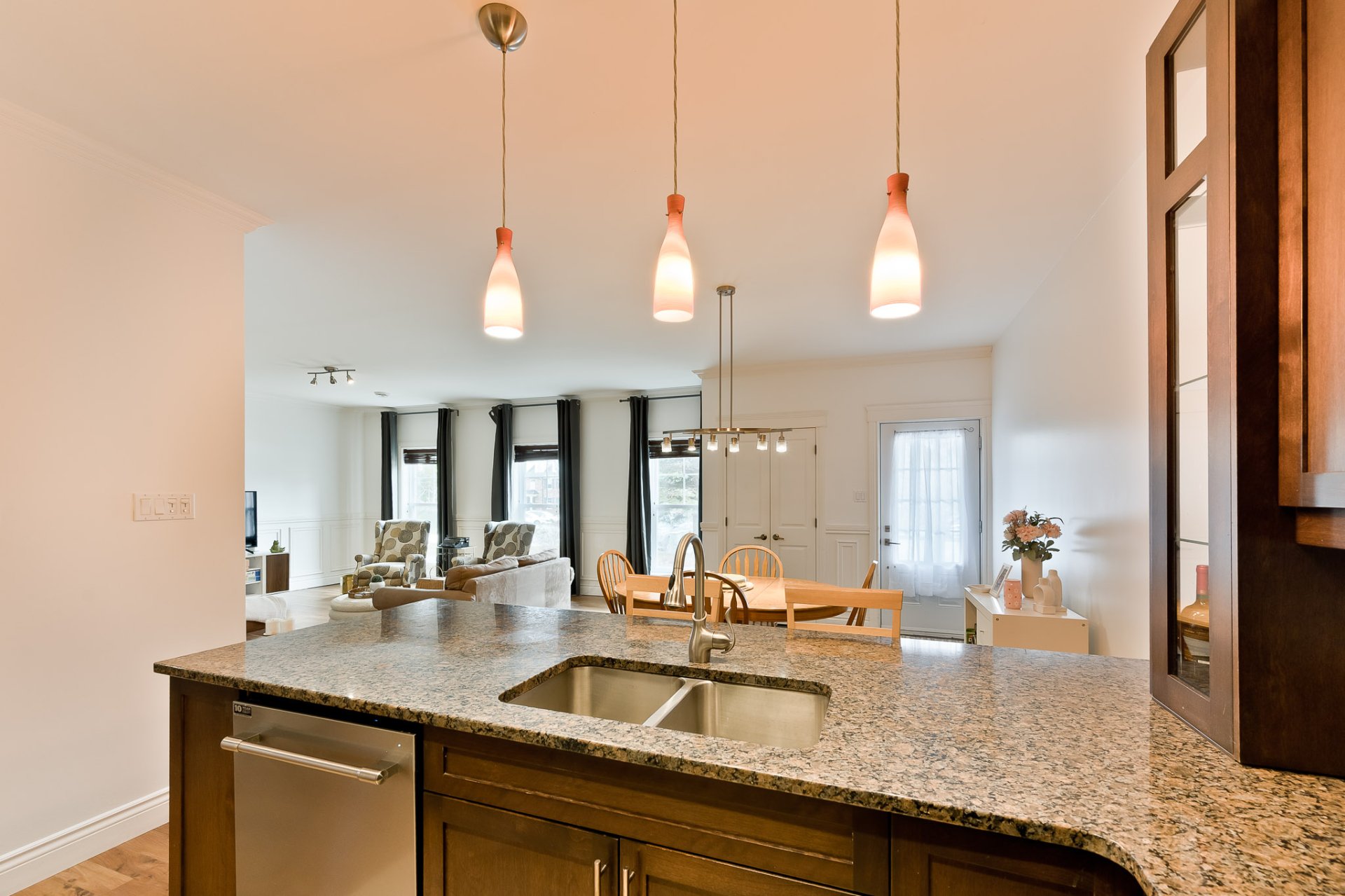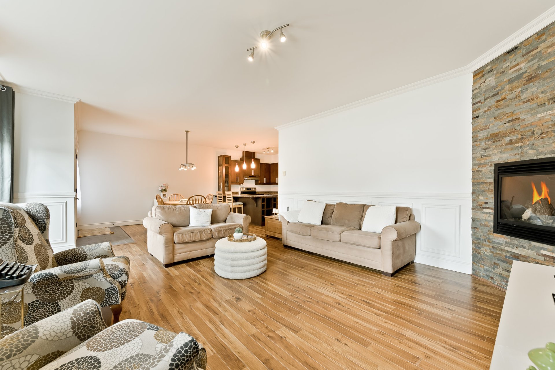 L'aire principale se déploie dans une configuration ouverte, généreuse, idéale pour la vie quotidienne comme pour recevoir. Le salon, agrémenté d'un foyer au gaz, invite à la détente dans une atmosphère chaleureuse et feutrée. La salle à manger s'intègre harmonieusement à l'ensemble, permettant des rassemblements conviviaux dans un cadre élégant. La cuisine, dotée de comptoir en granit et d'un aménagement bien pensé, propose un espace à la fois esthétique et fonctionnel, offrant de nombreux rangements et une surface de travail agréable pour cuisiner au quotidien.