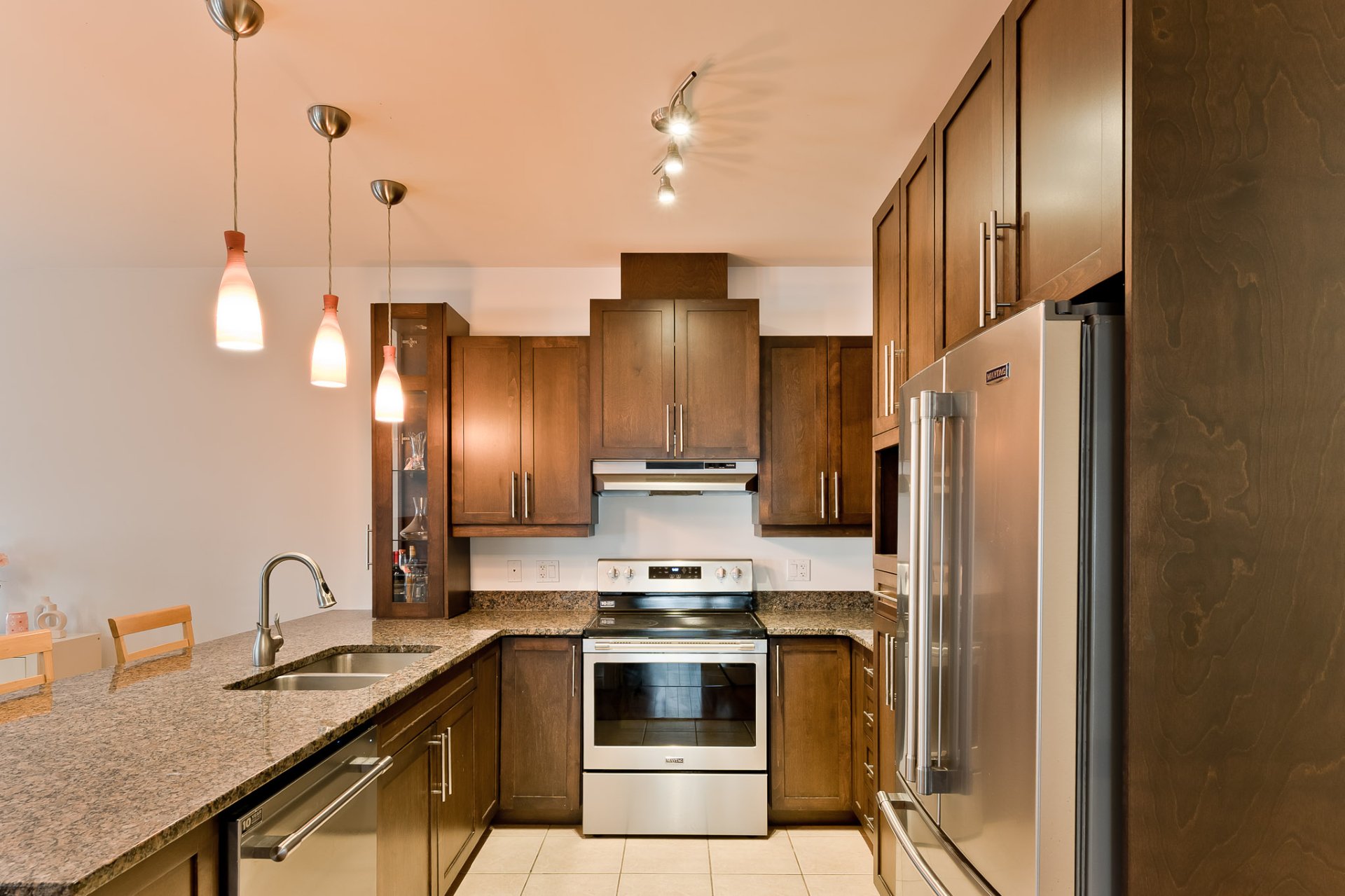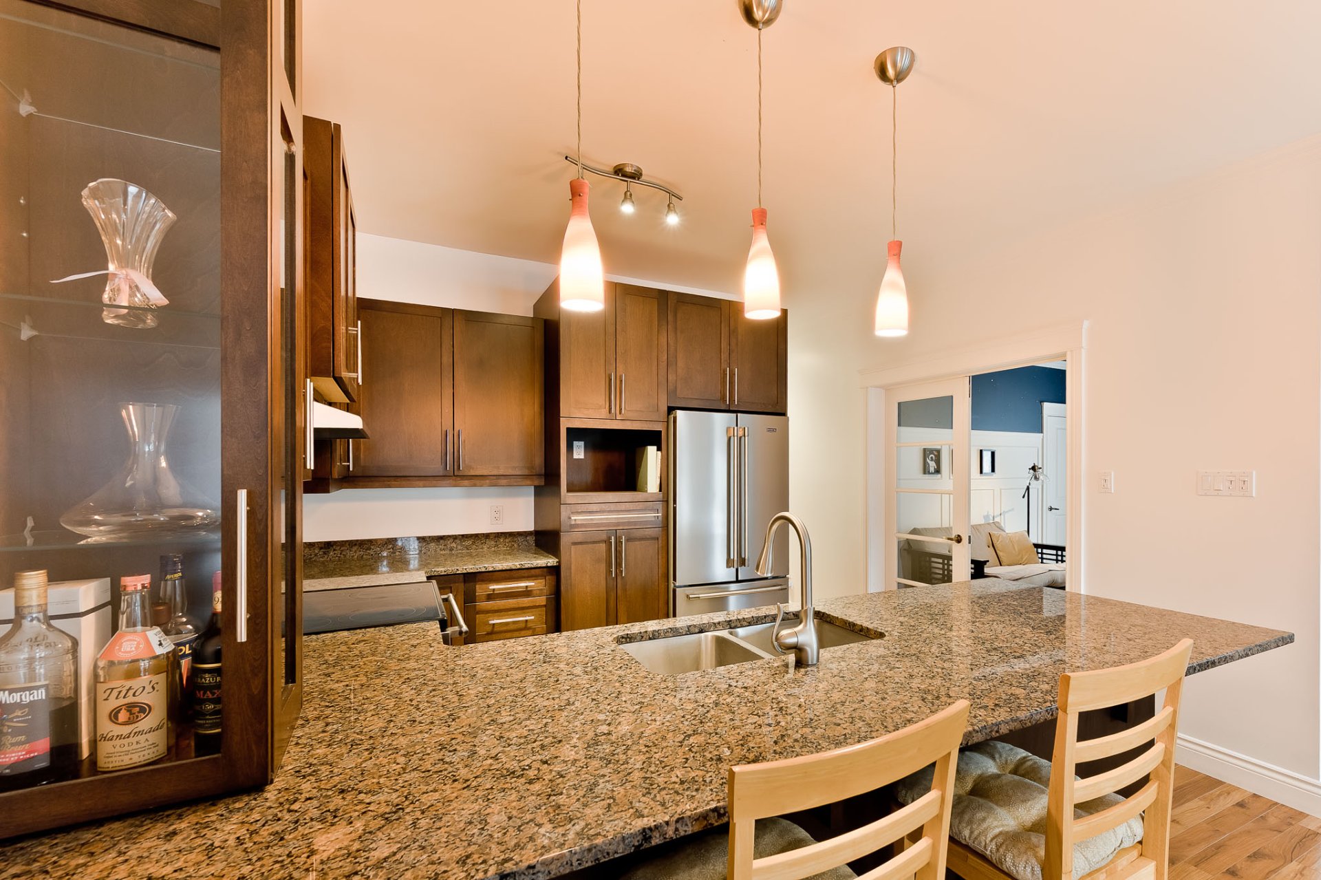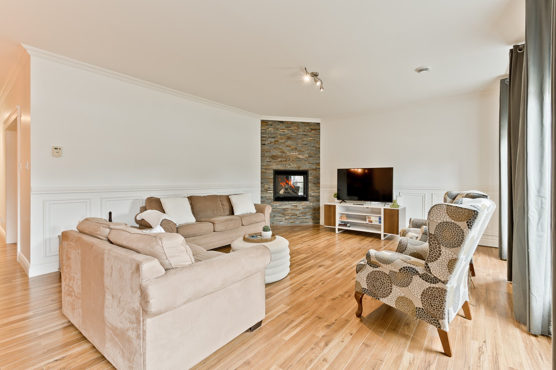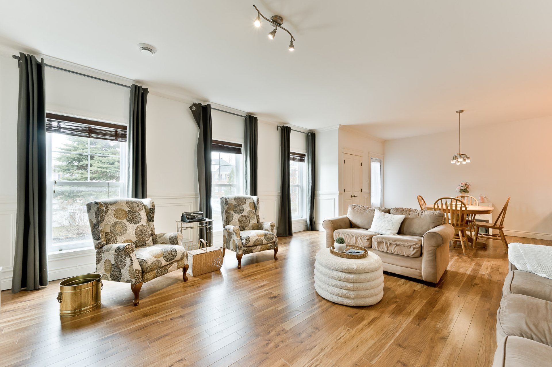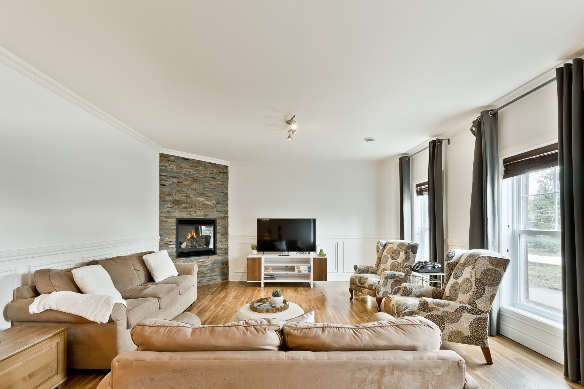 L'aire principale se déploie dans une configuration ouverte, généreuse, idéale pour la vie quotidienne comme pour recevoir. Le salon, agrémenté d'un foyer au gaz, invite à la détente dans une atmosphère chaleureuse et feutrée. La salle à manger s'intègre harmonieusement à l'ensemble, permettant des rassemblements conviviaux dans un cadre élégant. La cuisine, dotée de comptoir en granit et d'un aménagement bien pensé, propose un espace à la fois esthétique et fonctionnel, offrant de nombreux rangements et une surface de travail agréable pour cuisiner au quotidien.