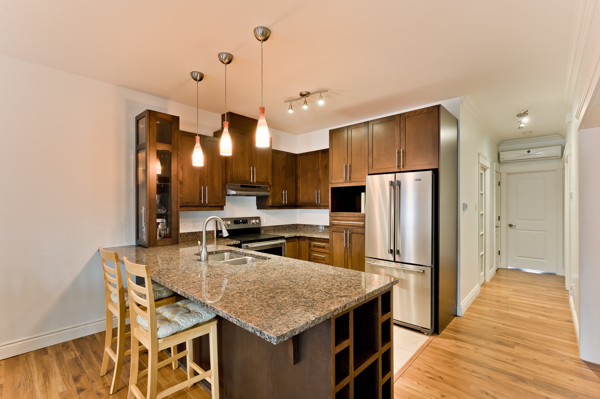 Découvrez sans attendre cette somptueuse unité de copropriété où élégance et confort s'unissent pour offrir un milieu de vie à la hauteur de vos attentes. Dès l'entrée, le souci du détail et la qualité des finitions se font sentir, créant une ambiance raffinée et accueillante. Les plafonds de neuf pieds, agrémentés de caissons, confèrent un cachet distinctif et amplifient la sensation d'espace, tout en mettant en valeur la luminosité naturelle qui baigne les pièces.