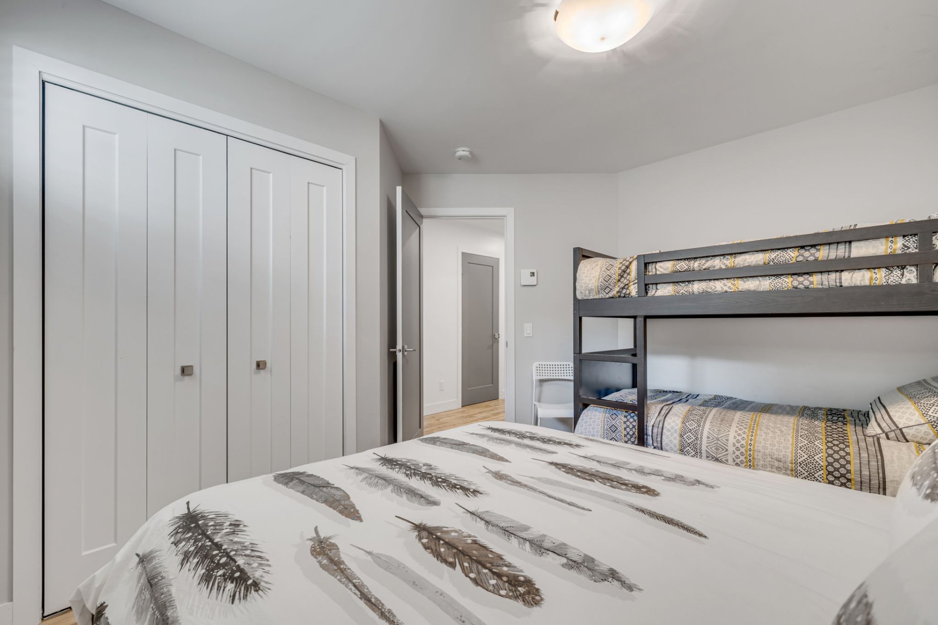 Rez-de-chaussée -- Une entrée pratique avec vestiaire sportif/mudroom vous accueille, idéale pour ranger votre équipement après une journée d'activités. Ce niveau comprend trois chambres lumineuses et une salle de bain complète, parfaite pour la famille ou les invités.