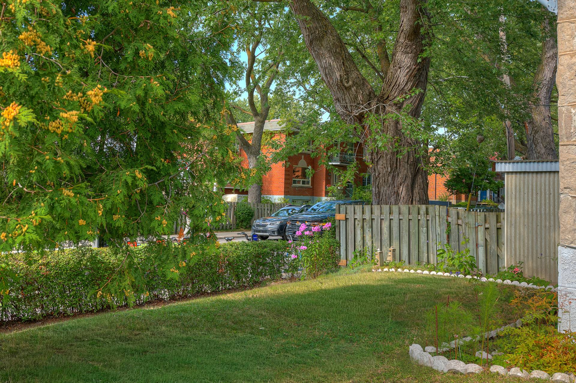 Un grand terrain de ± 3 800 pi² avec cour clôturée et grand jardin paysager.