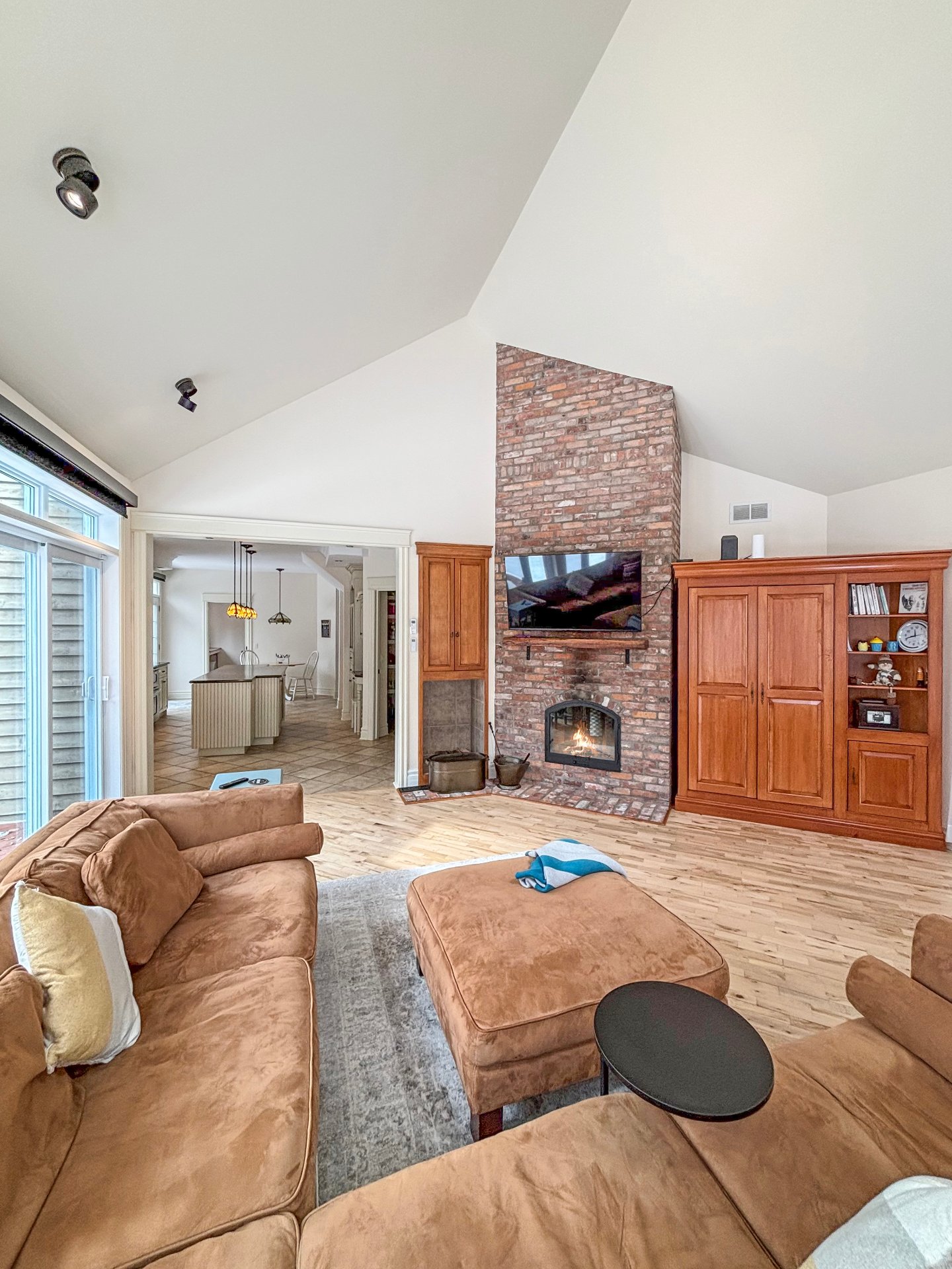 Le rez-de-chaussée a été conçu pour allier confort et convivialité. La salle à manger accueillante est agrémentée d'un foyer au bois double face pour une ambiance chaleureuse. La cuisine, avec îlot central, armoires en bois pleine hauteur et finitions haut de gamme, offre un espace fonctionnel et ergonomique. Le salon lumineux et convivial est sublimé par des plafonds cathédrale, une lumière naturelle abondante et un foyer au bois, parfait pour les moments en famille. Un espace pratique et optimisé comprenant une entrée secondaire avec rangement intégré, un bureau fermé, une salle de lavage et une salle d'eau facilite le quotidien.