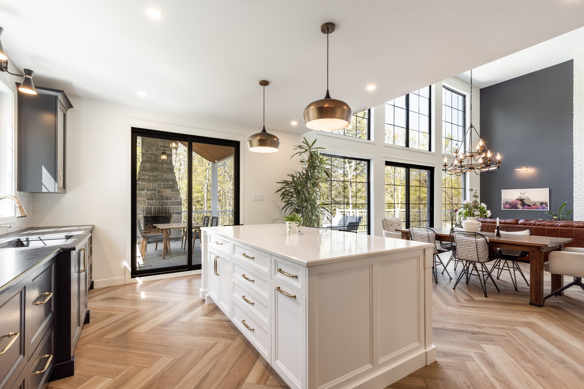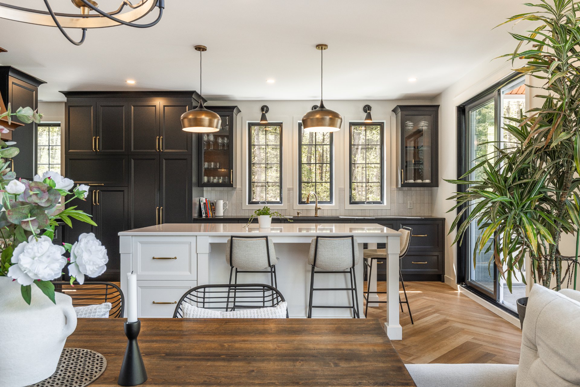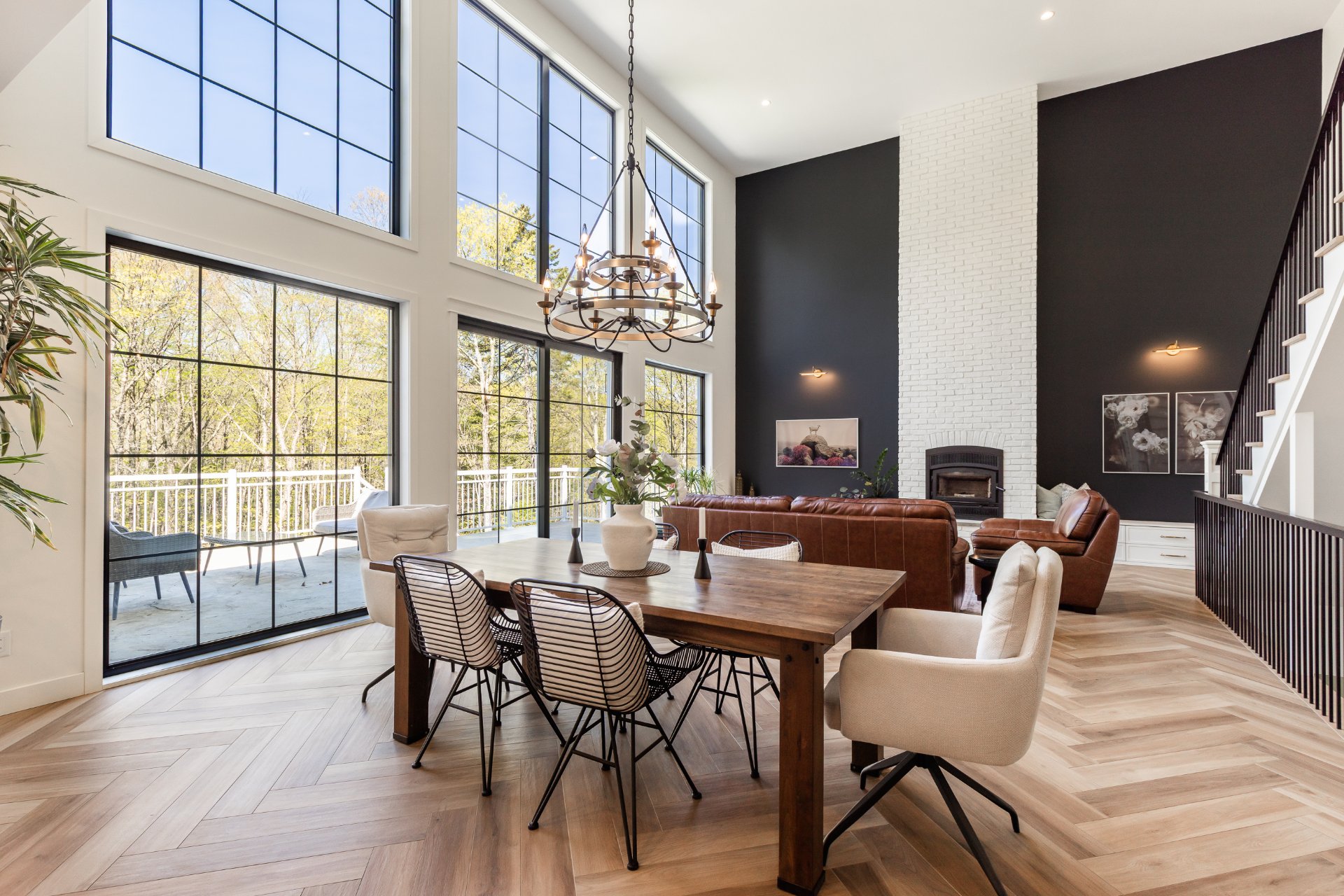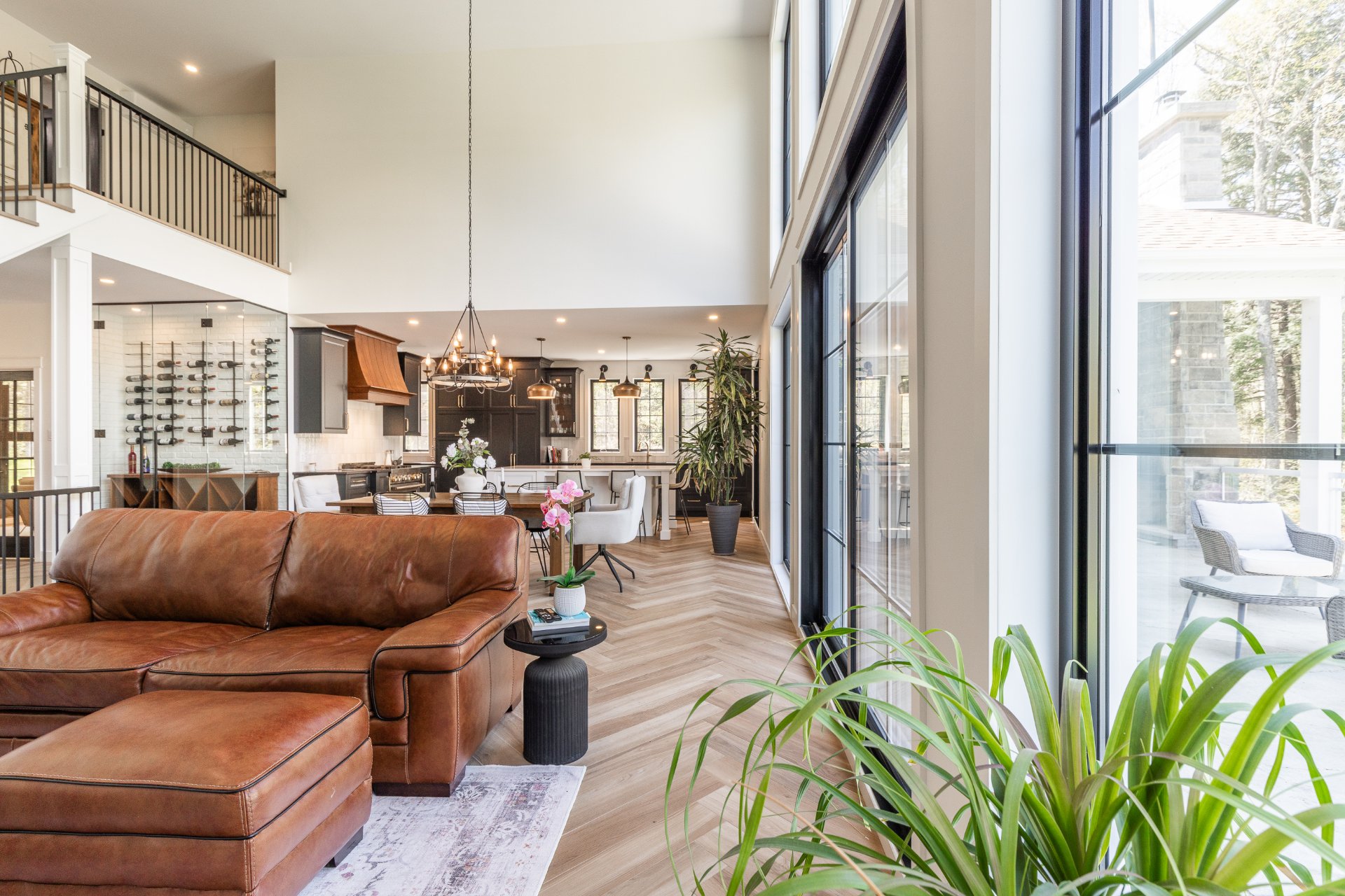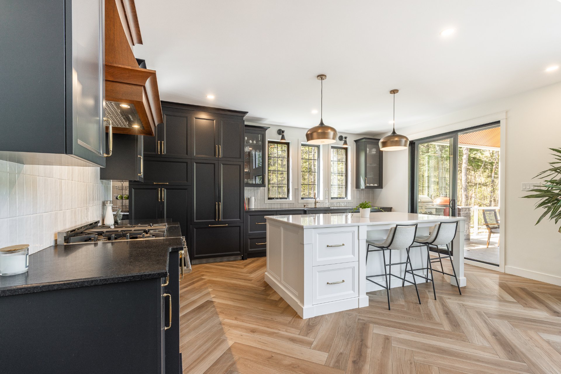 Dès l'entrée, le ton est donné : superbe céramique en chevron au rez-de-chaussée, grande fenestration offrant une luminosité naturelle abondante et une touche contemporaine. Un mur de brique faisant office de cellier lie l'entrée à la cuisine. Le salon, avec son haut plafond, dégage une impression d'espace et de grandeur. La cuisine gourmet est équipée d'un vaste îlot/comptoir lunch, de comptoirs en quartz et d'armoires Shaker pleine hauteur. Une pratique cuisine de service attenante ajoute fonctionnalité et rangement.