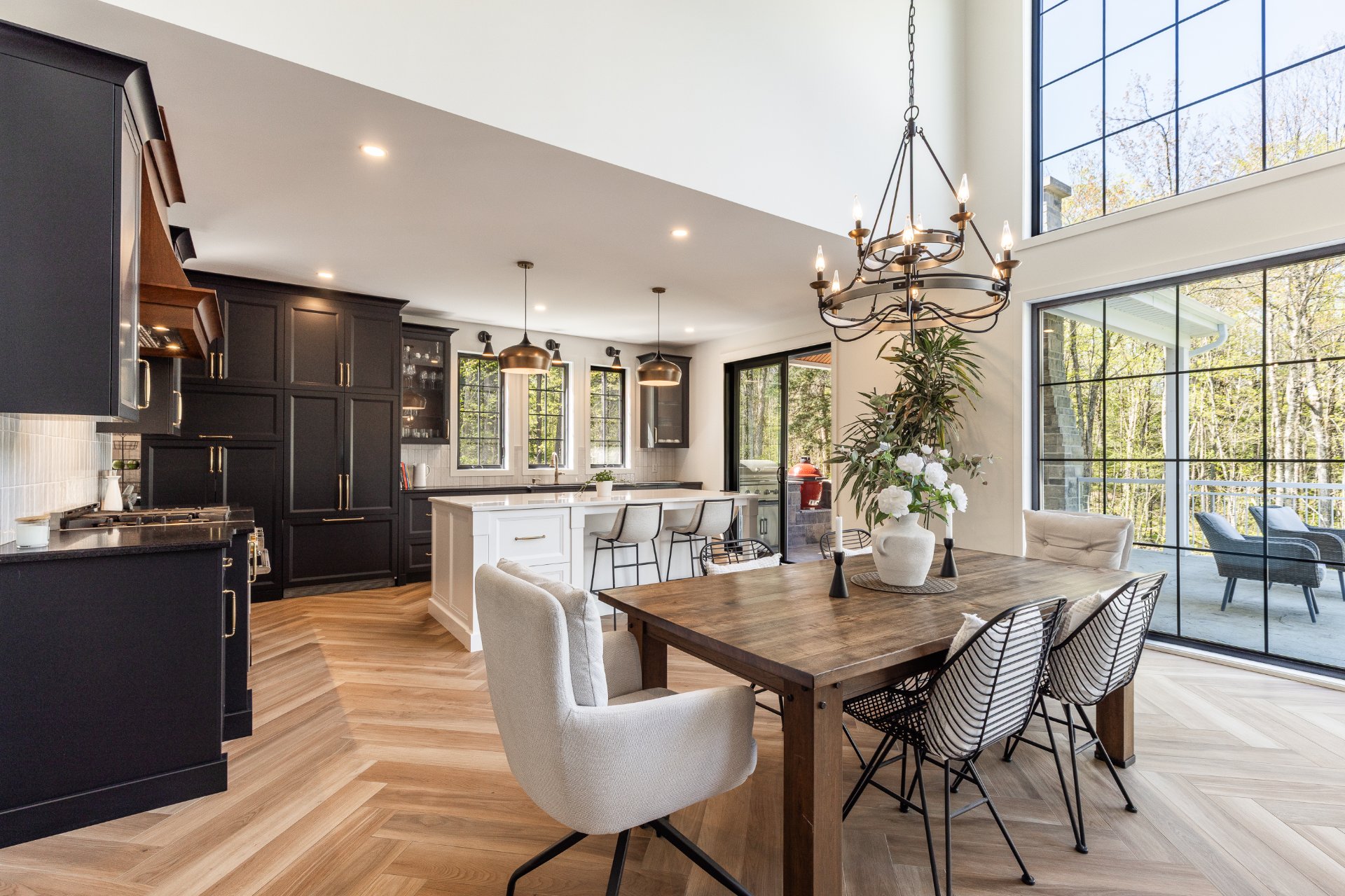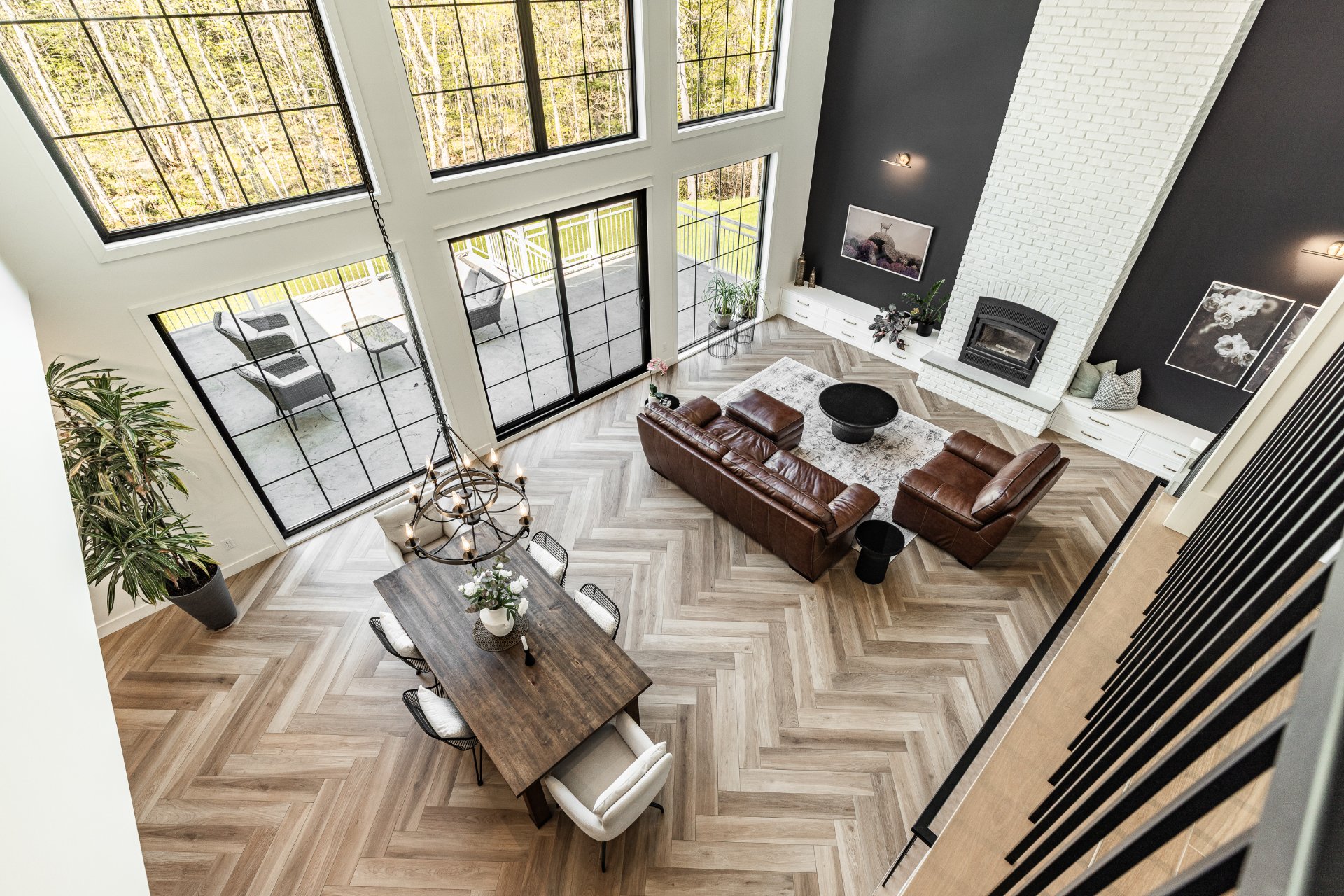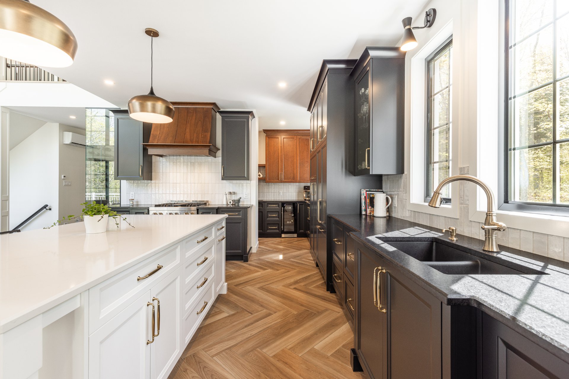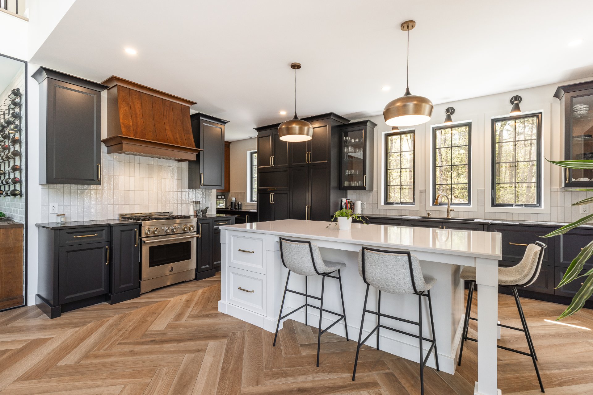Dès l'entrée, le ton est donné : superbe céramique en chevron au rez-de-chaussée, grande fenestration offrant une luminosité naturelle abondante et une touche contemporaine. Un mur de brique faisant office de cellier lie l'entrée à la cuisine. Le salon, avec son haut plafond, dégage une impression d'espace et de grandeur. La cuisine gourmet est équipée d'un vaste îlot/comptoir lunch, de comptoirs en quartz et d'armoires Shaker pleine hauteur. Une pratique cuisine de service attenante ajoute fonctionnalité et rangement.