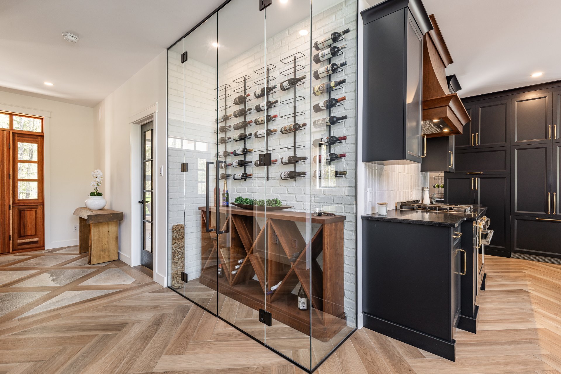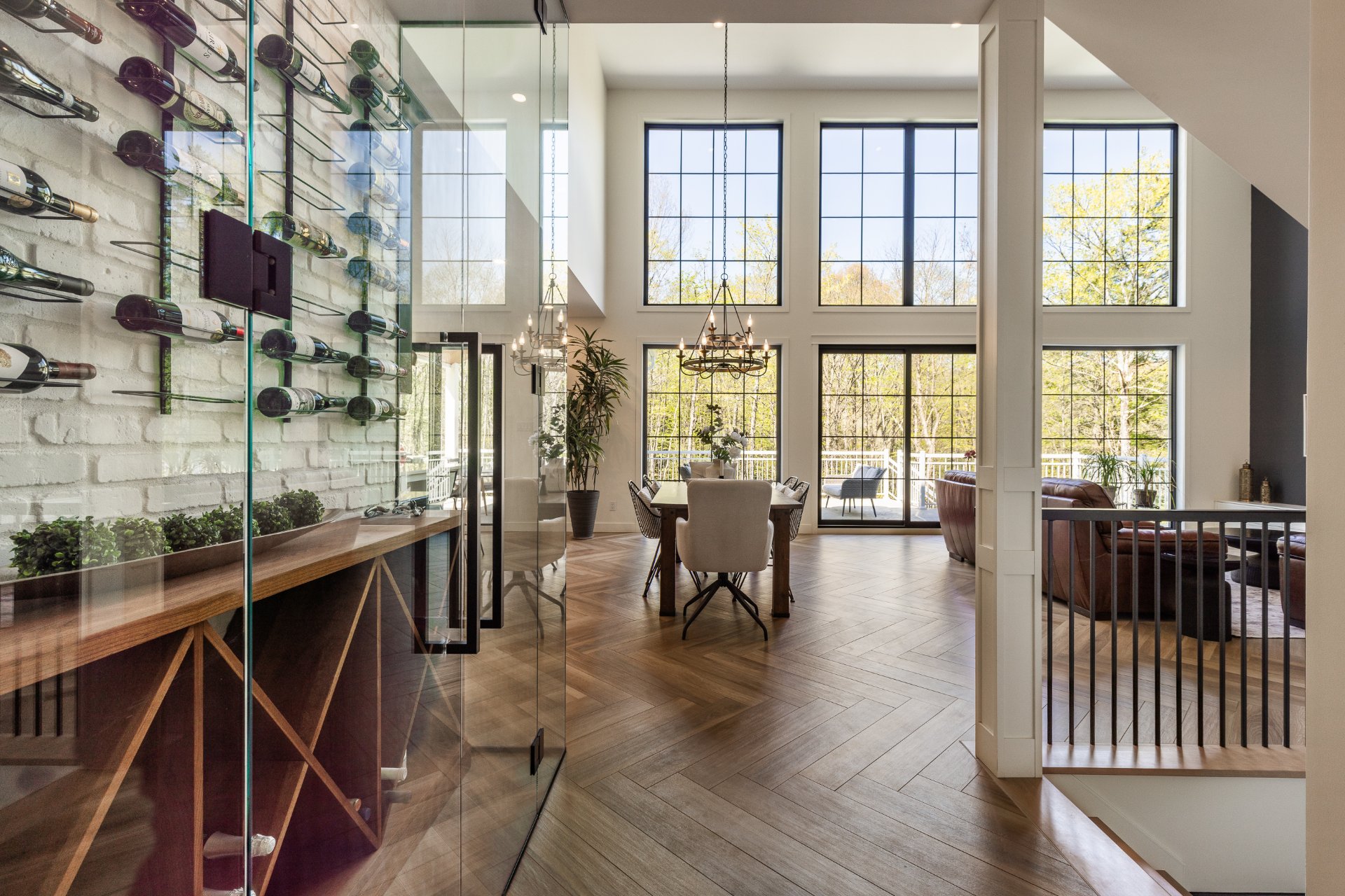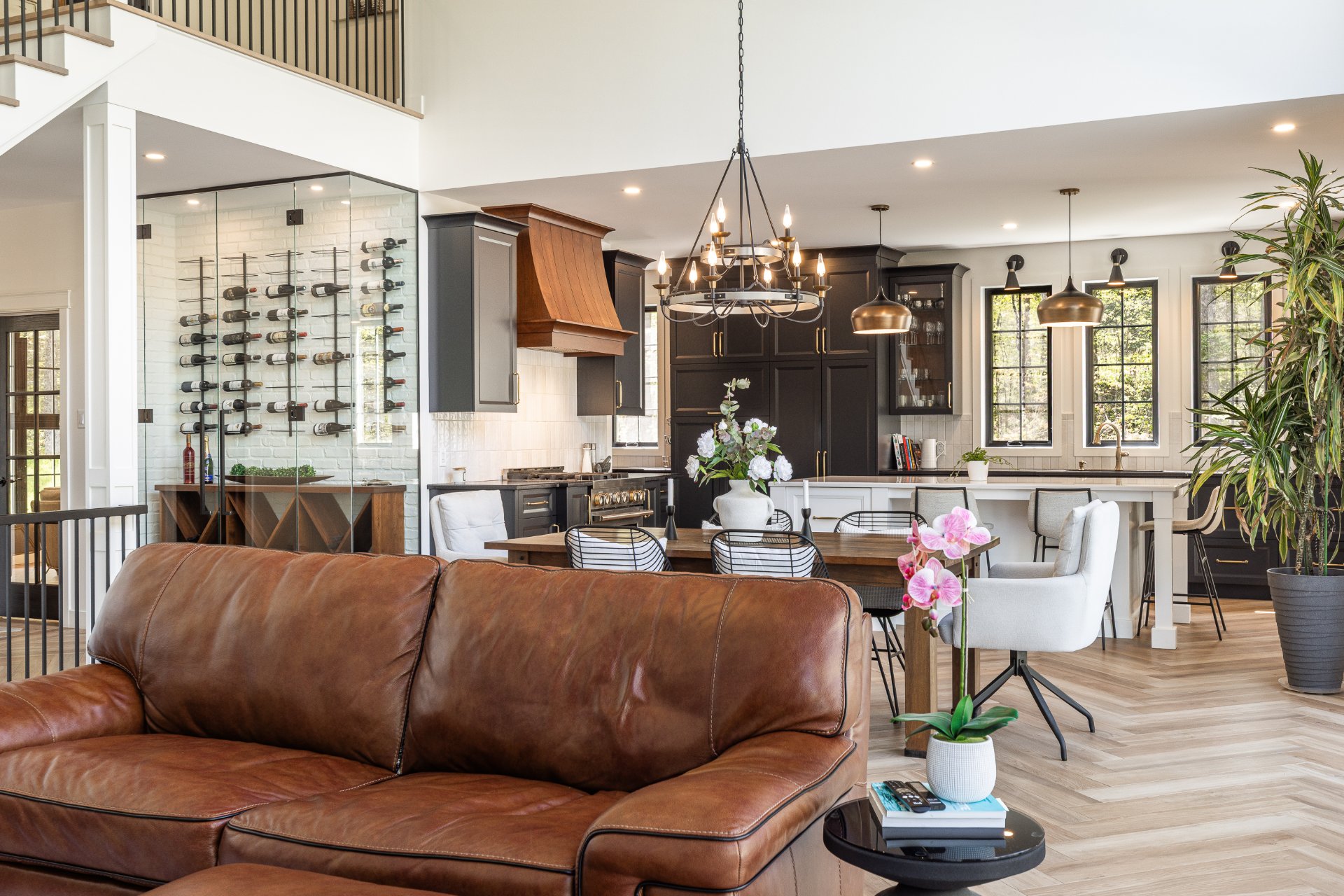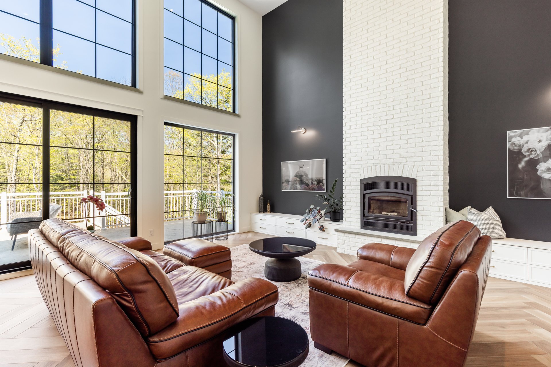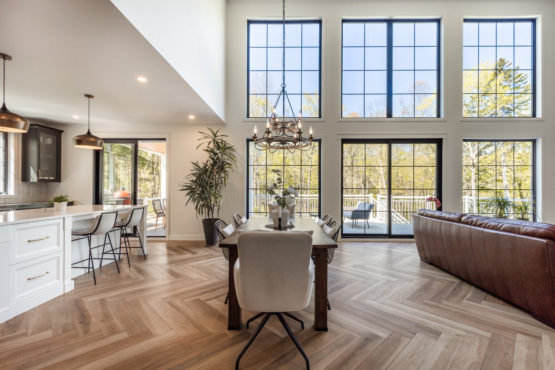 Dès l'entrée, le ton est donné : superbe céramique en chevron au rez-de-chaussée, grande fenestration offrant une luminosité naturelle abondante et une touche contemporaine. Un mur de brique faisant office de cellier lie l'entrée à la cuisine. Le salon, avec son haut plafond, dégage une impression d'espace et de grandeur. La cuisine gourmet est équipée d'un vaste îlot/comptoir lunch, de comptoirs en quartz et d'armoires Shaker pleine hauteur. Une pratique cuisine de service attenante ajoute fonctionnalité et rangement.