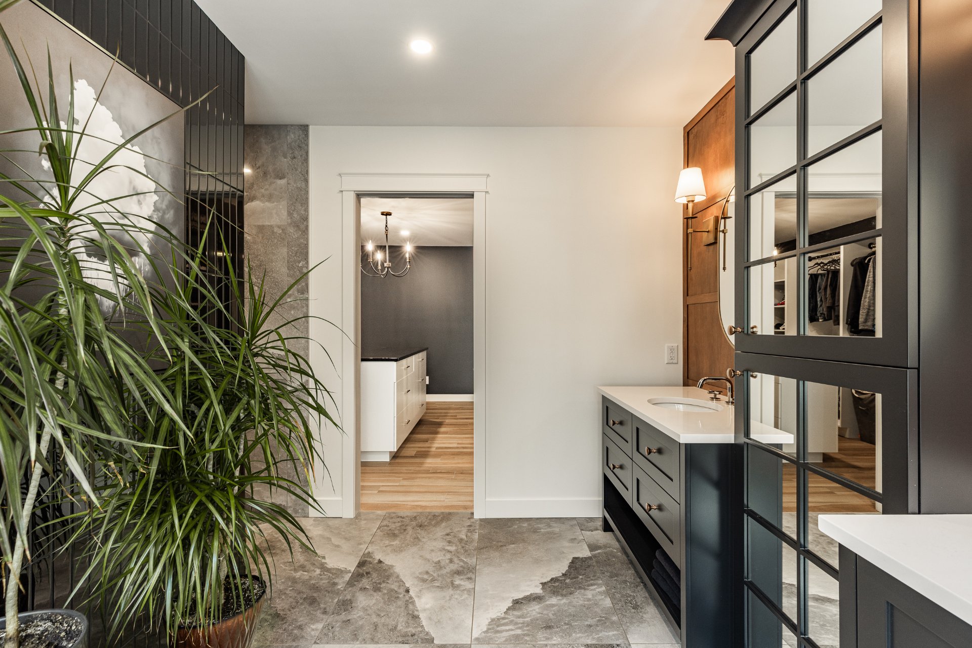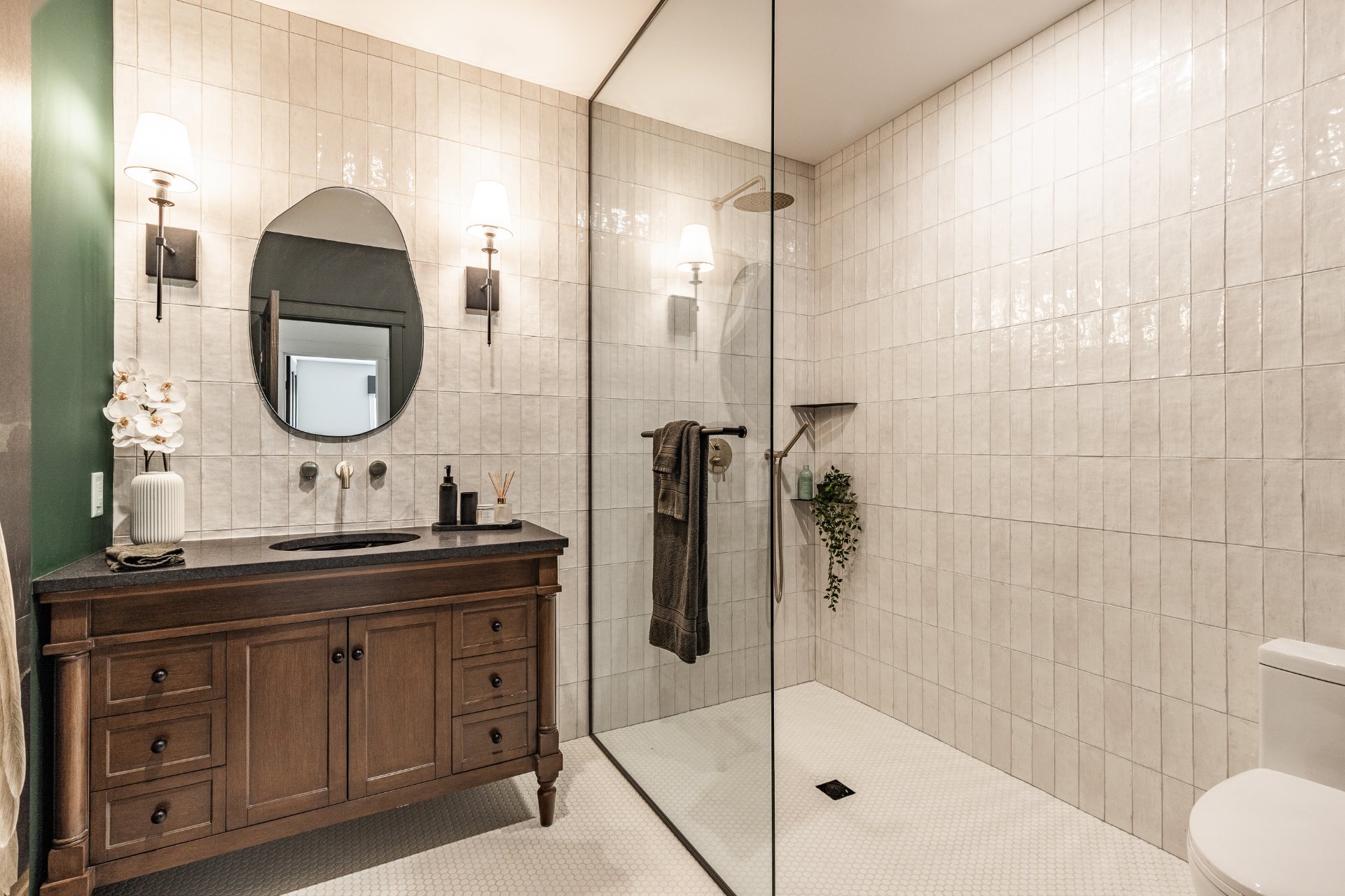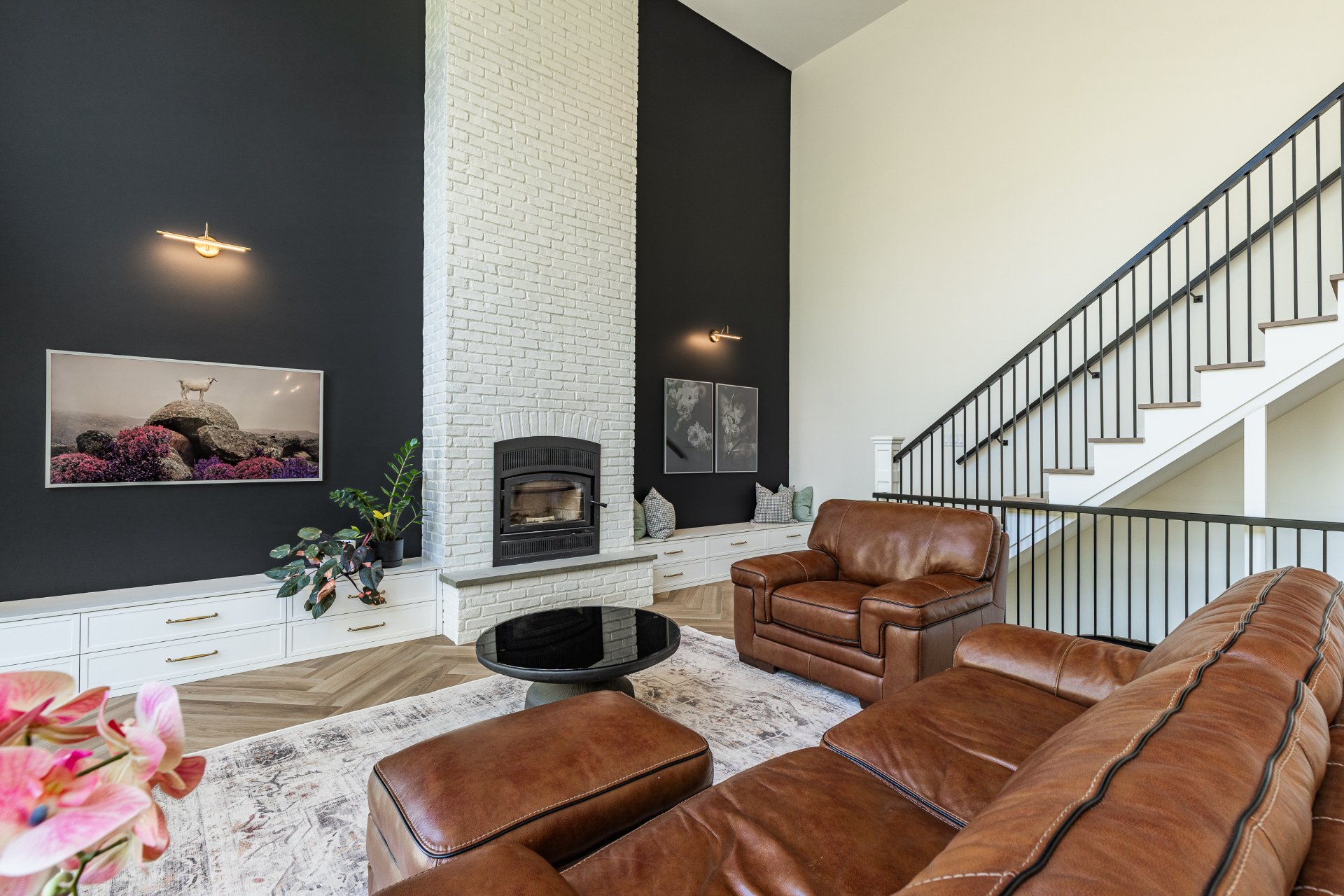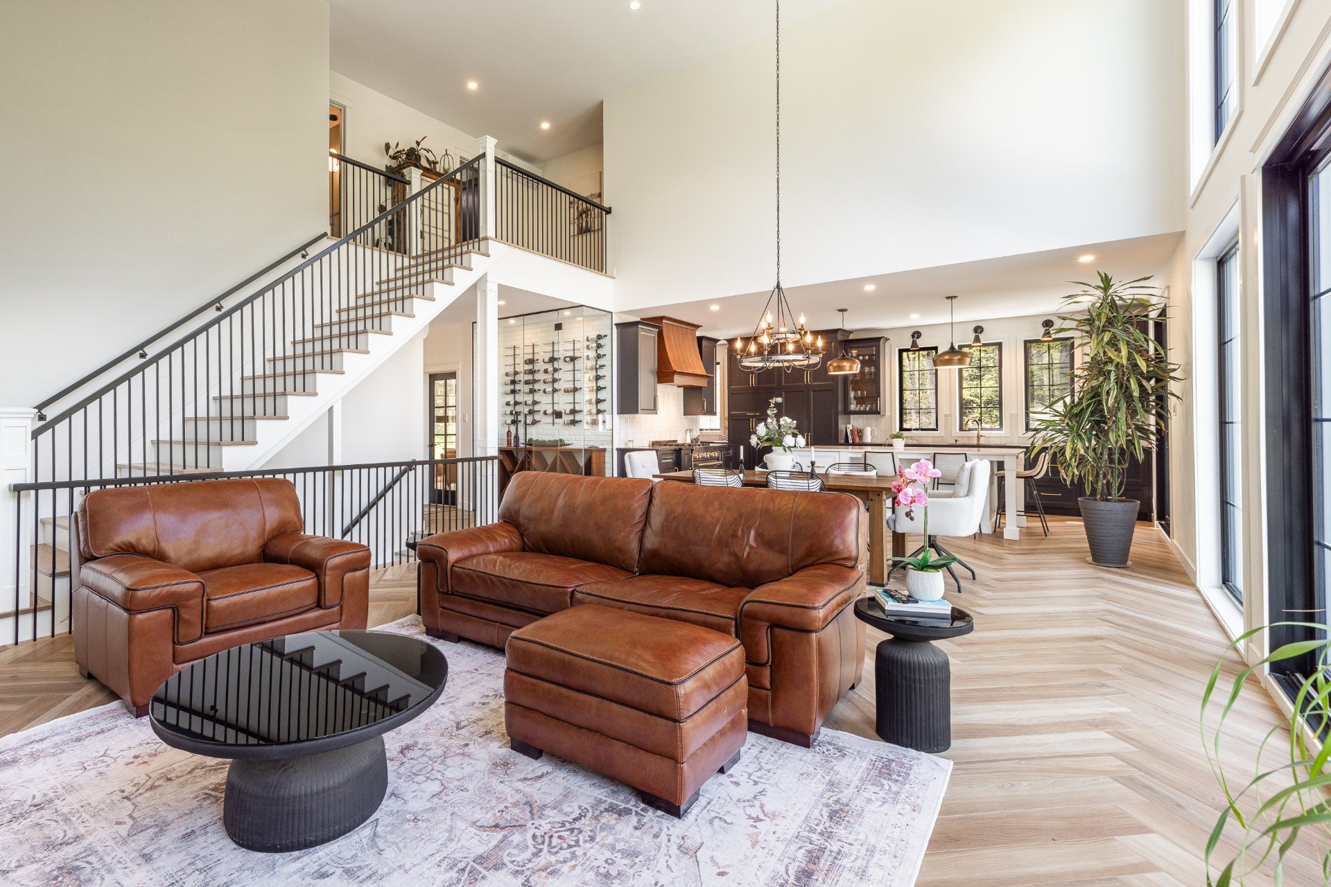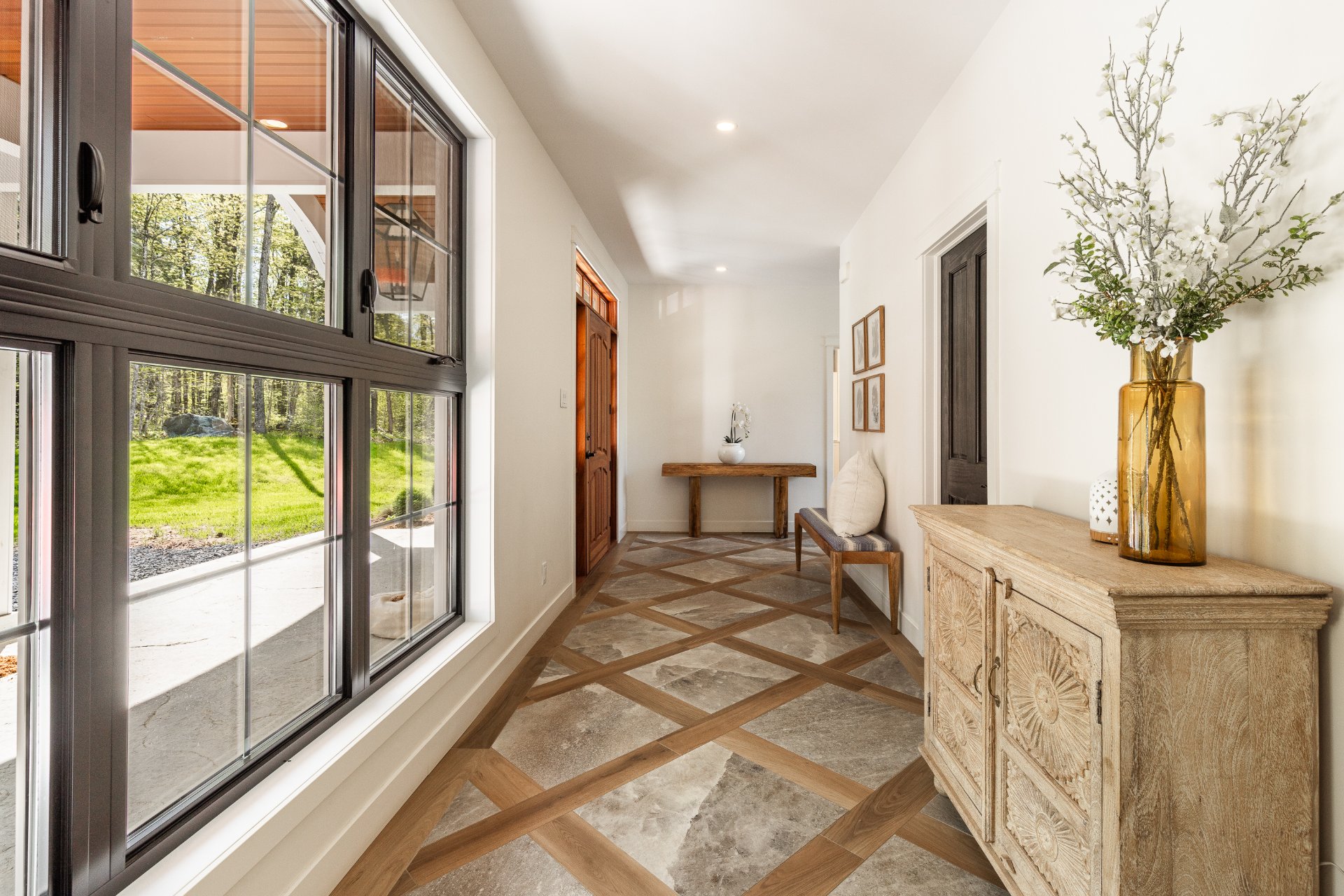 Dès l'entrée, le ton est donné : superbe céramique en chevron au rez-de-chaussée, grande fenestration offrant une luminosité naturelle abondante et une touche contemporaine. Un mur de brique faisant office de cellier lie l'entrée à la cuisine. Le salon, avec son haut plafond, dégage une impression d'espace et de grandeur. La cuisine gourmet est équipée d'un vaste îlot/comptoir lunch, de comptoirs en quartz et d'armoires Shaker pleine hauteur. Une pratique cuisine de service attenante ajoute fonctionnalité et rangement.