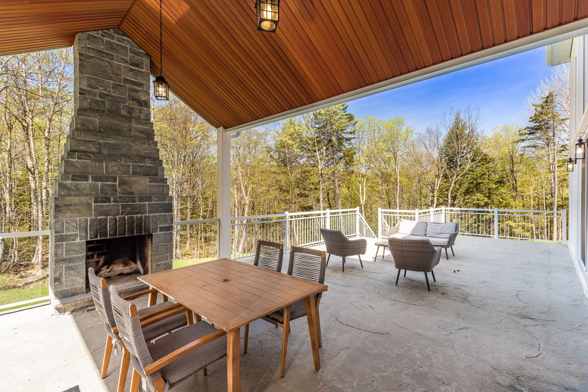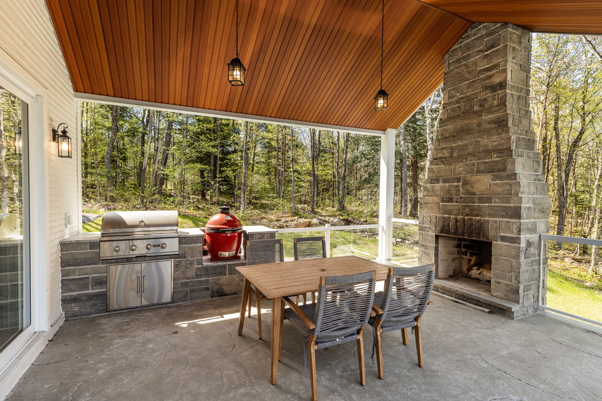 L'aire de vie s'ouvre sur une terrasse couverte avec foyer au bois et cuisine extérieure, parfaite pour les réceptions ou les soirées détente.